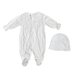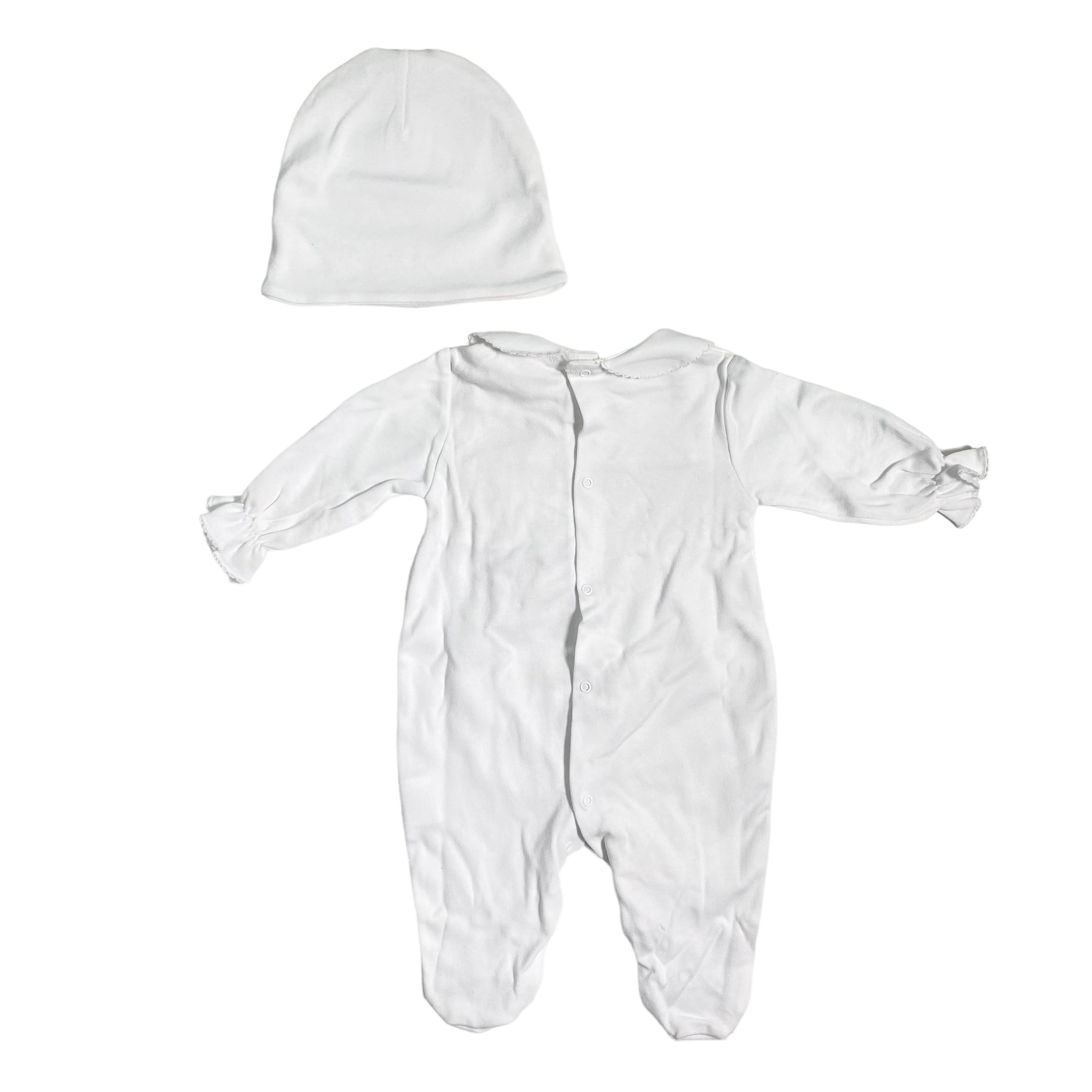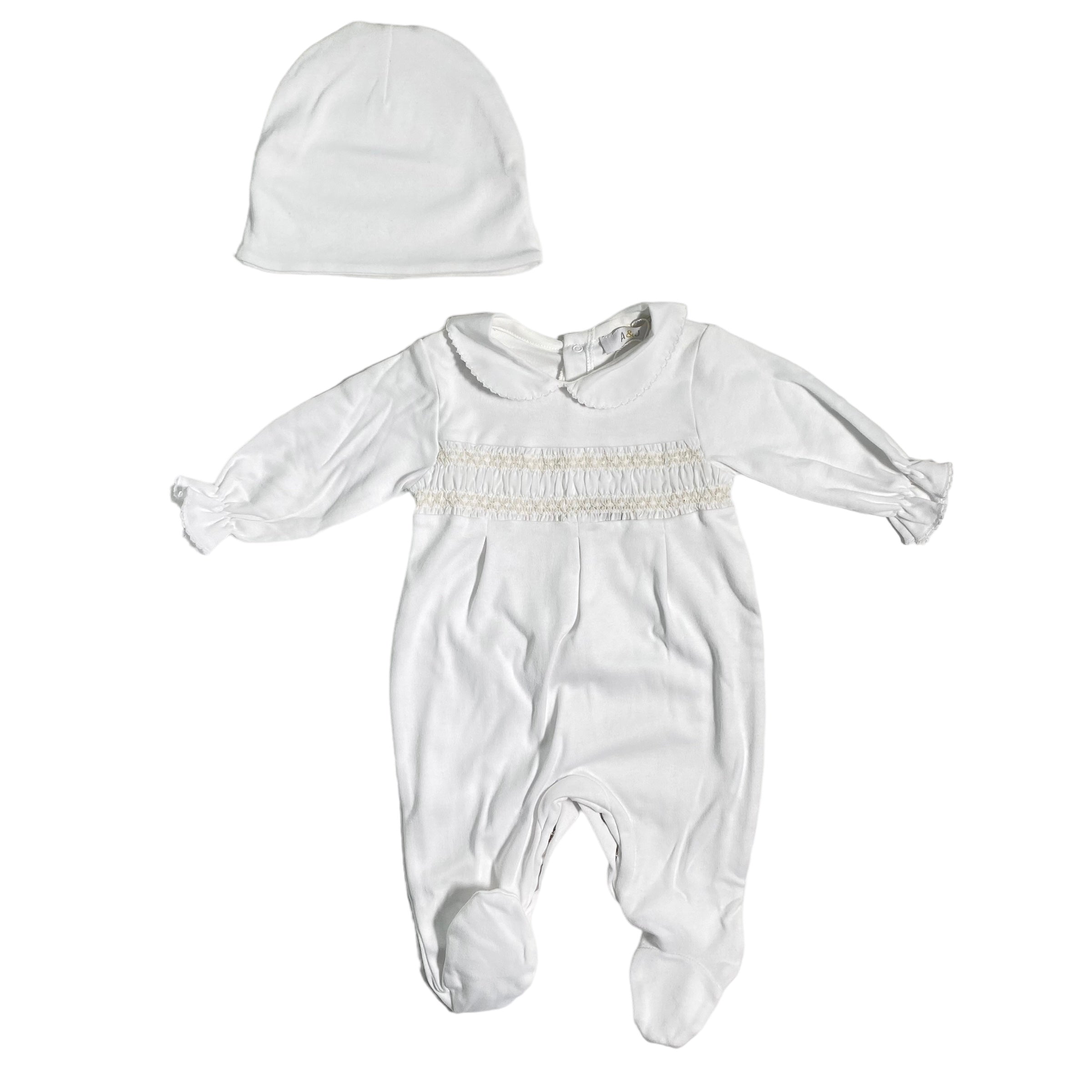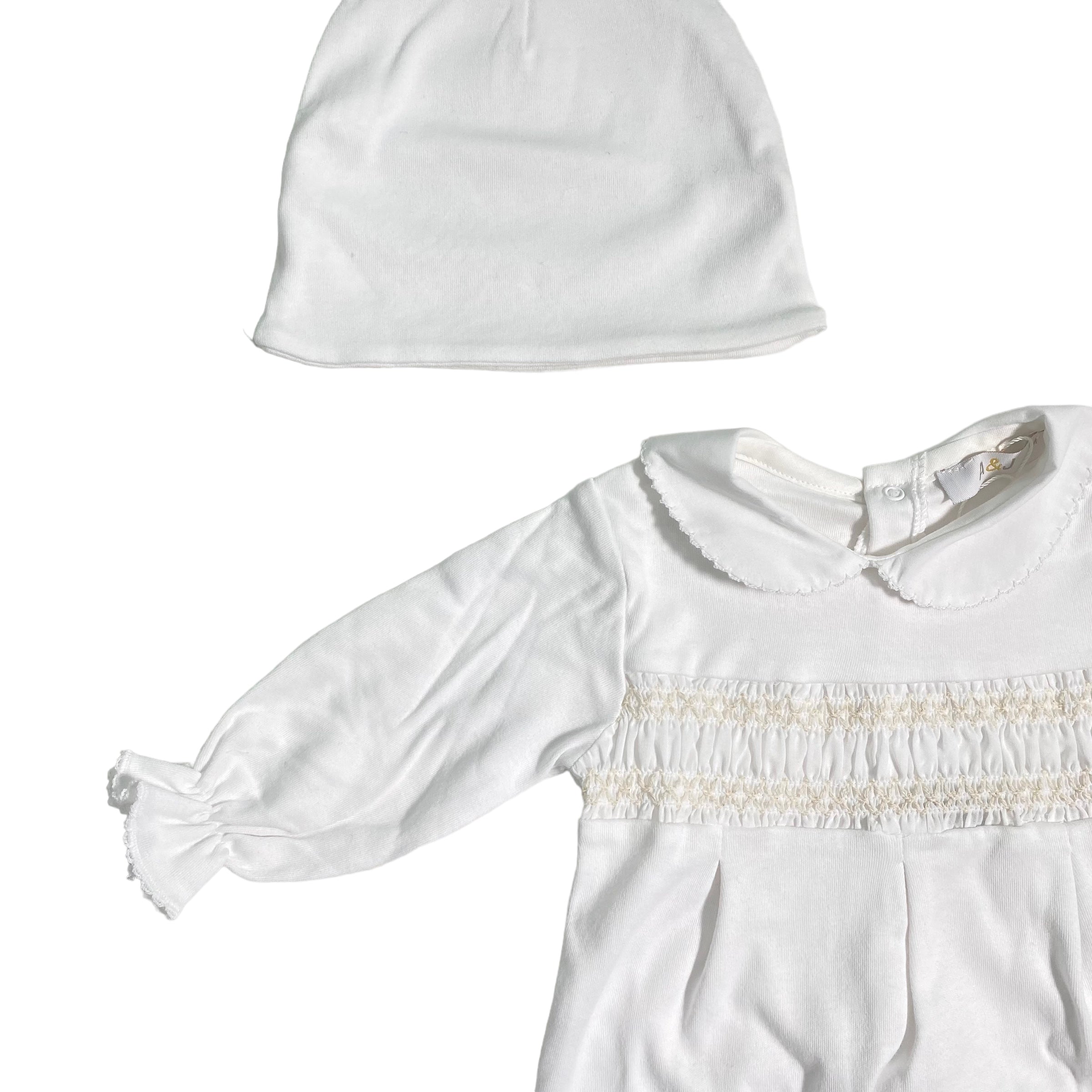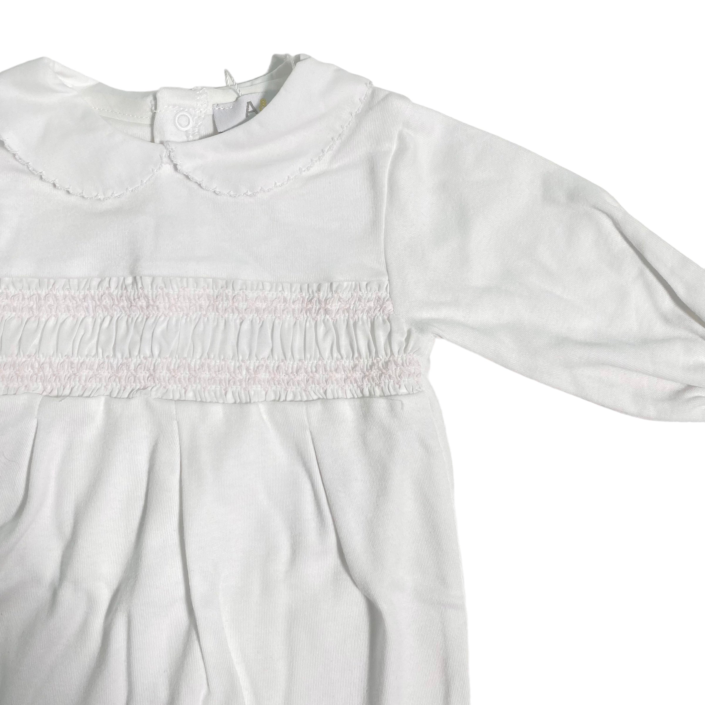 Tutina intera in cotone bianca, con punto smoke sul petto.
