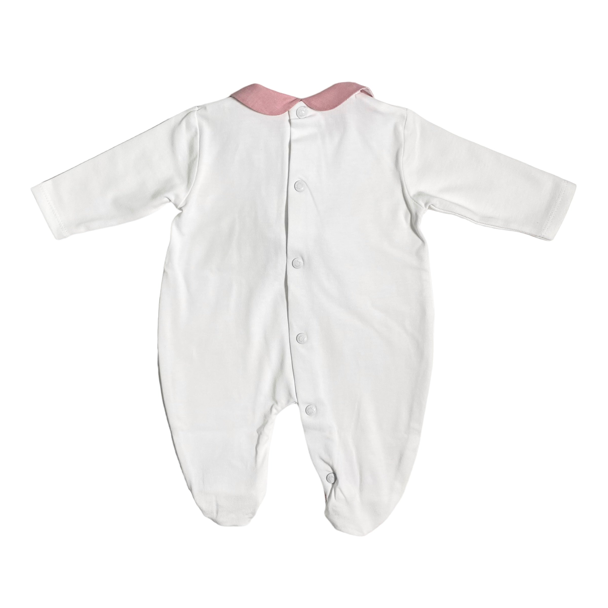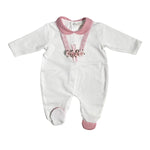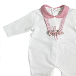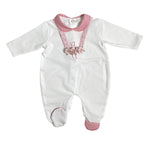 Tutina intera in cotone, con inserti in lino, e applicazione di fiori.