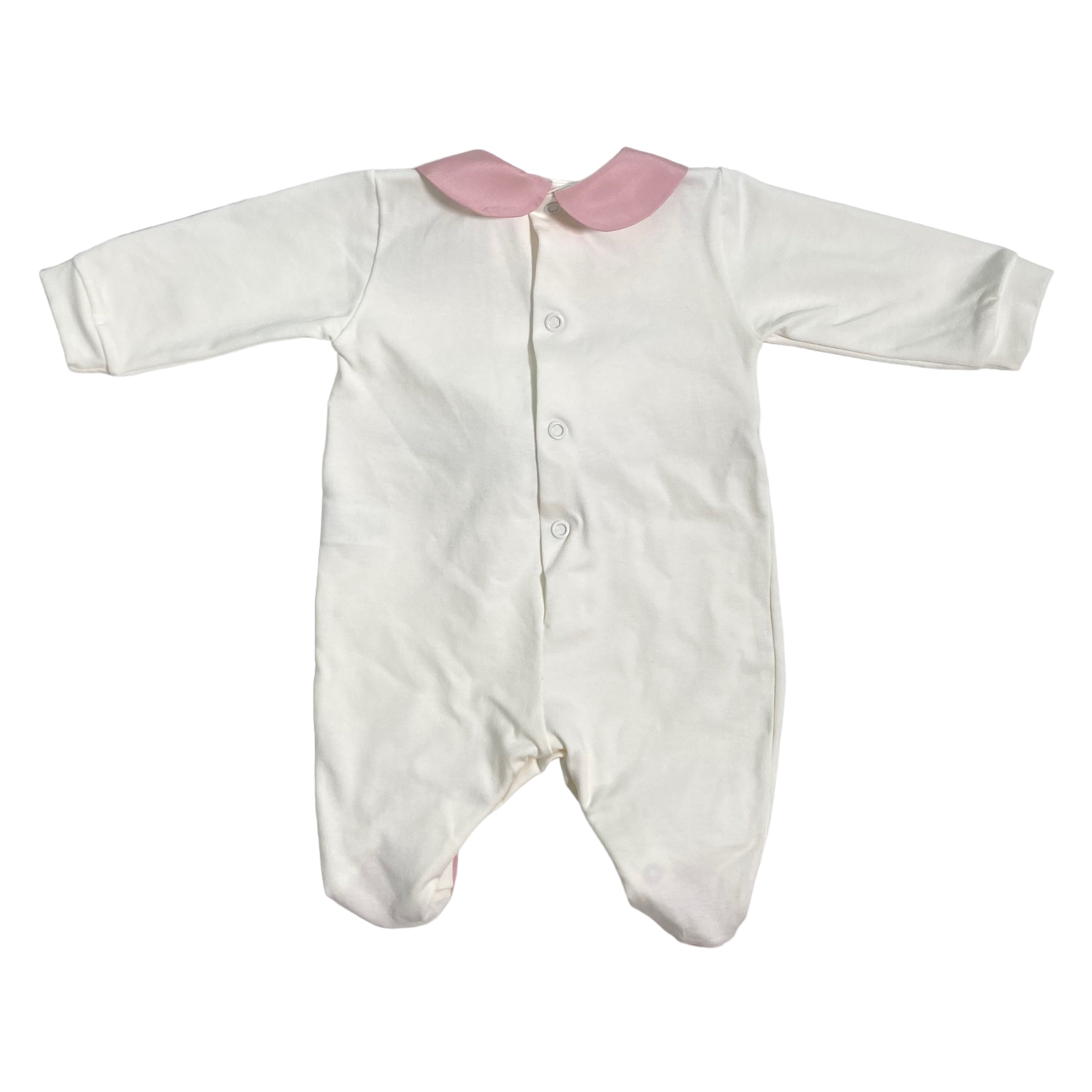Tutina intera in cotone, in tinta unita panna, con applicazione sul petto di organza in fantasia floreale.