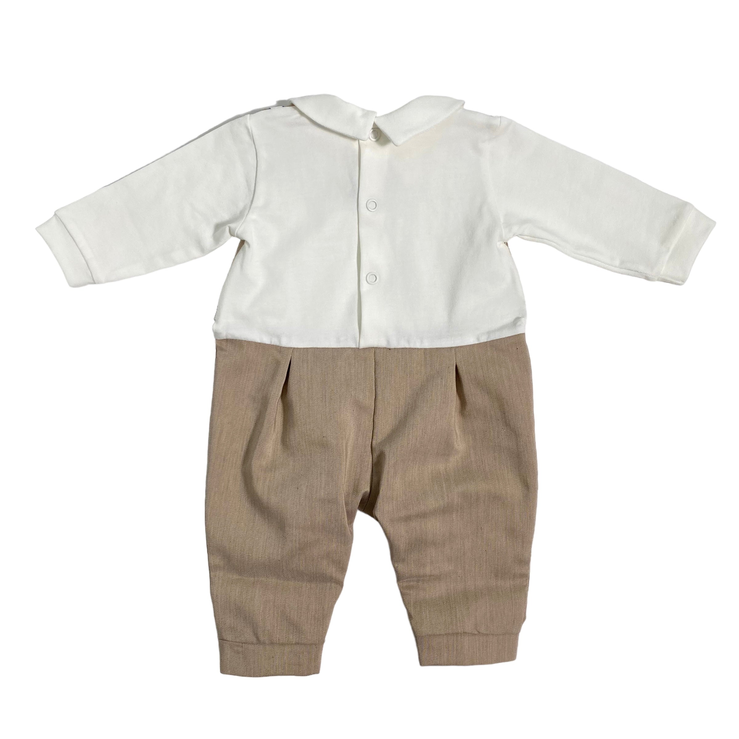 Tutina intera in cotone, con parte sottostante in tinta unita beige e parte superiore panna, con applicazione di finto panciotto e papillon.