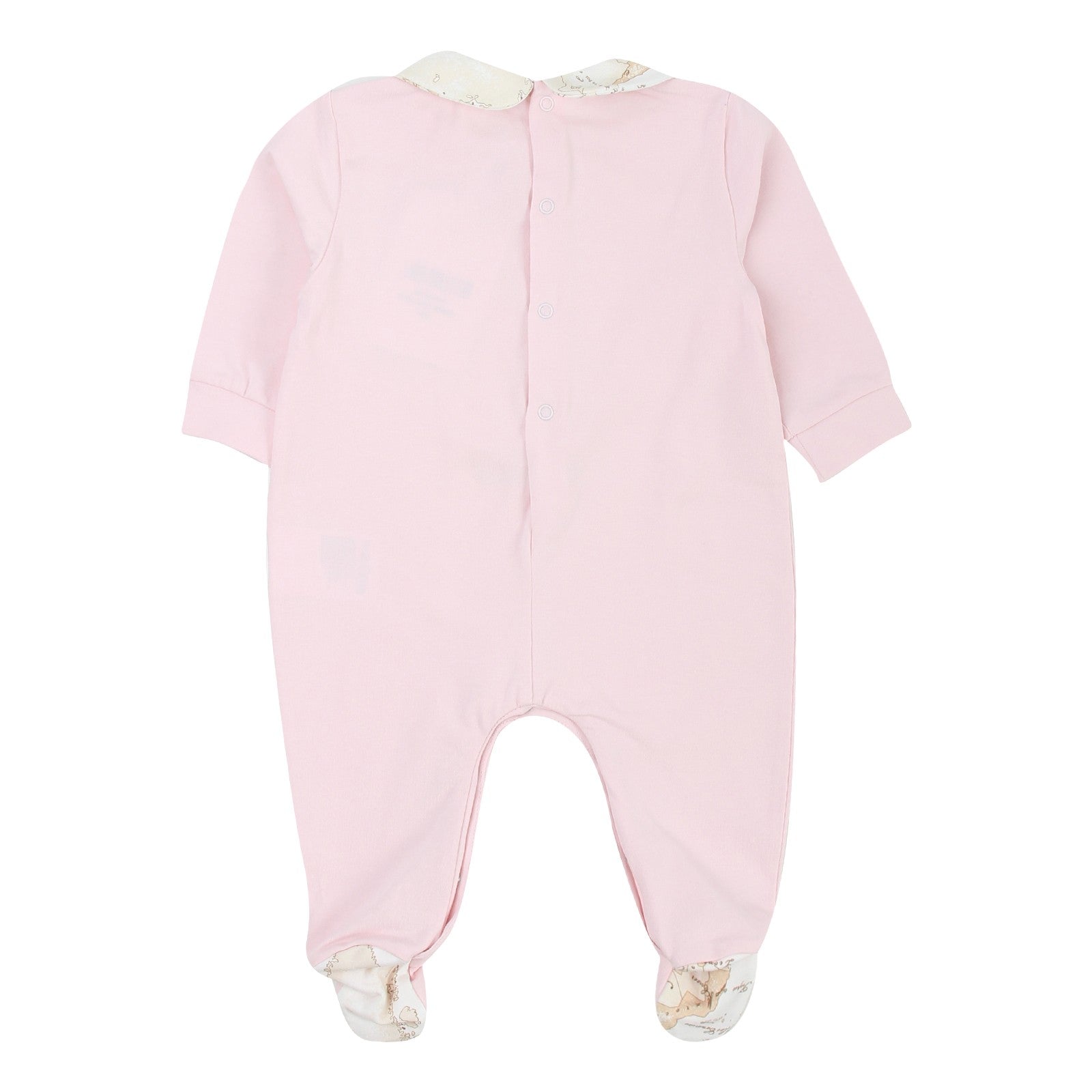 Tutina intera in morbido cotone, di un delicato rosa con colletto ricamo e piedini fantasia Alviero Martini, maniche lunghe e piedini