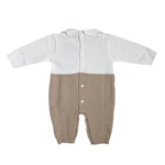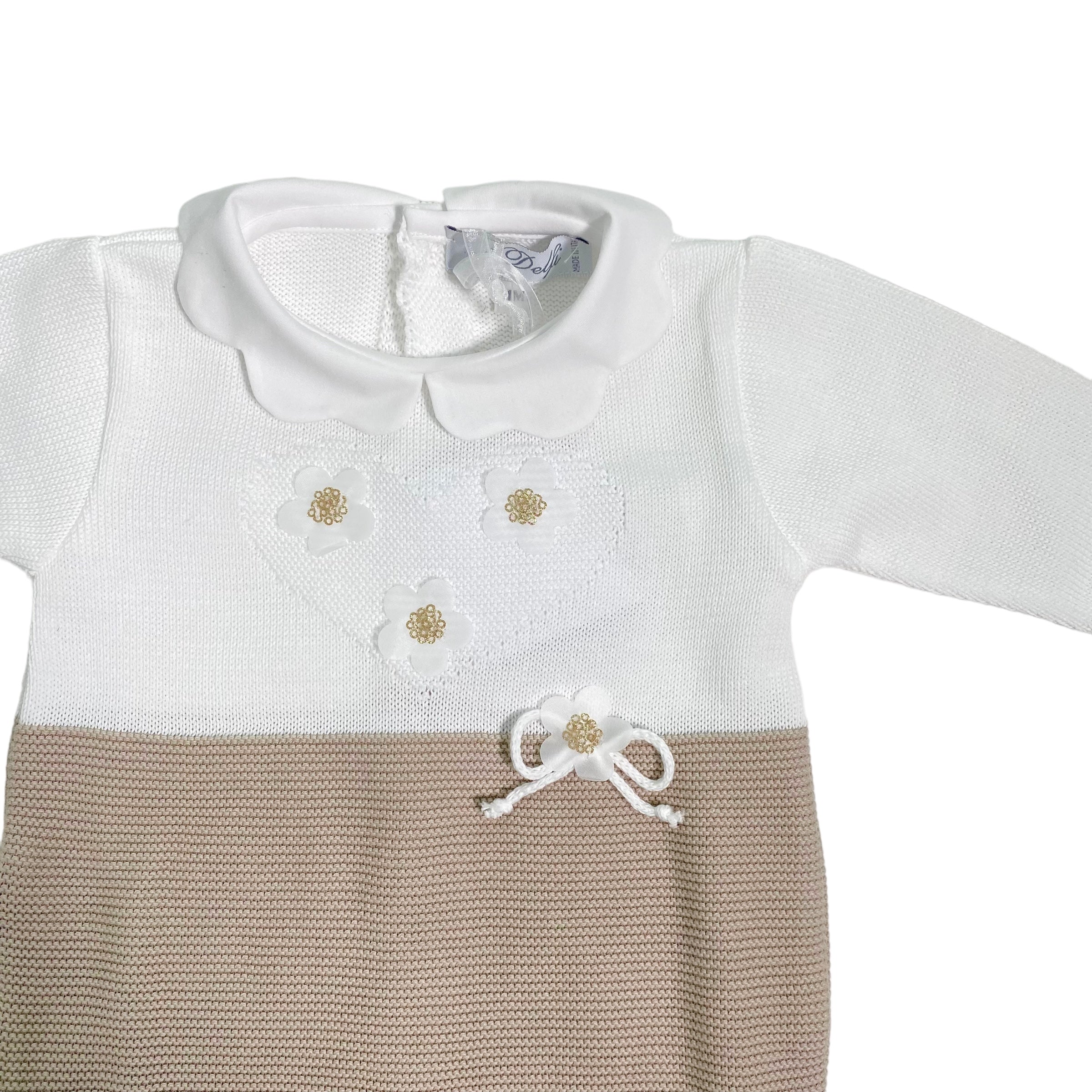Tutina intera in filo di cotone, con parte superiore bianca con ricamo di cuore e parte inferiore beige.