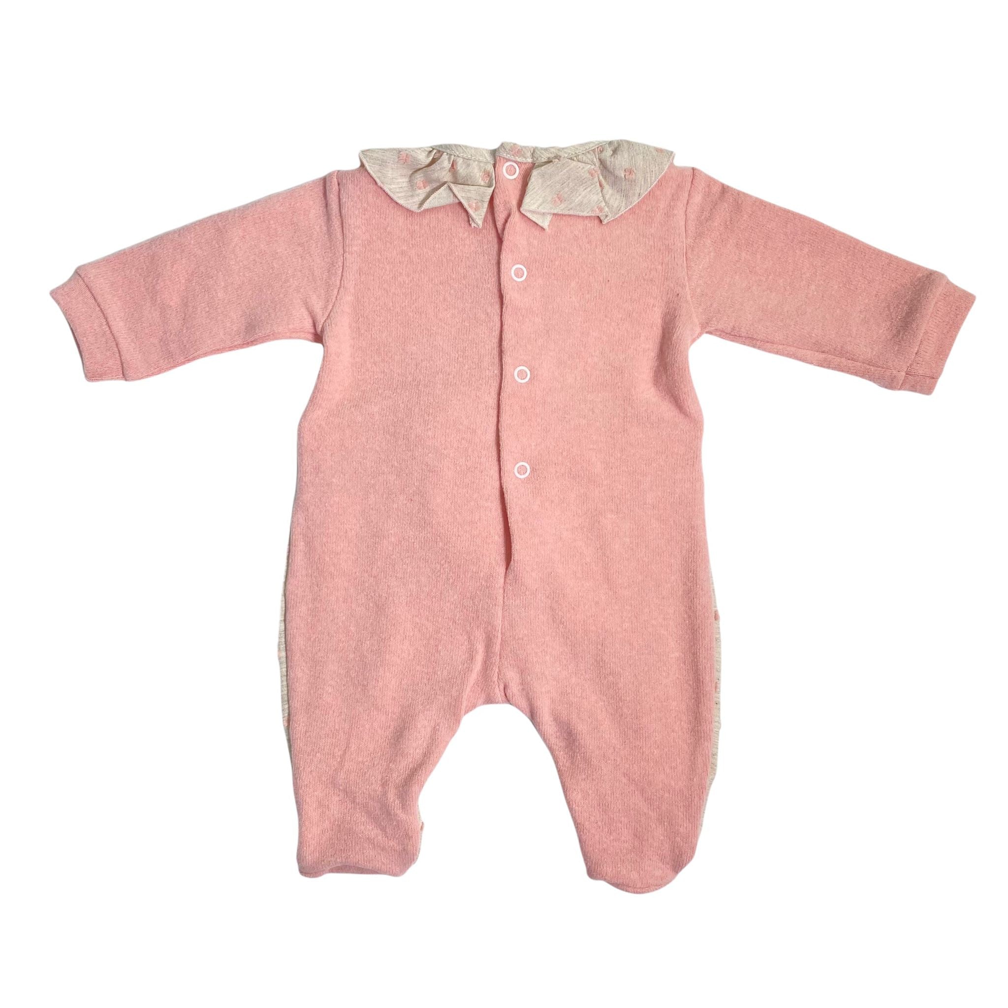 Tutina intera con piedini e maniche lunghe, parte superiore in lana rosa con volante, parte inferiore beige con fantasia pois rialzati, chiusura e apertura al avallo e sul retro con bottoni a pressione.