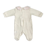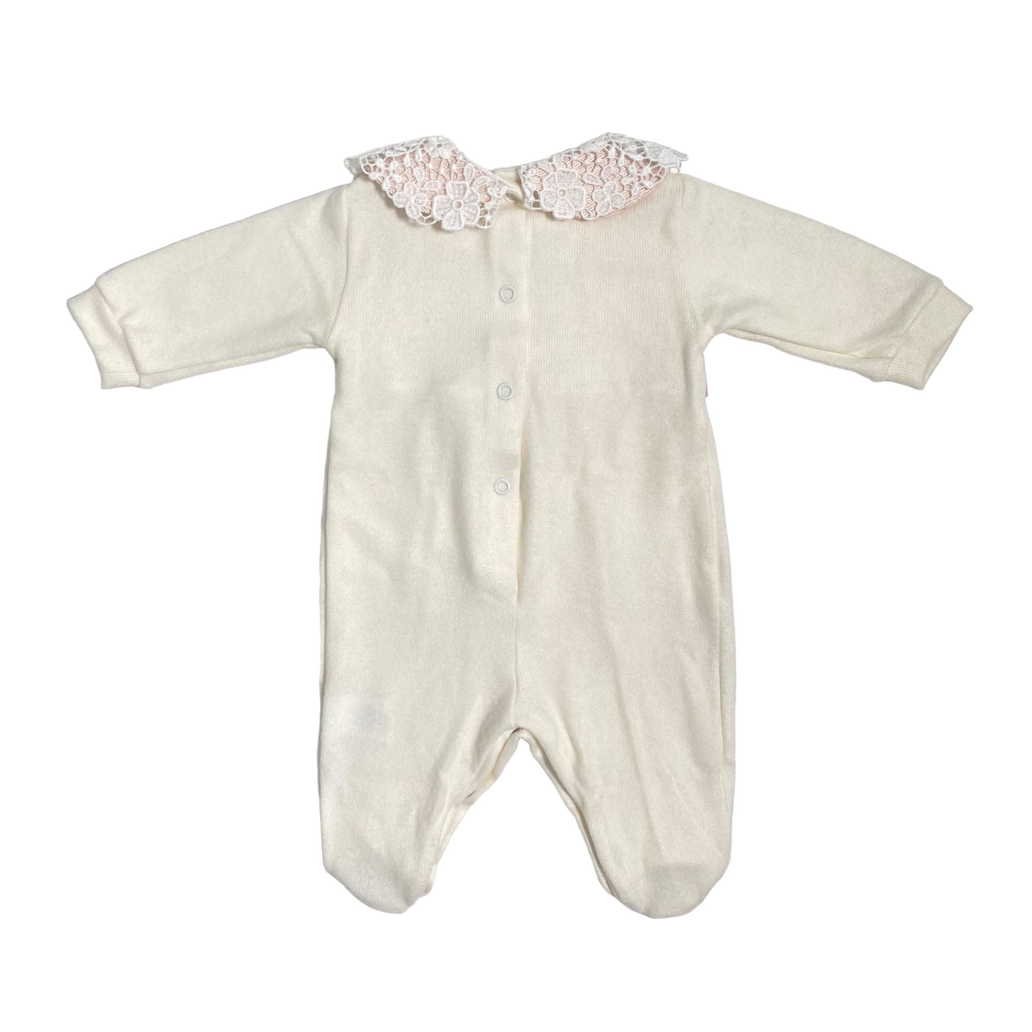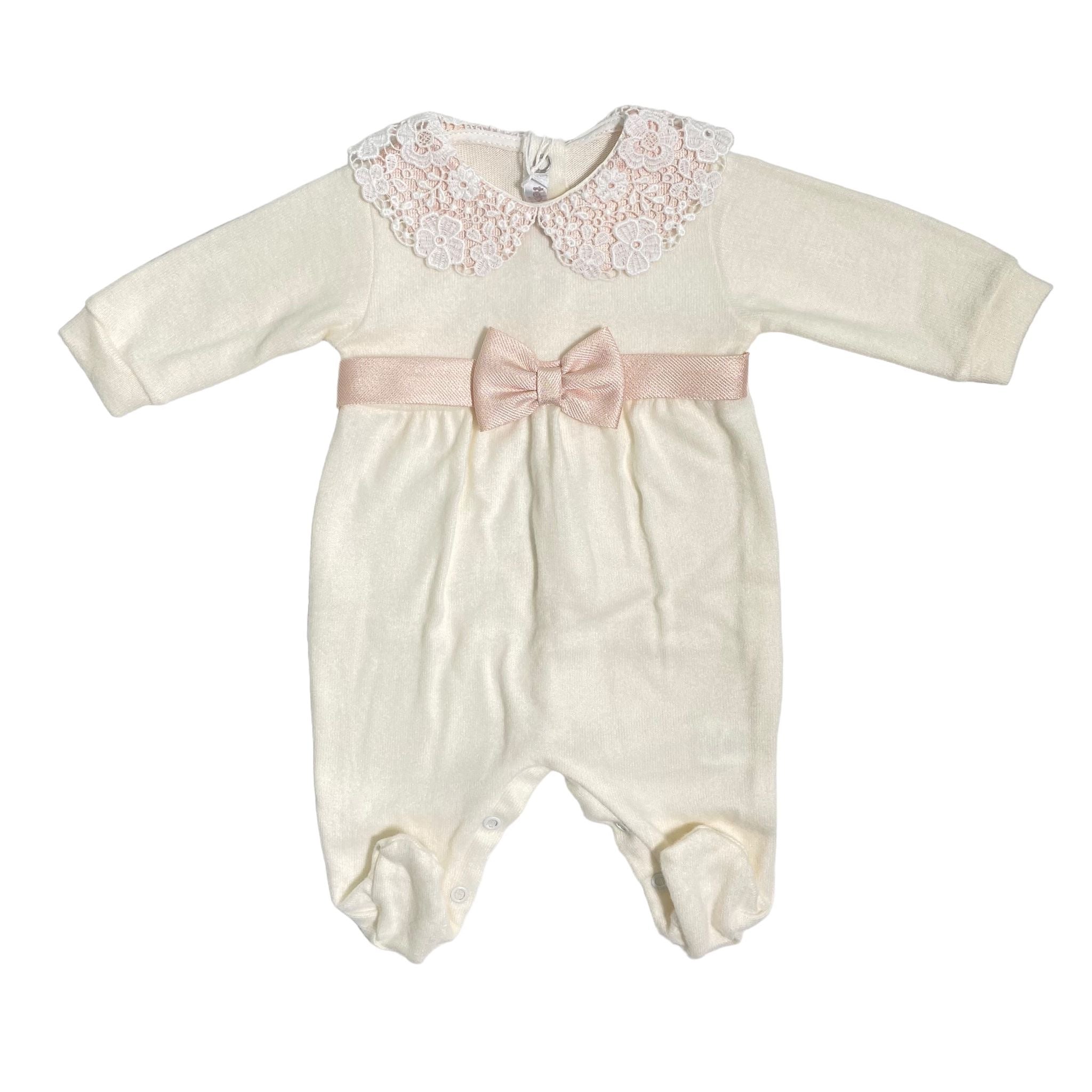 Questa tutina intera in maglina è elegante e perfetta per l'uscita clinica dei neonati. Il suo collo con macramè e il fiocco davanti aggiungono un tocco di stile alla tua piccola. Realizzata interamente in Italia per garantire qualità e comfort.
