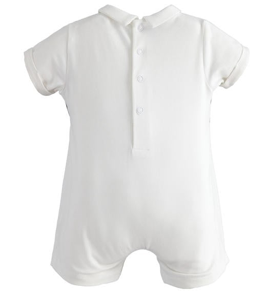 Tutina Mezze Maniche Bianca In cotone Con Colletto. Applicazione di Cravatta Sul Davanti con Finto Gilet Blu.