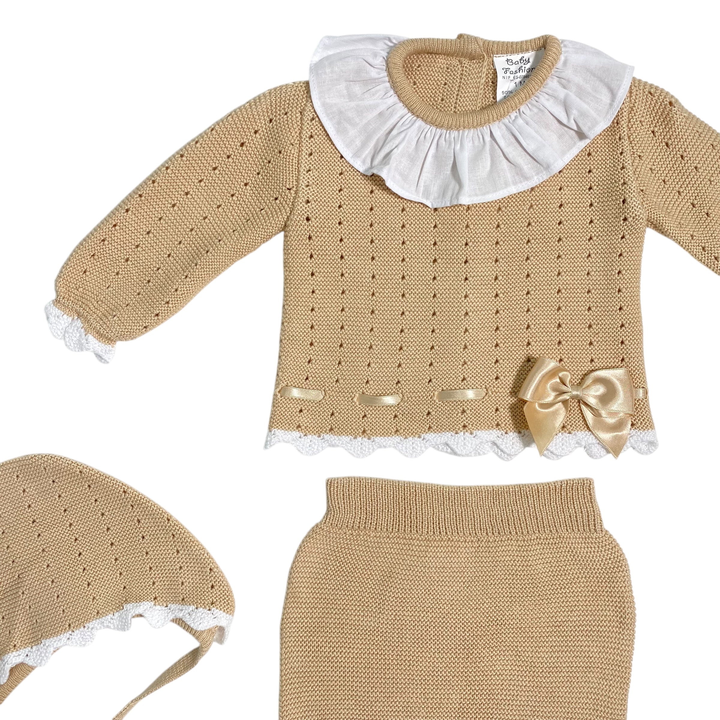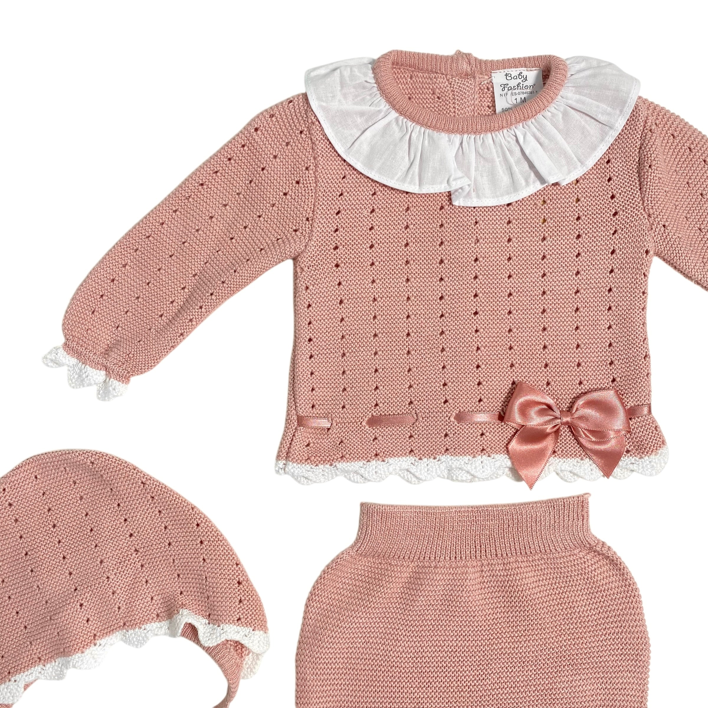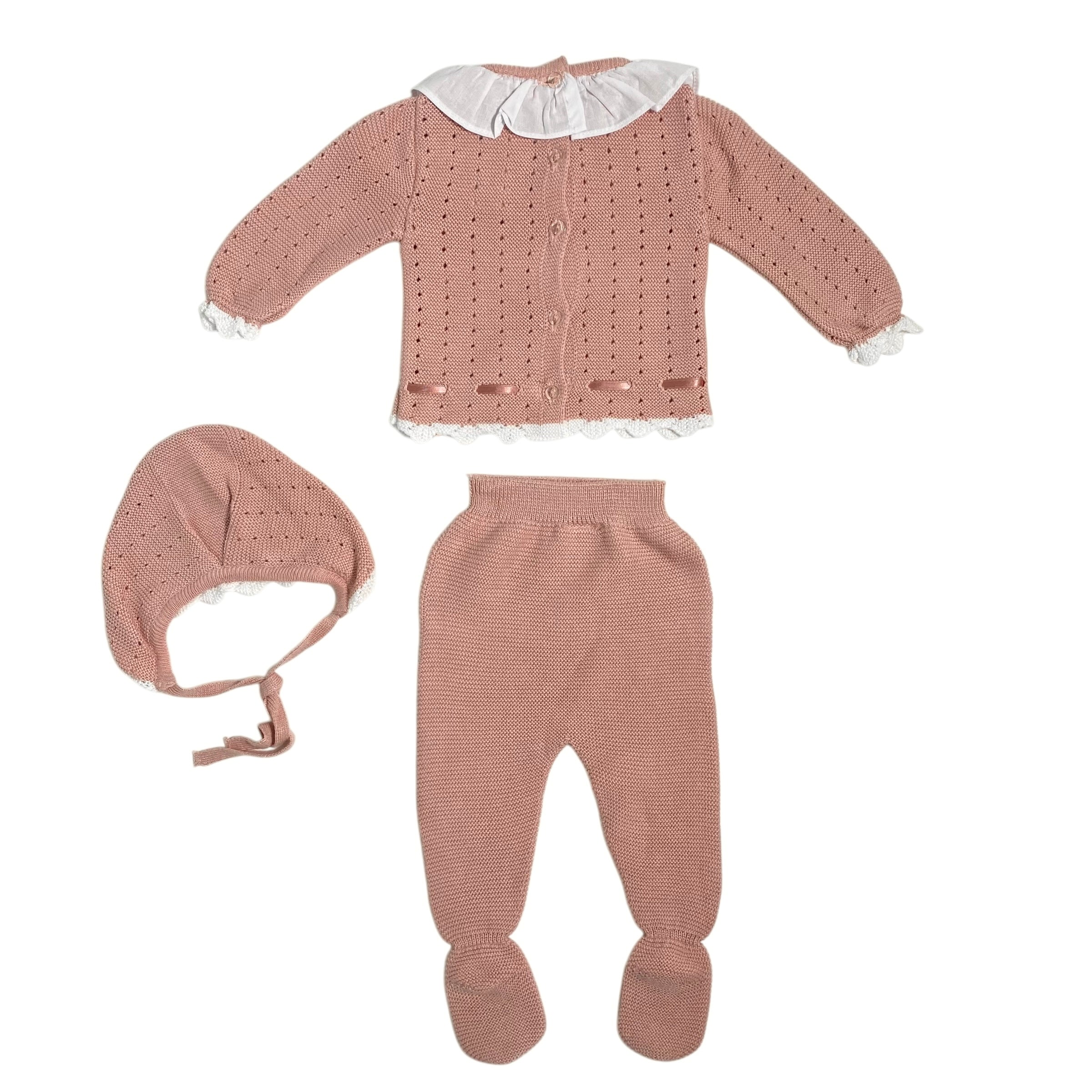 Realizzata in morbido cotone misto, questa tutina spezzata presenta deliziose traforature e un grazioso fiocco in raso sul davanti. Abbinata a una cuffia in coordinato, è perfetta per proteggere la tua neonata con stile e comfort. Il collo a rouche aggiunge un tocco di eleganza.