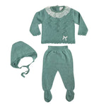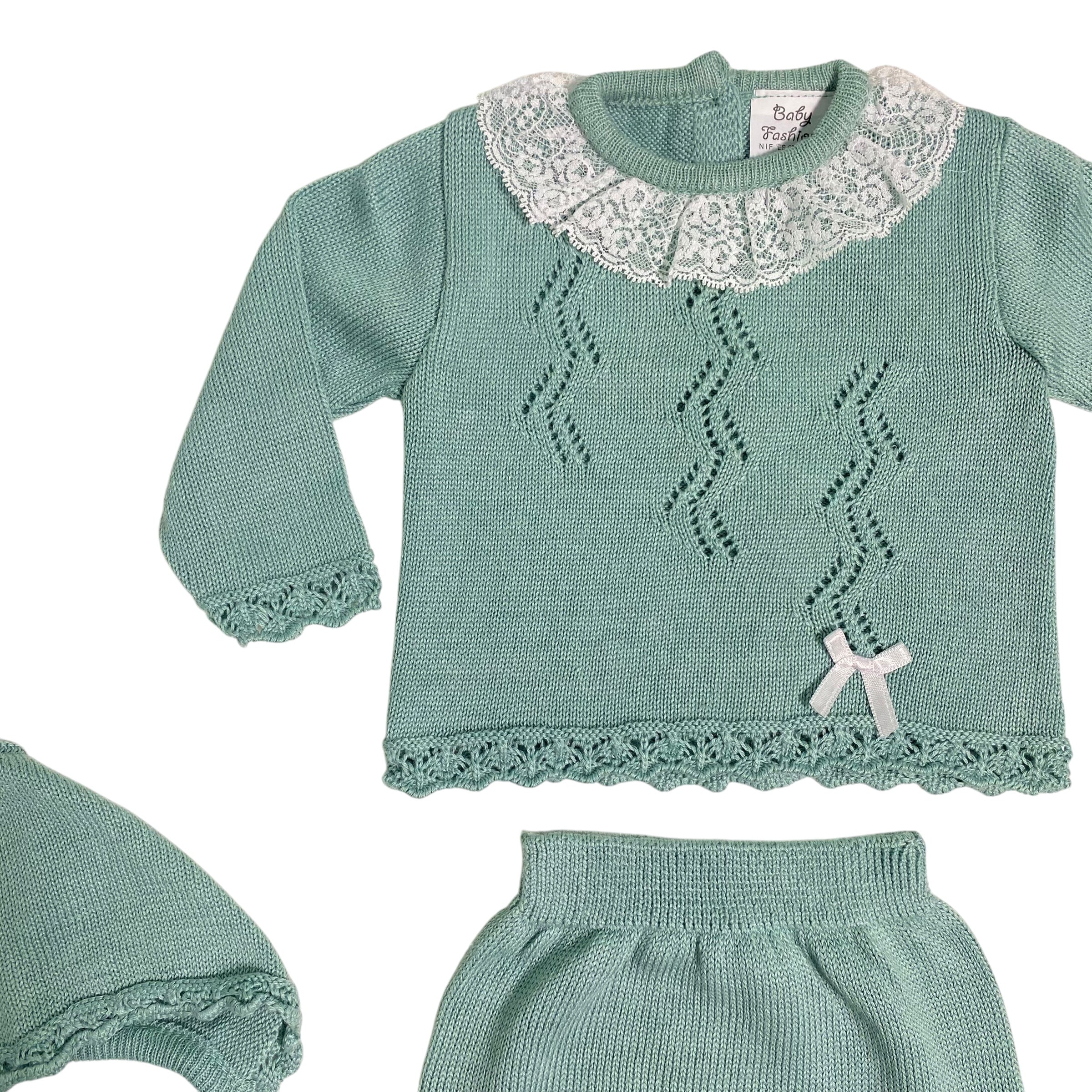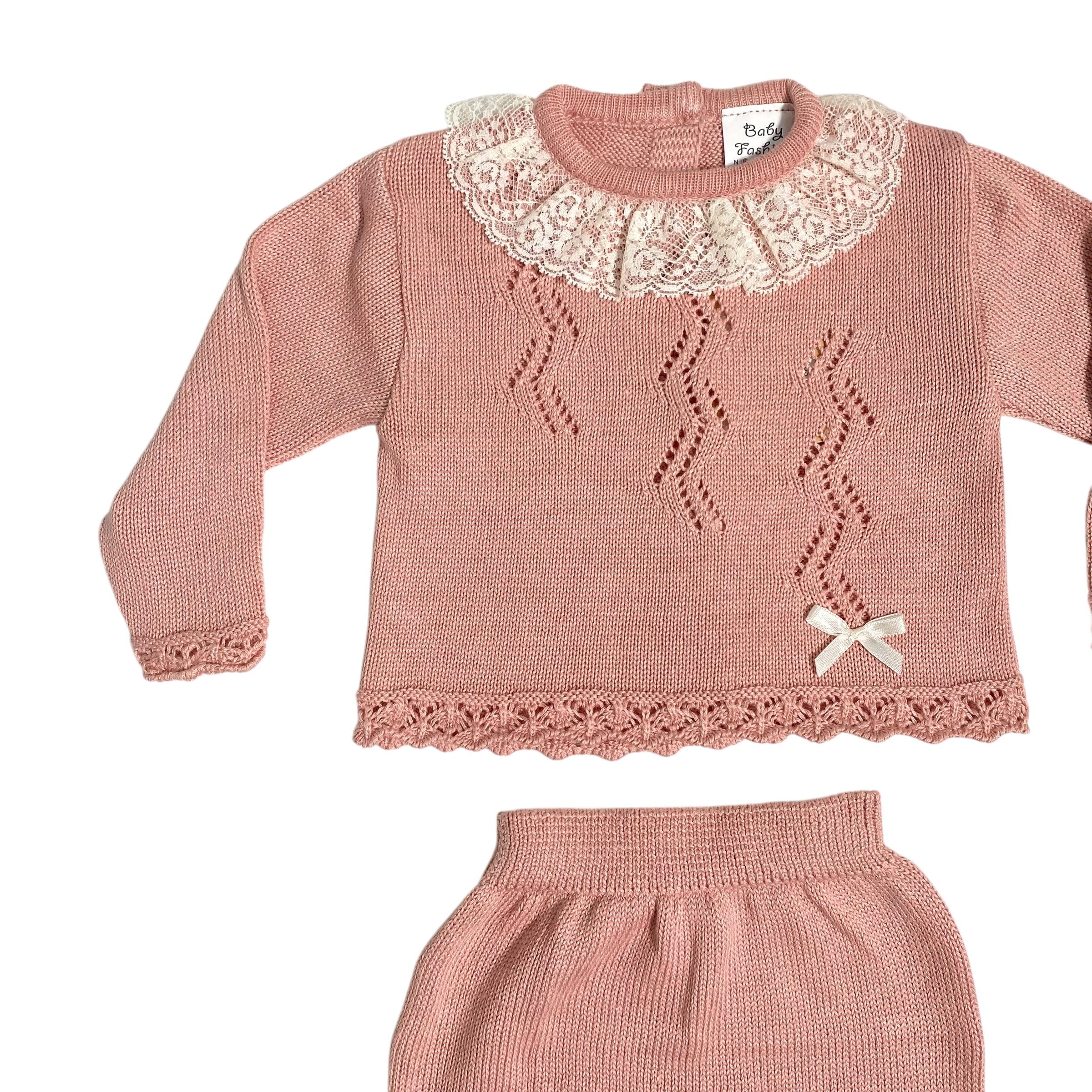 Realizzata in morbido cotone misto, questa tutina spezzata presenta deliziose traforature e un grazioso fiocco in raso sul davanti. Abbinata a una cuffia in coordinato, è perfetta per proteggere la tua neonata con stile e comfort. Il collo con pizzo aggiunge un tocco di eleganza.