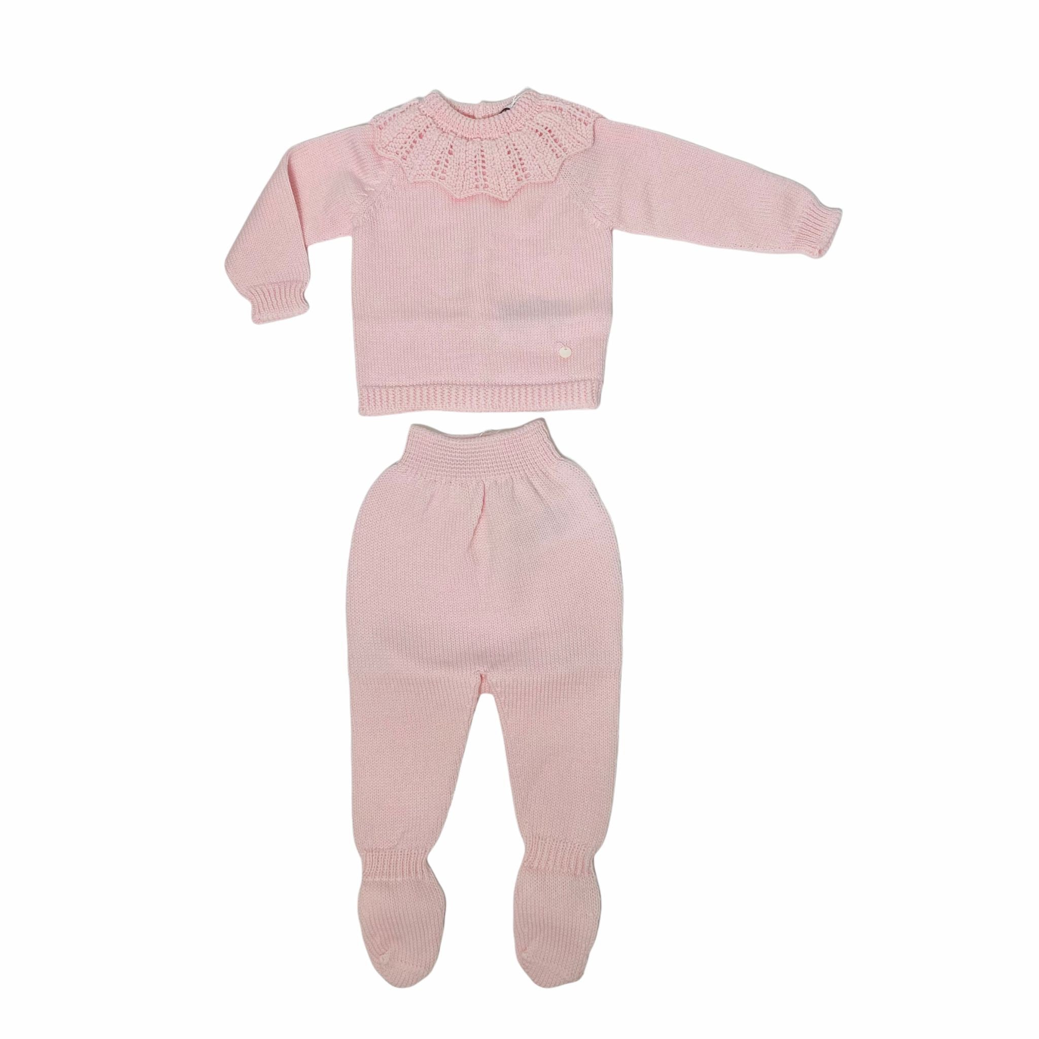 Calda tutina spezzata in 100% lana comporta da ghettina con piedini ed elastico in vita e maglietta a maniche lunghe con chiusura posteriore con girocollo e colletto ricamato con decorazioni.