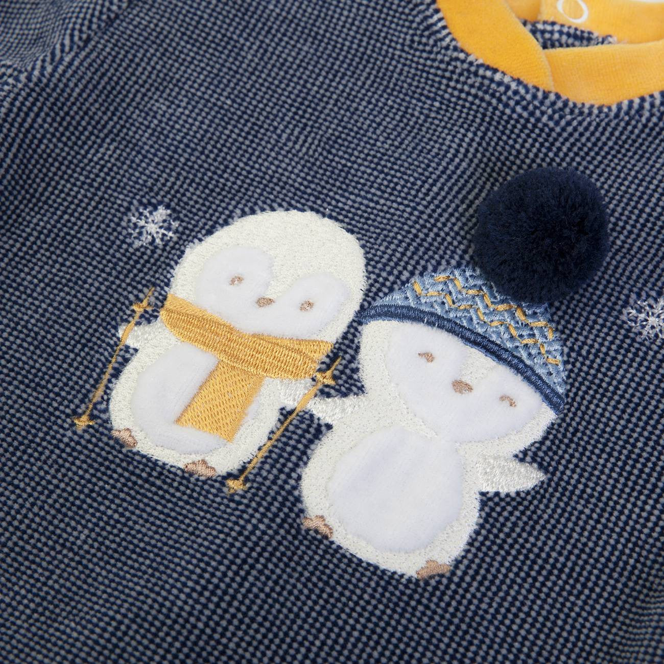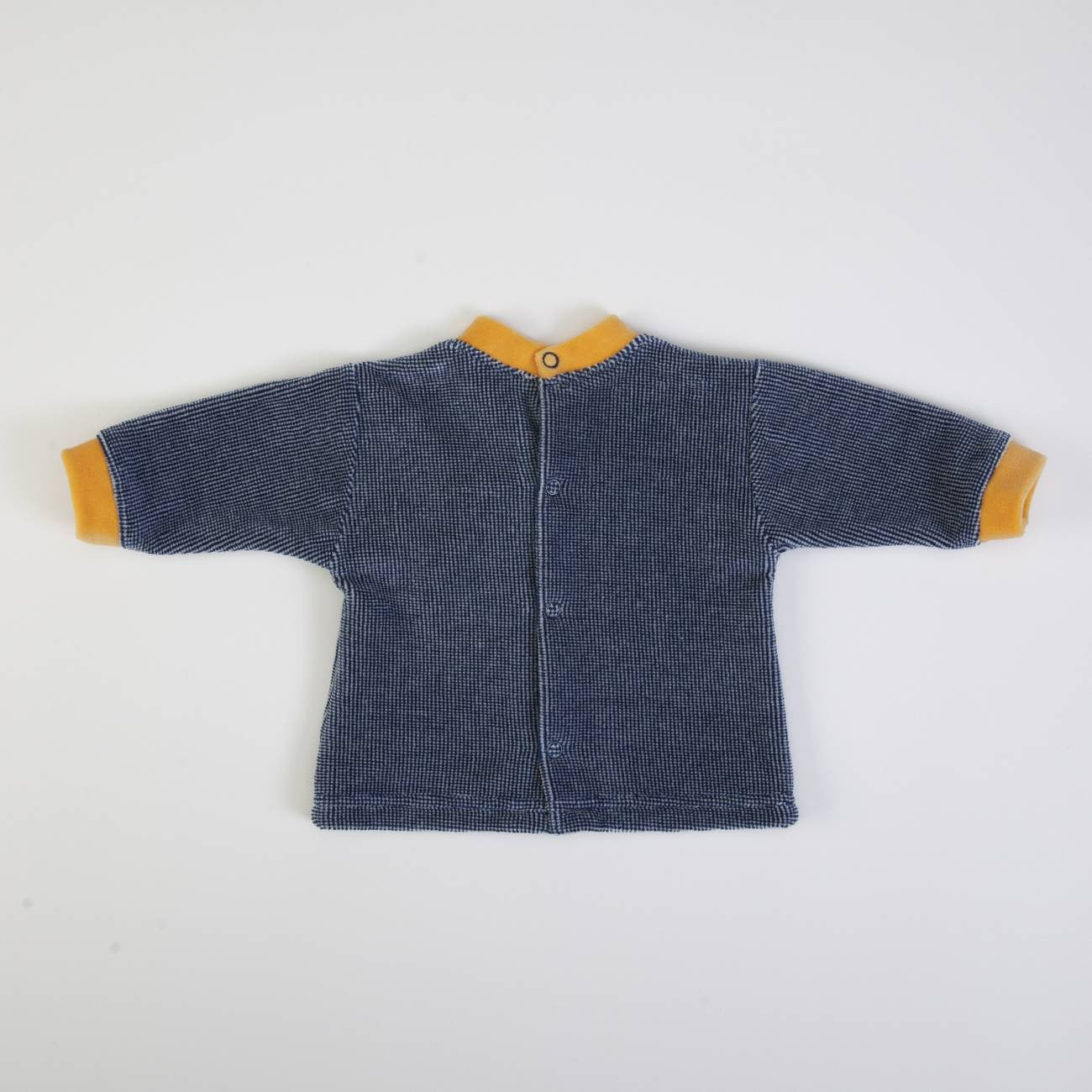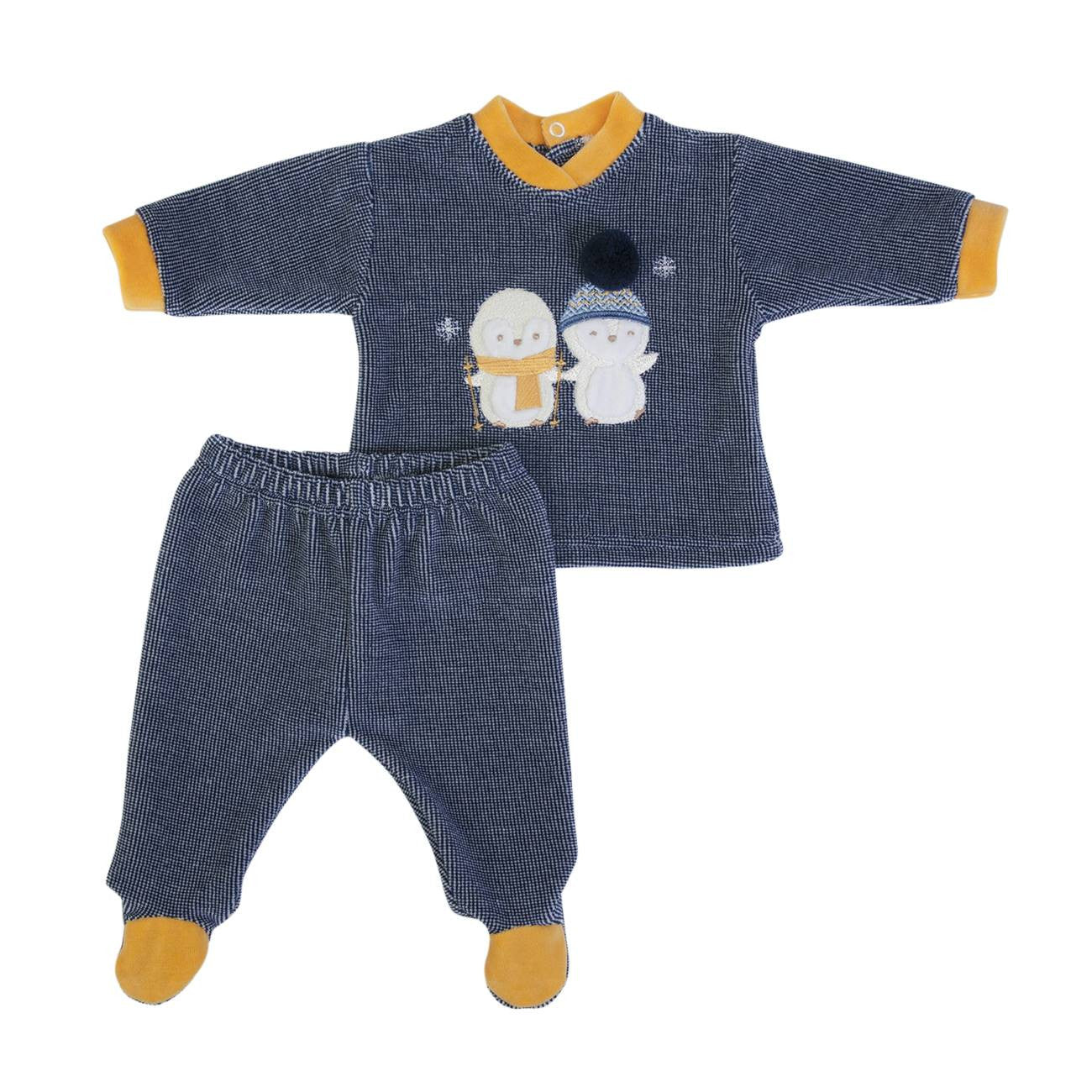 Completo spezzato composto da maglietta con colletto giallo, disegni sul davanti e chiusura sul retro e pantalone con elastico in vita e piedini.