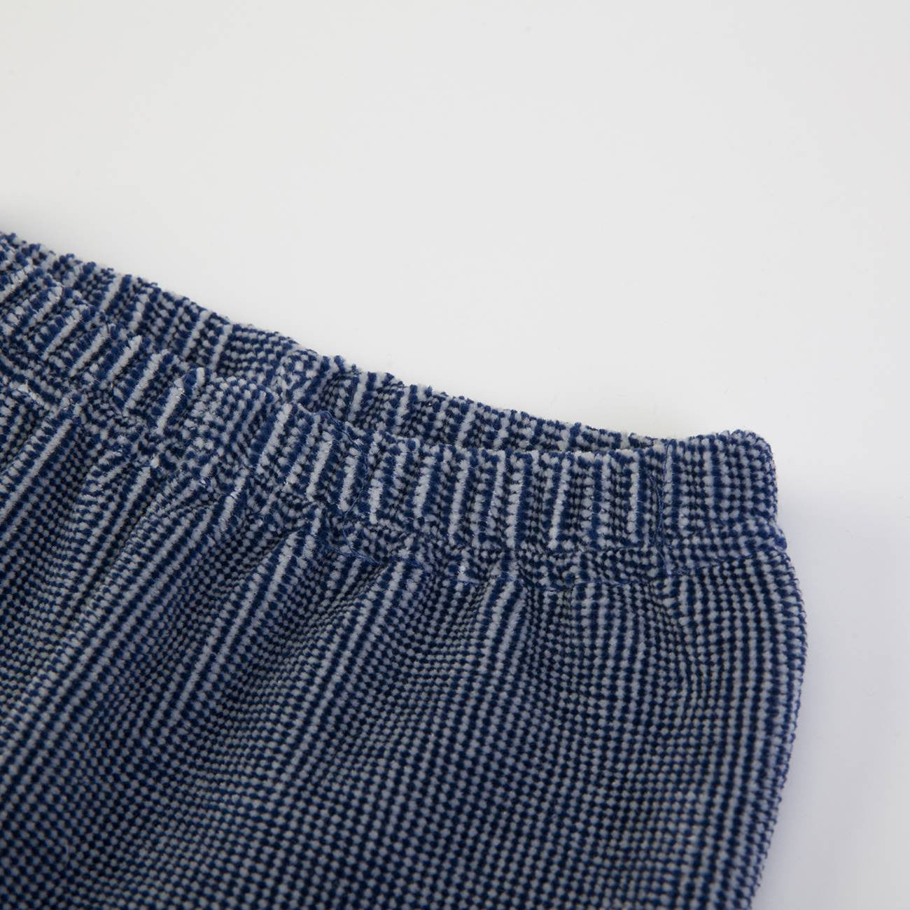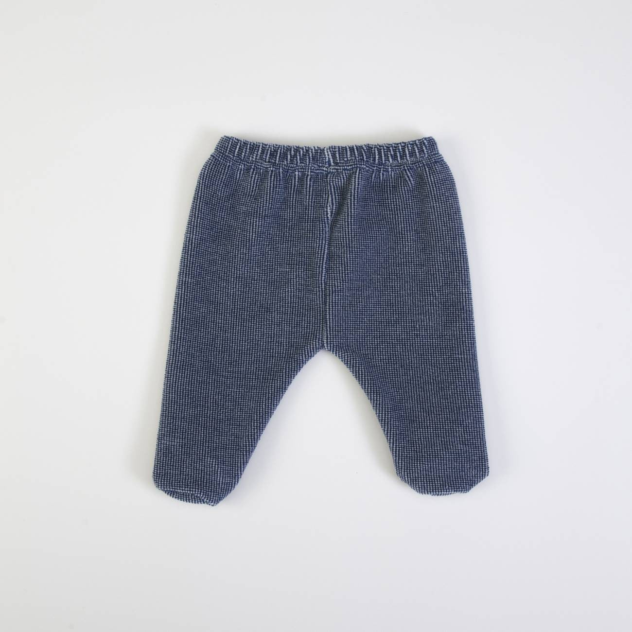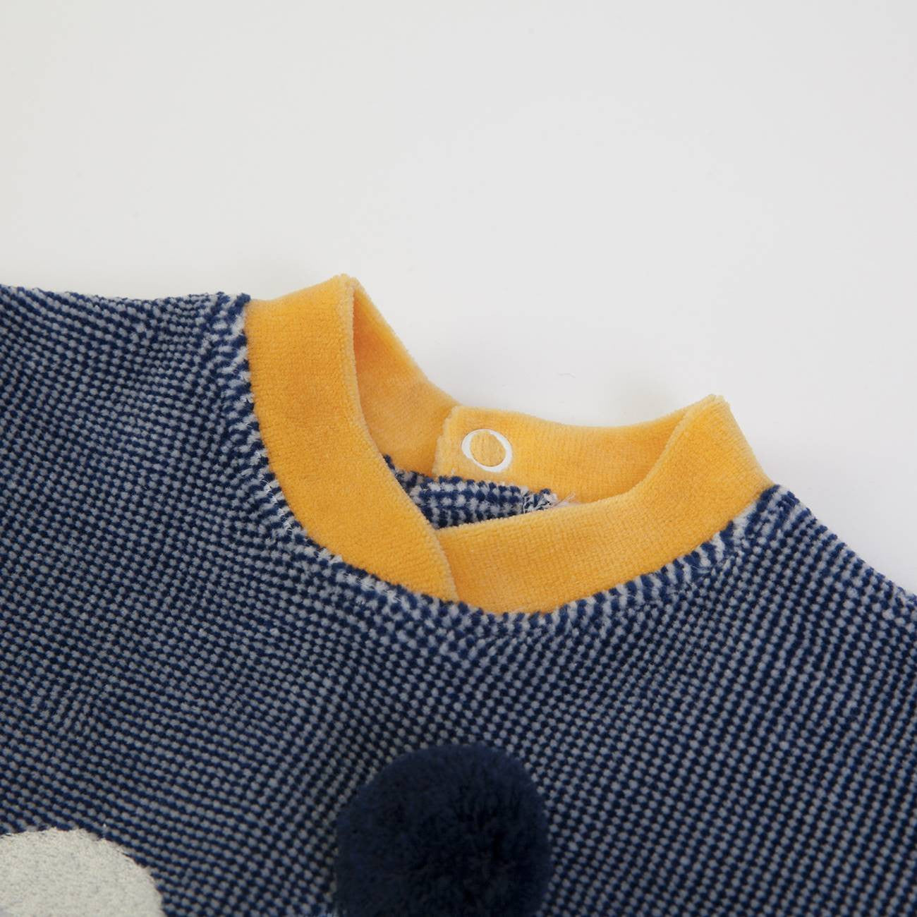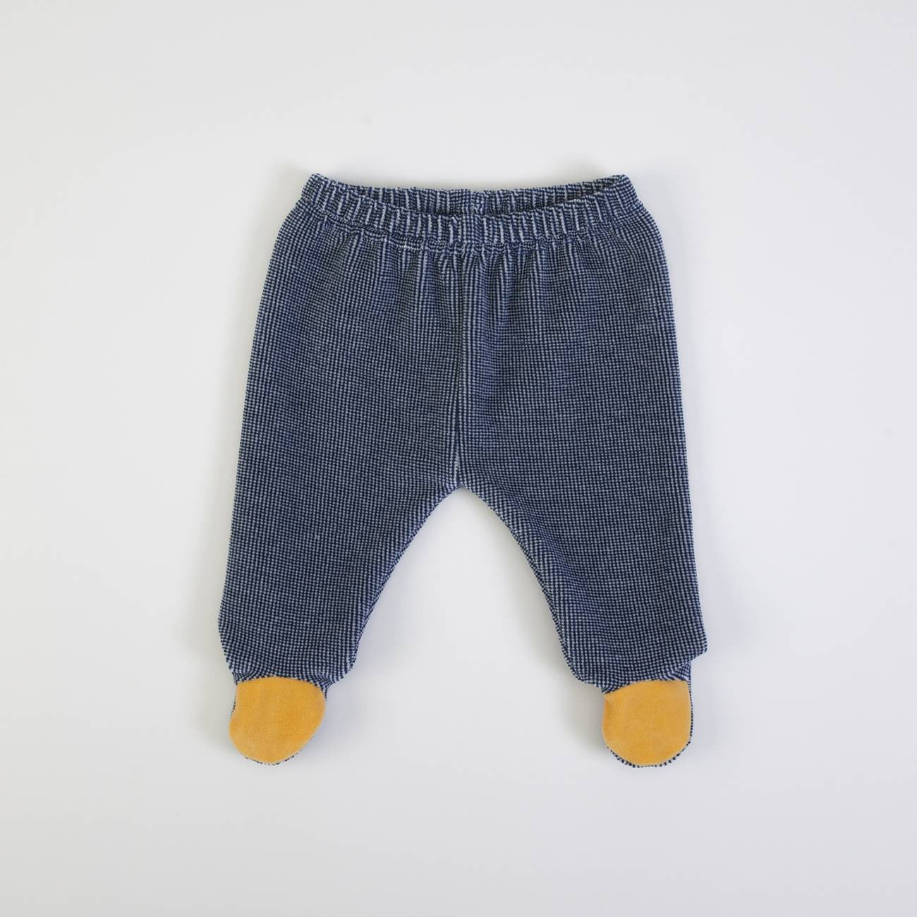 Completo spezzato composto da maglietta con colletto giallo, disegni sul davanti e chiusura sul retro e pantalone con elastico in vita e piedini.