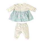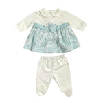 Confortevole tutina in cotone panna e verde tiffany per neonate, dotata di ghettina interamente panna e maglia con tulle con ricami in rilievo. Il corpetto ha un tocco di eleganza con il fondo verde tiffany e il cinturino con fiore. Chiusura di bottoni a pressione sul retro per facilitare il cambio.