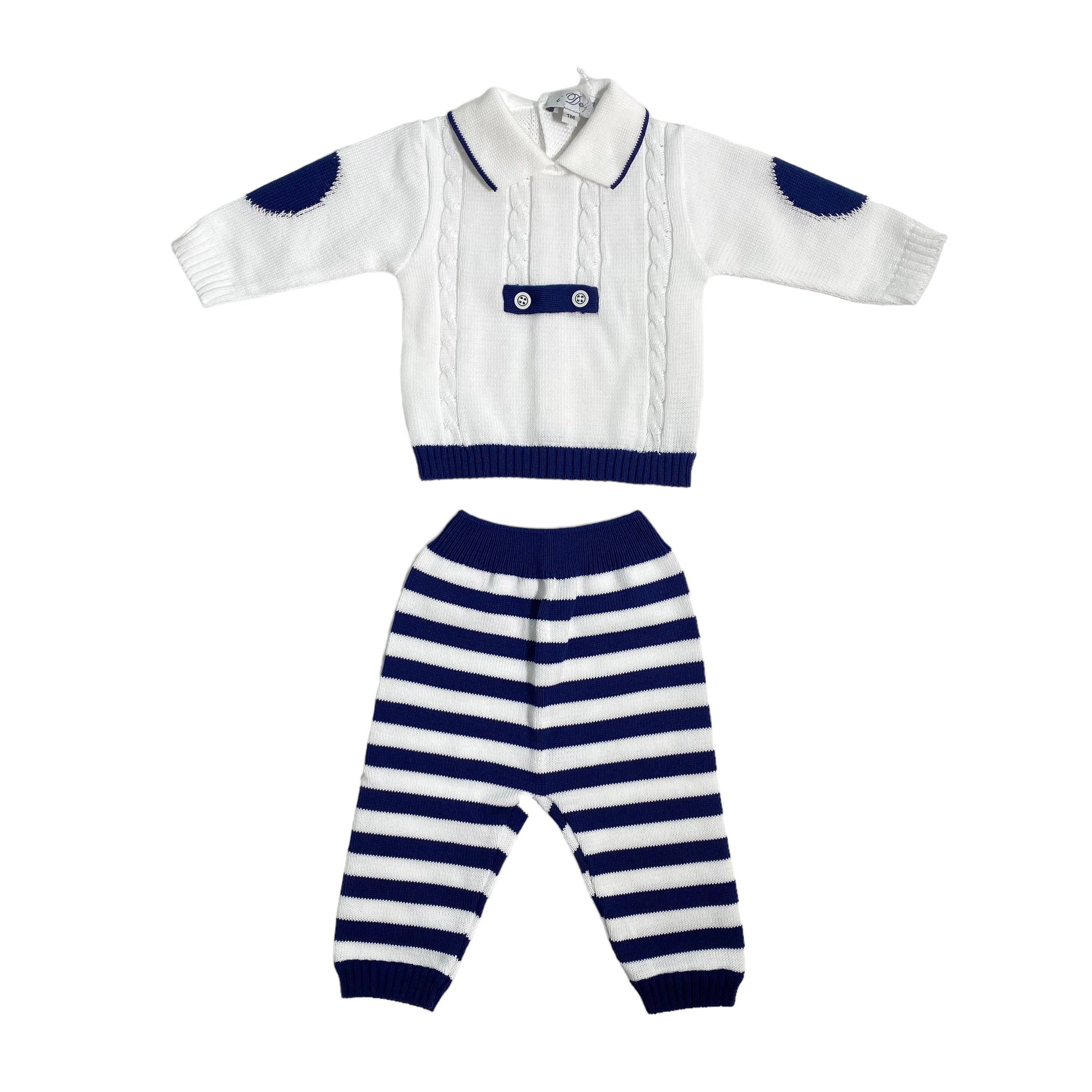 Tutina spezzata in filo di cotone, con ghettina a righe bianca e blu e maglia bianca con ricami di trecce.