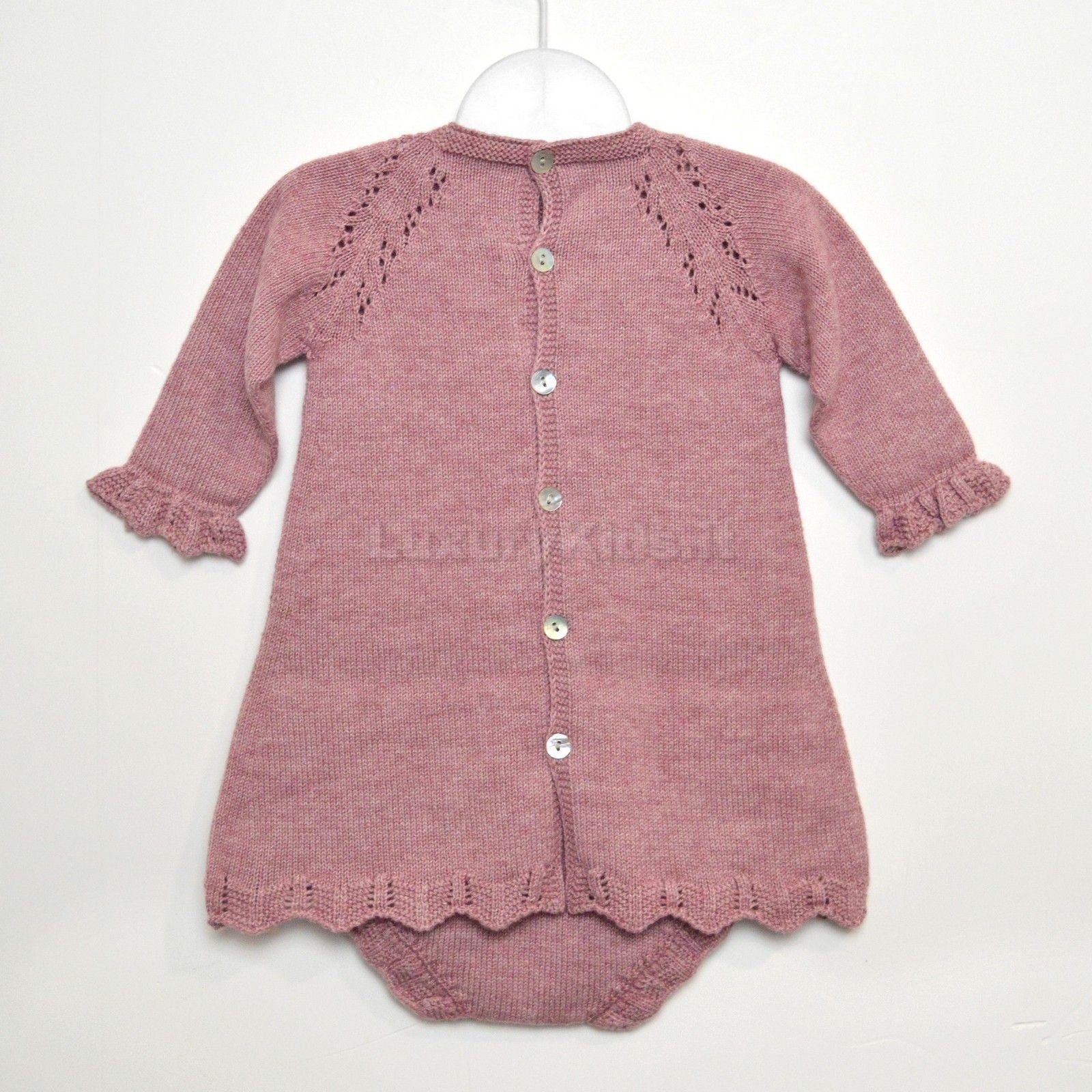 -Vestina rosa in caldo cotone con fantasia traforata lungo le spalle e polsi con rouches