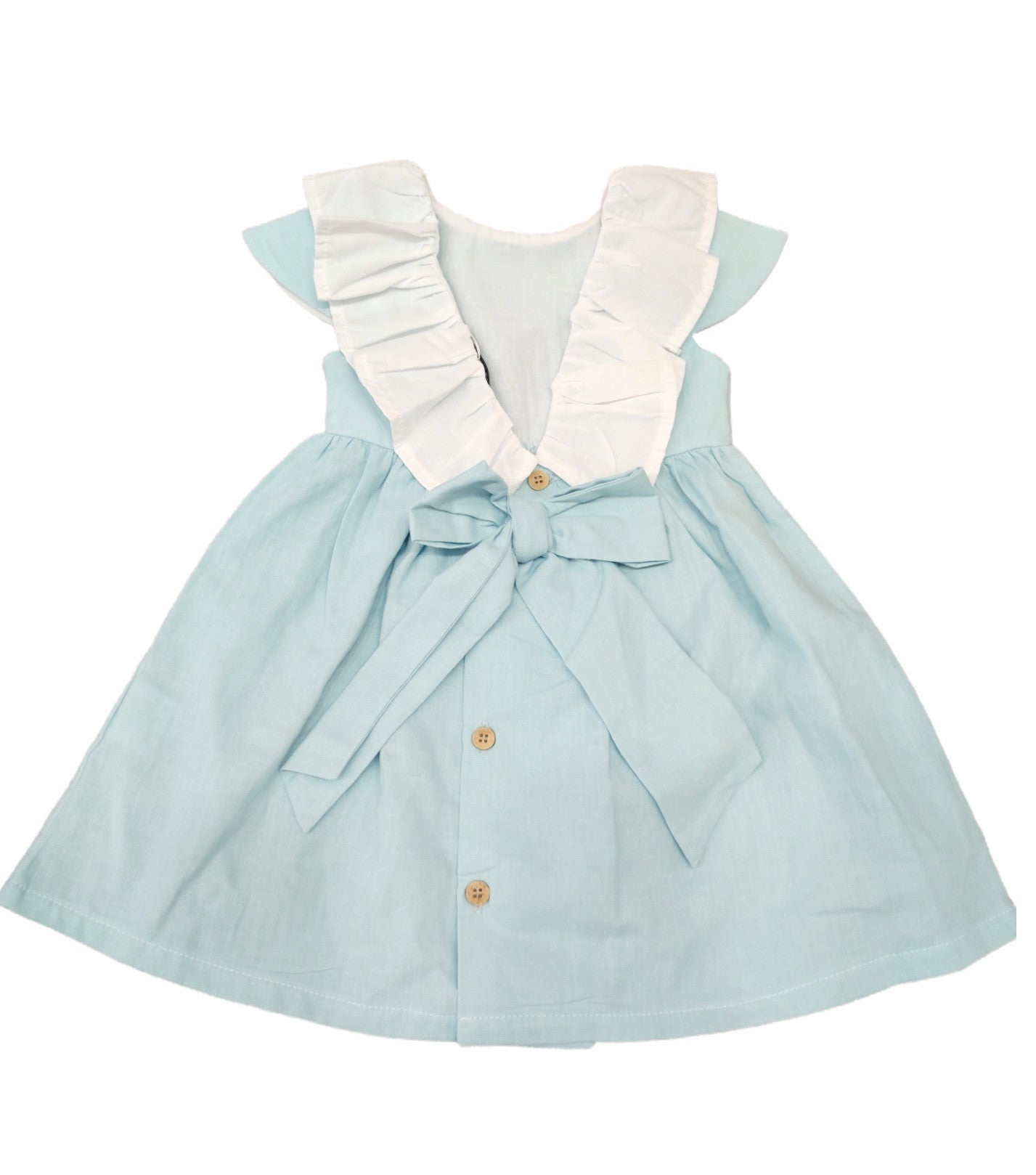 Colletto a ruches bianco con un bellissimo scollo posteriore a "V", impreziosito da un fiocco verde che vopre l'apertura sul retro con die bottoni in legno su tutta lka lunghezza della gonna, partendo dalla vita.