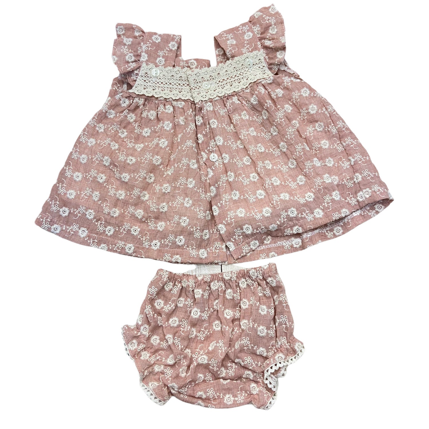 Vestito con culotte in cotone in due colori, verde e rosa antico con ricami panna in rilievo
