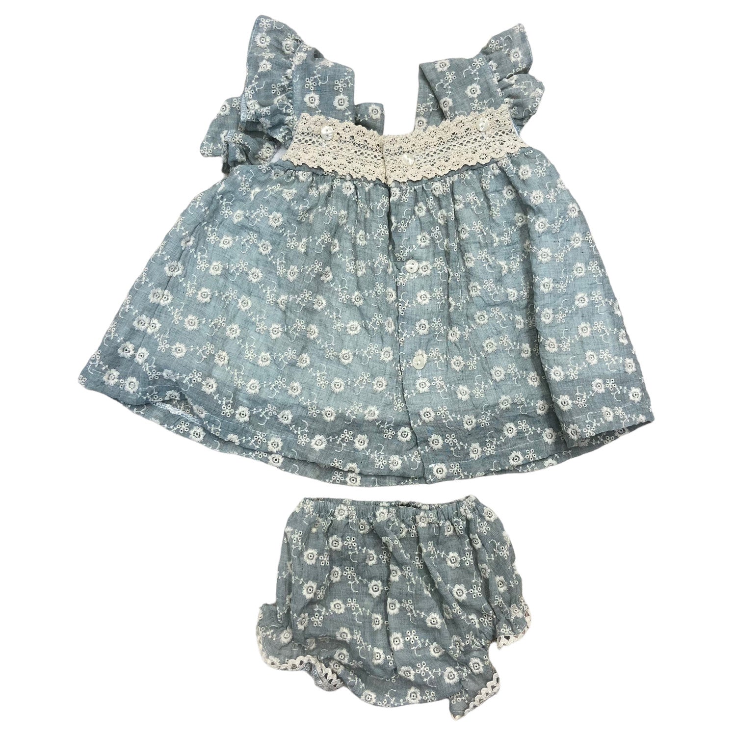 Cuklotte con la stessa fantasia del vestito con i ricami panna in rilievo e sull'estremità delle gambine è presente un ricamo panna con arricciatura sulla vita