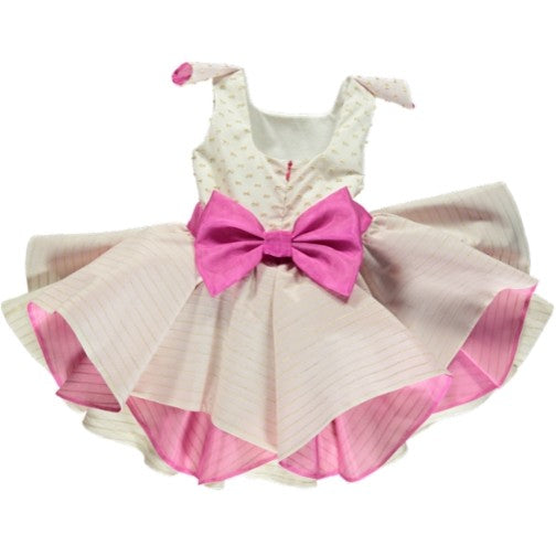 Vestito Smanicato Elegante Parte Superiore In Cotone Plumetis Panna/Oro. Fascia in Vita Fucsia In Organza Con Fiocco Grande Sul Retro.