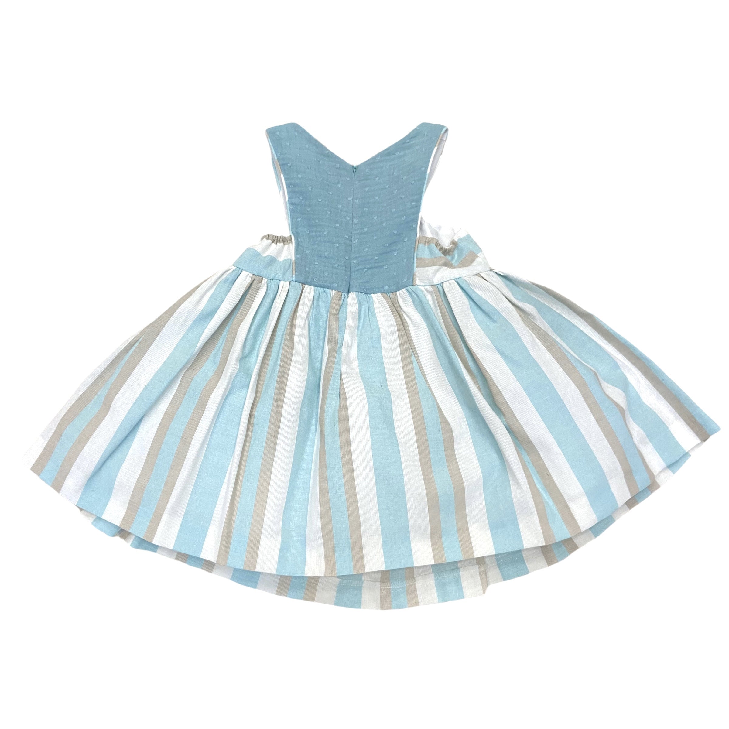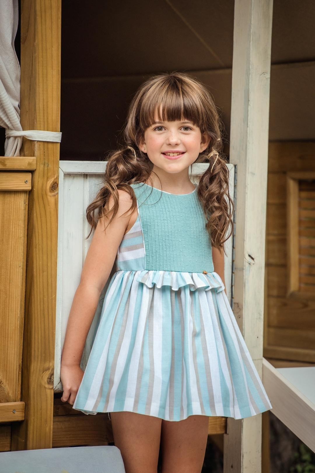 Giro manica con il corpetto verde polvere. Sulla vita una semplicissima balza che riprende la fantasia della gonna, a righe verde, bianco e beige.