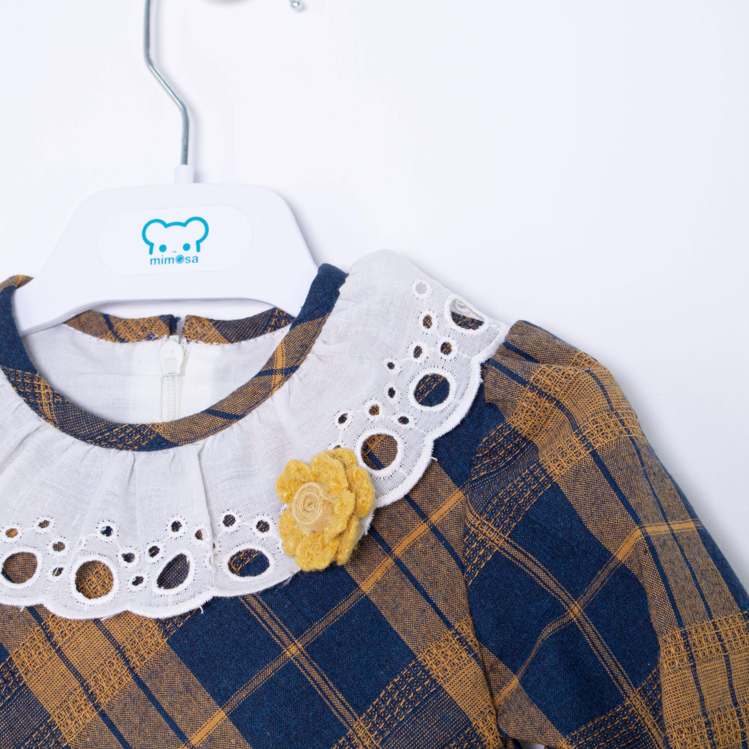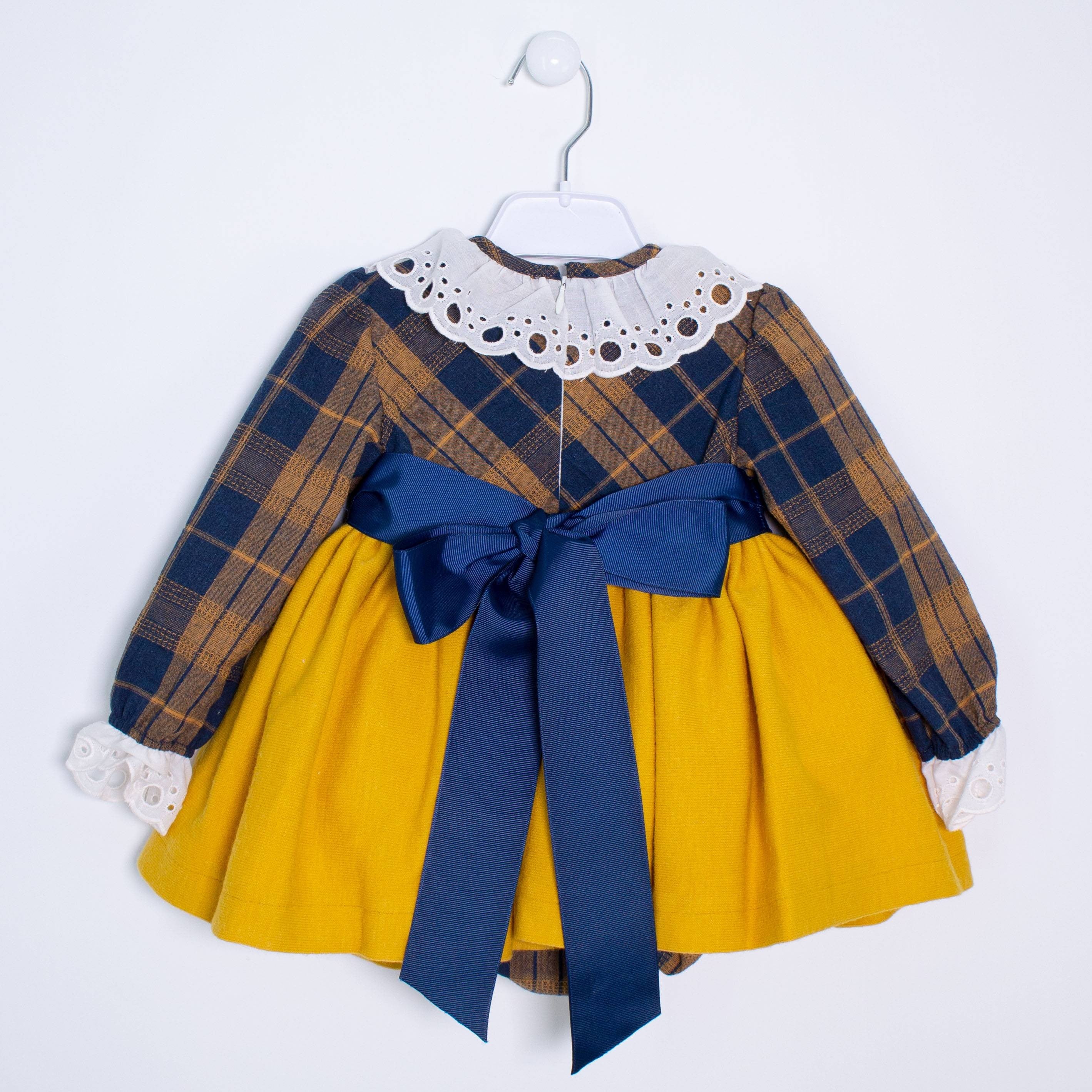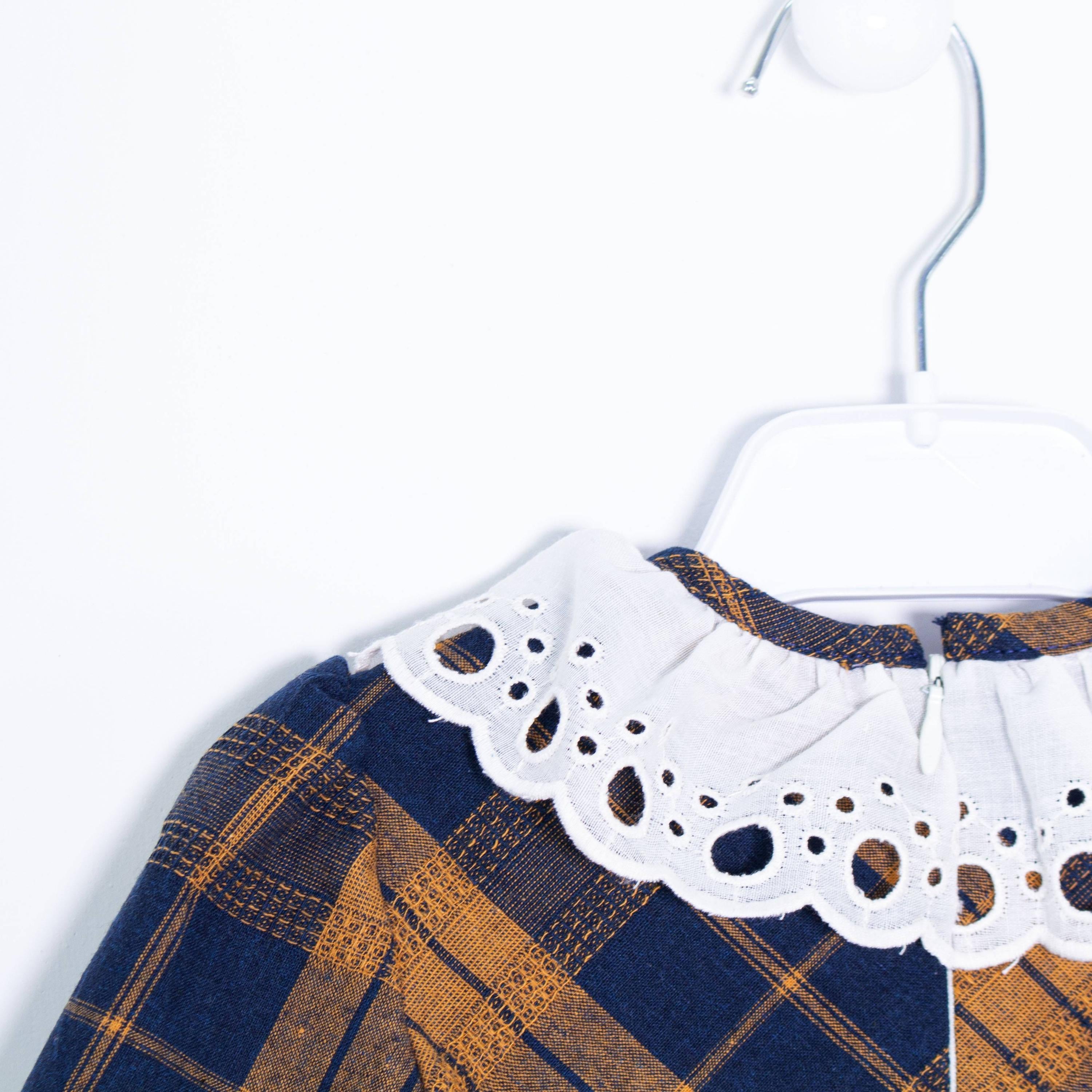 Vestitino con Culotte Maniche Lunghe. La Parte Superiore in Caldo Cotone Fantasia a Quadri Blu/Senape con Girocollo e Polsini Rouches in Macramè.