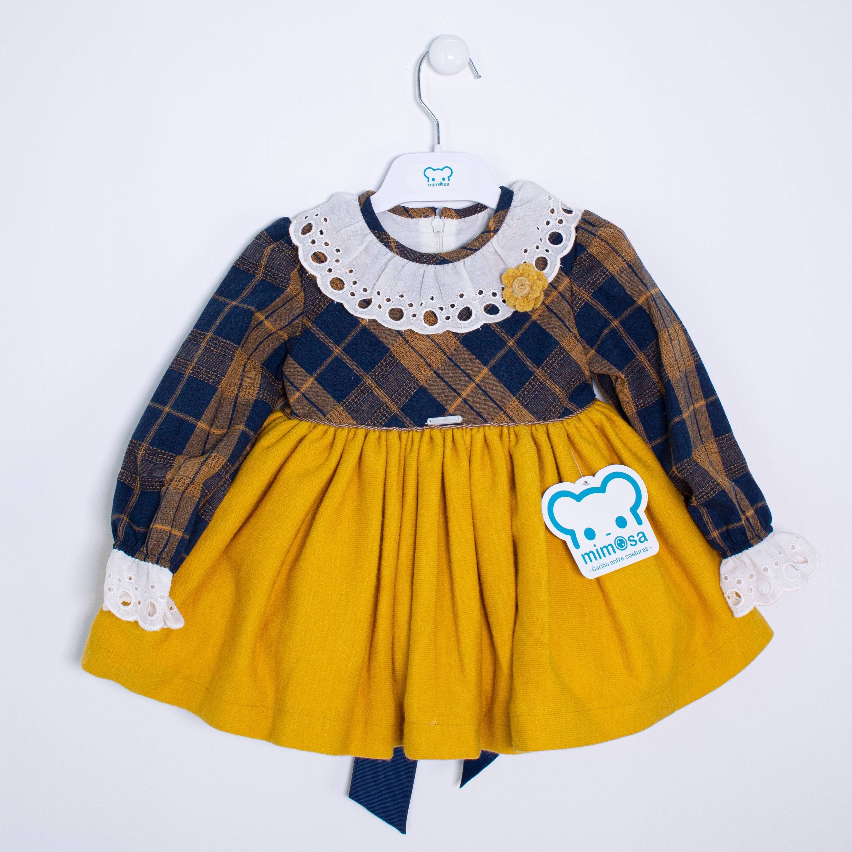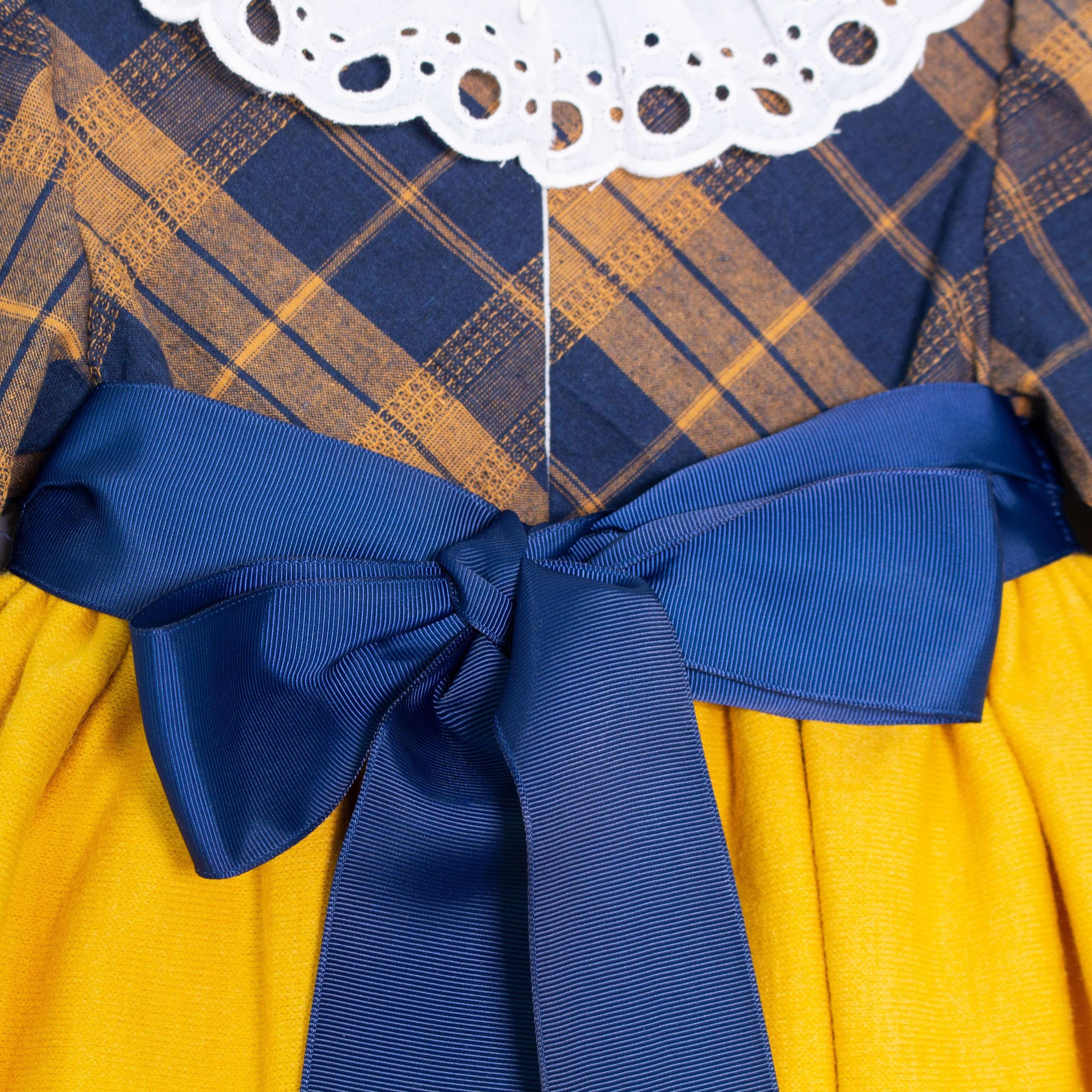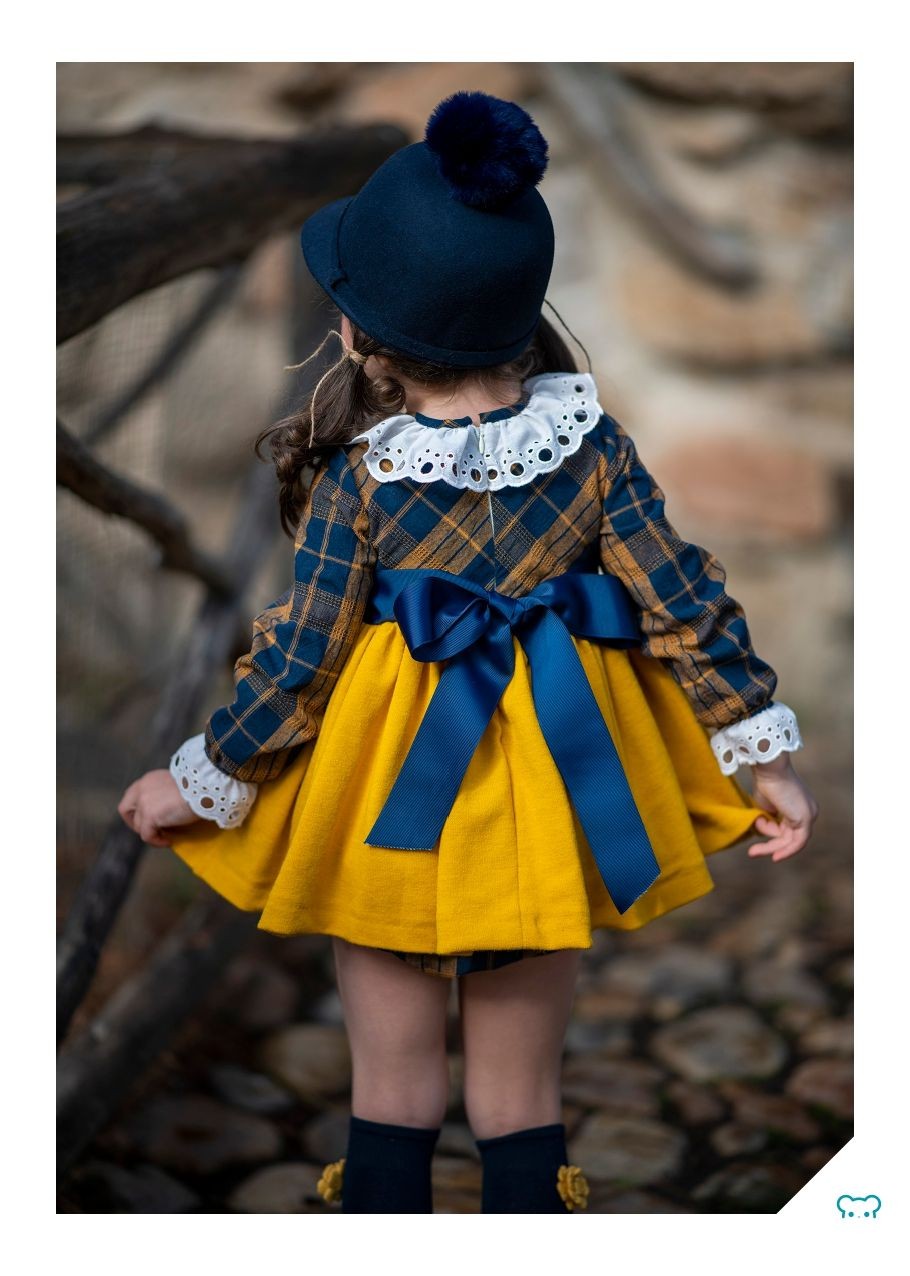 Vestitino con Culotte Maniche Lunghe. La Parte Superiore in Caldo Cotone Fantasia a Quadri Blu/Senape con Girocollo e Polsini Rouches in Macramè.