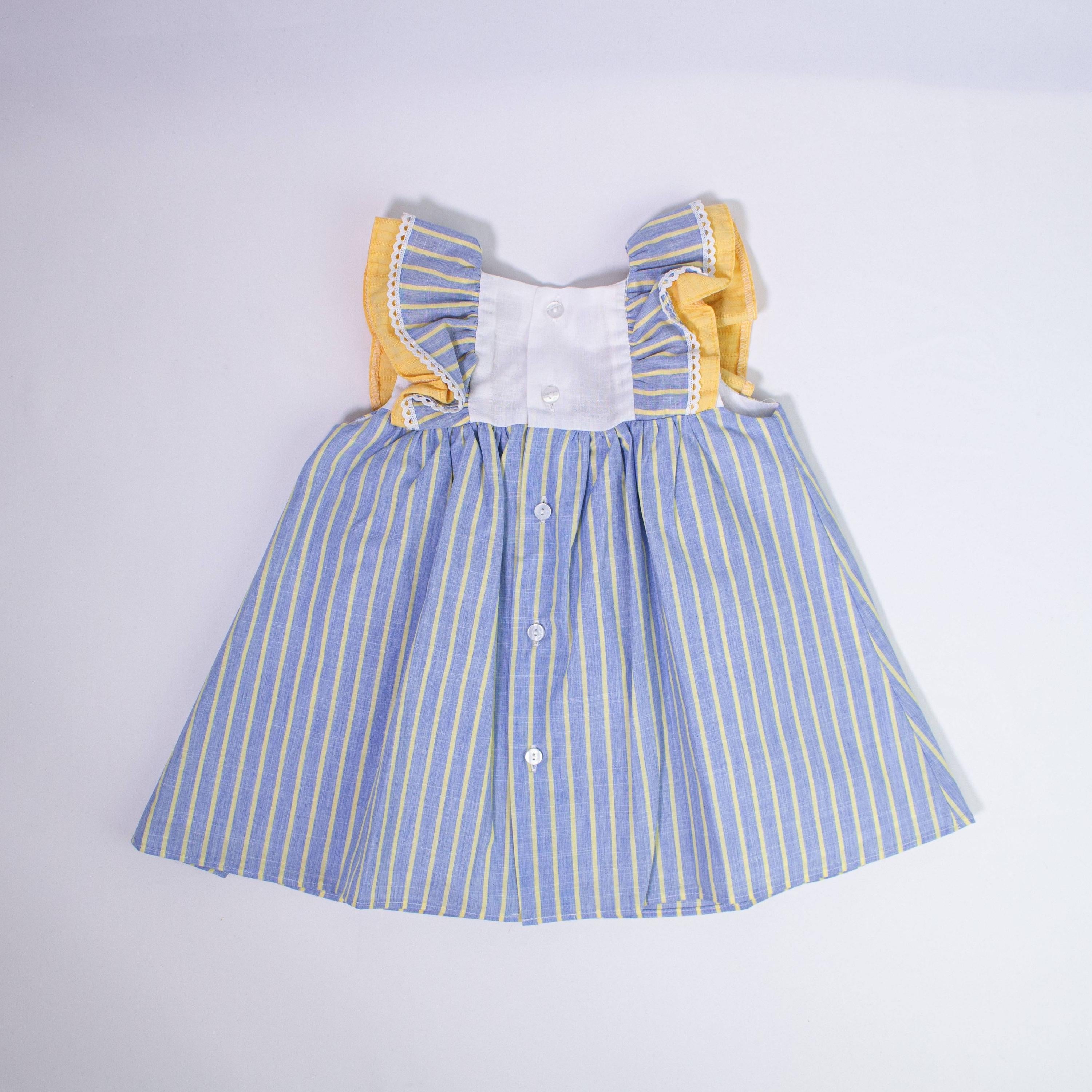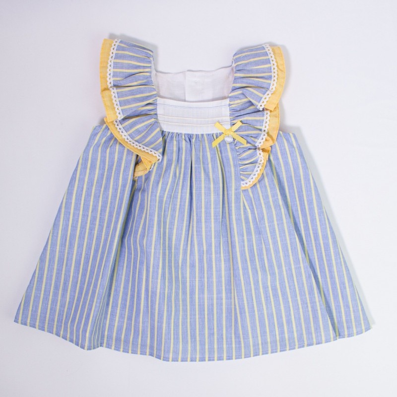 Vestito In Cotone a Righe Celeste e Giallo con Rouche Nelle Maniche e Pizzo Bianco.