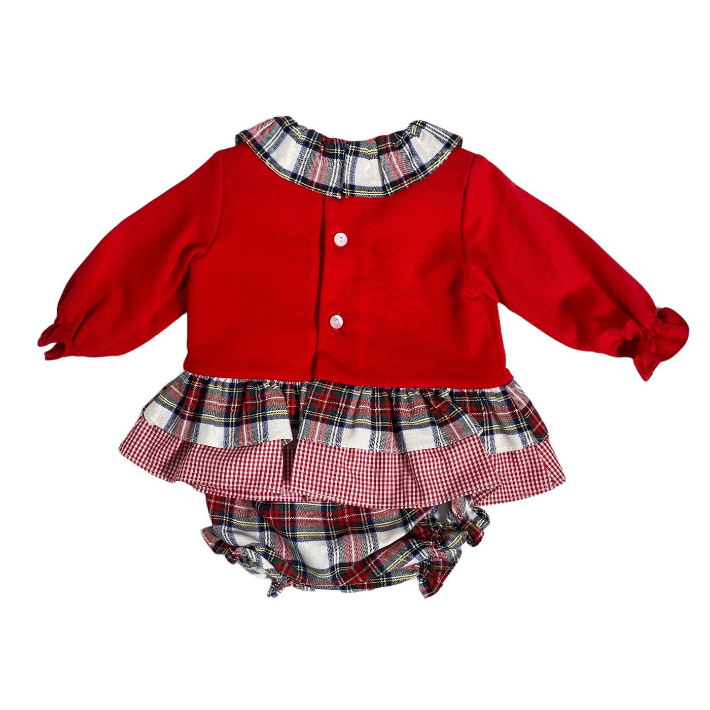 - Roter Pullover im Mailänder Muster mit Tartan-Kontrasten am Rundhalsausschnitt und Volants am Tartan-Unterteil und Karomuster, Öffnung auf der Rückseite mit Knöpfen