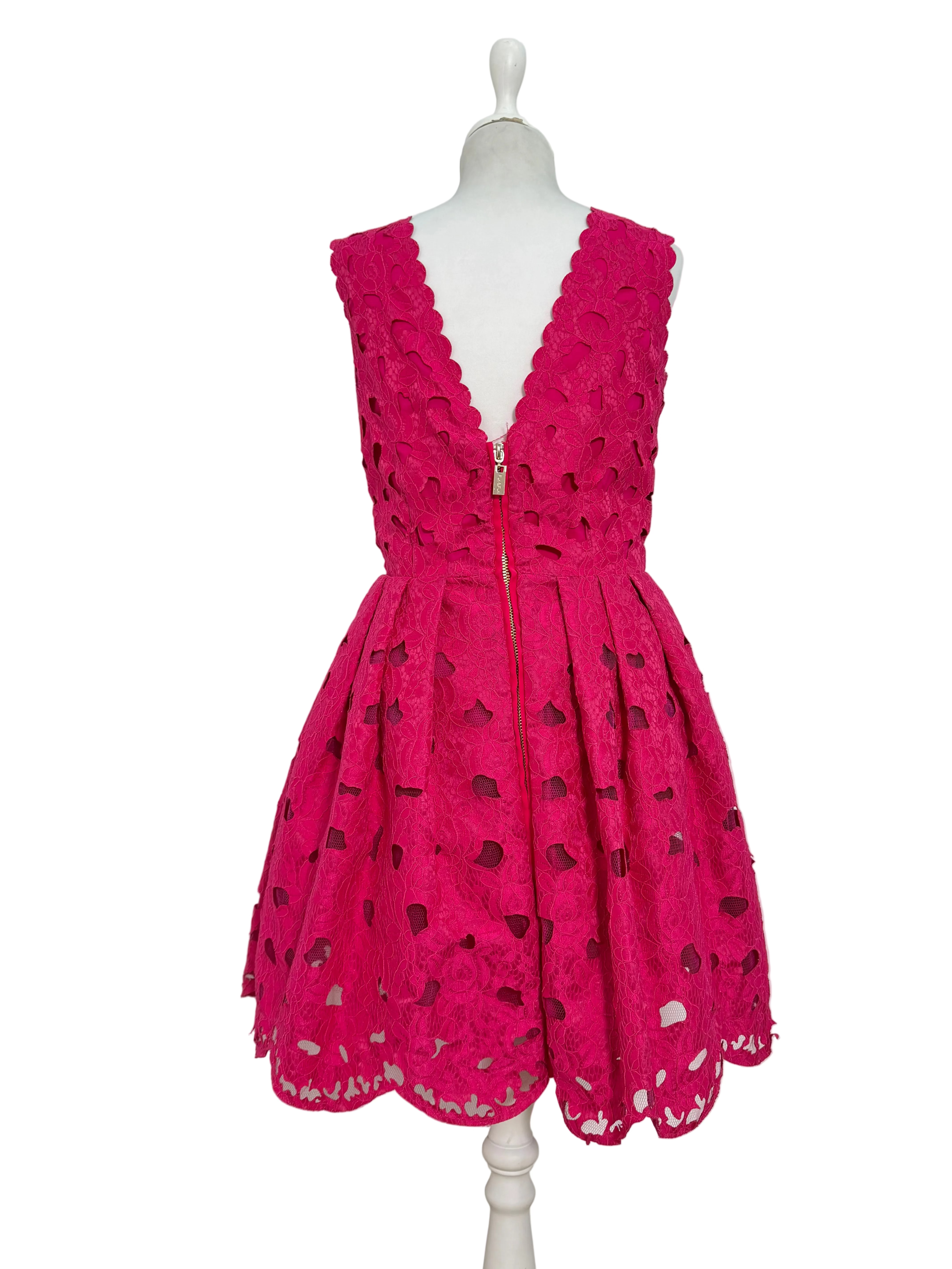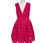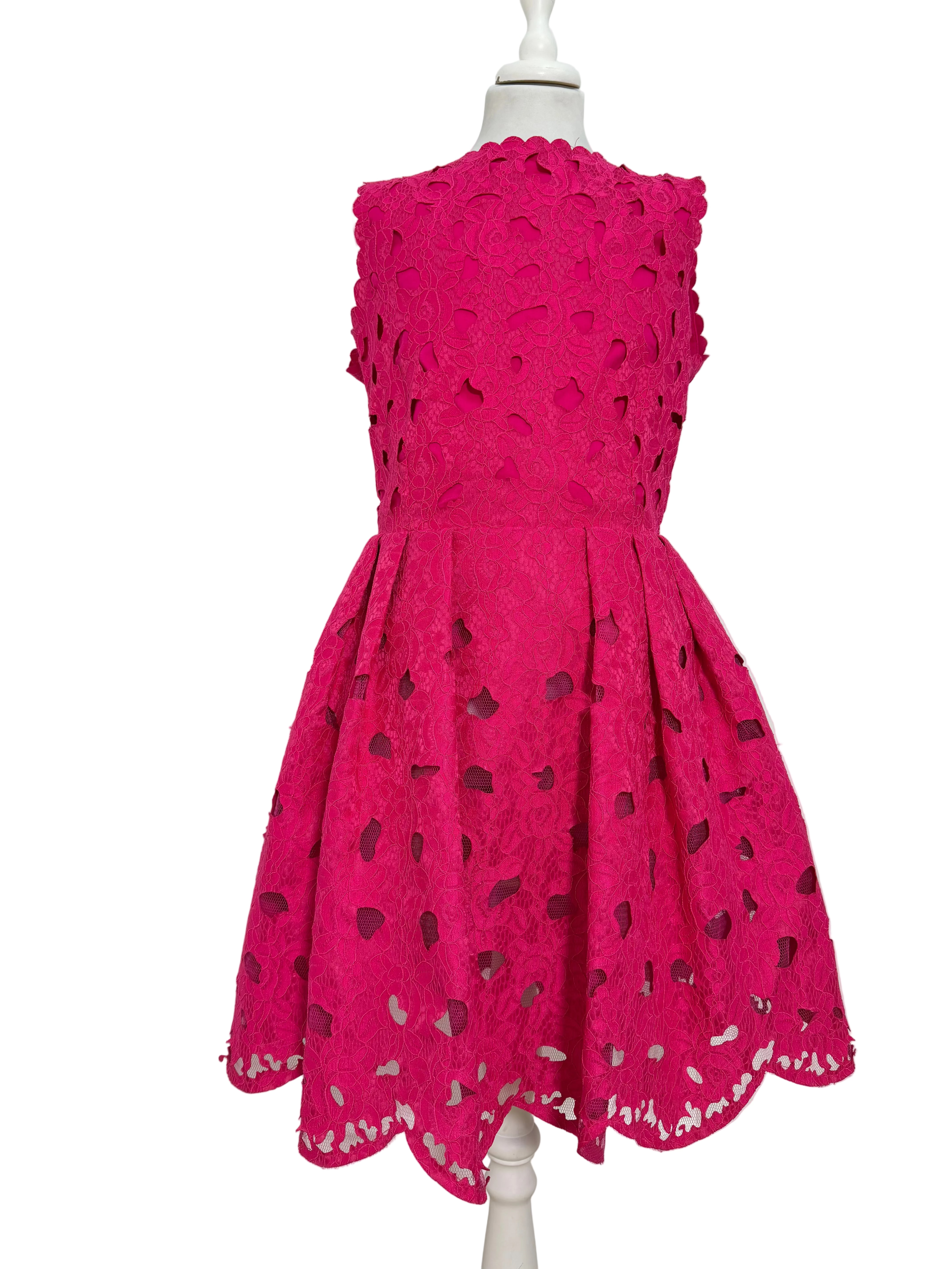 -Elegantes ärmelloses und perforiertes fuchsiafarbenes Kleid in Unifarbe mit geprägter Blumenstickerei