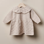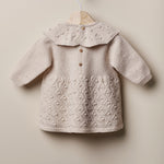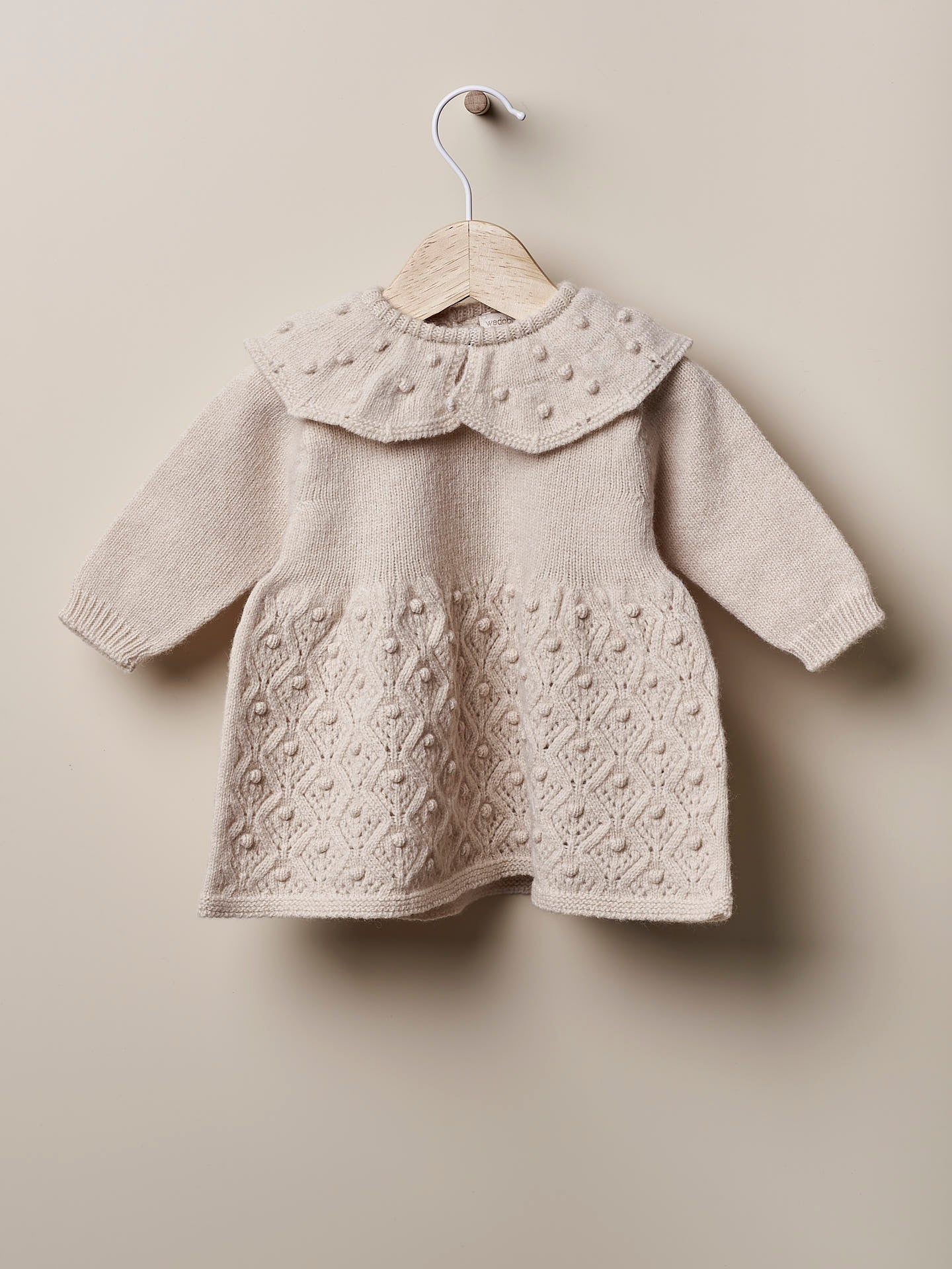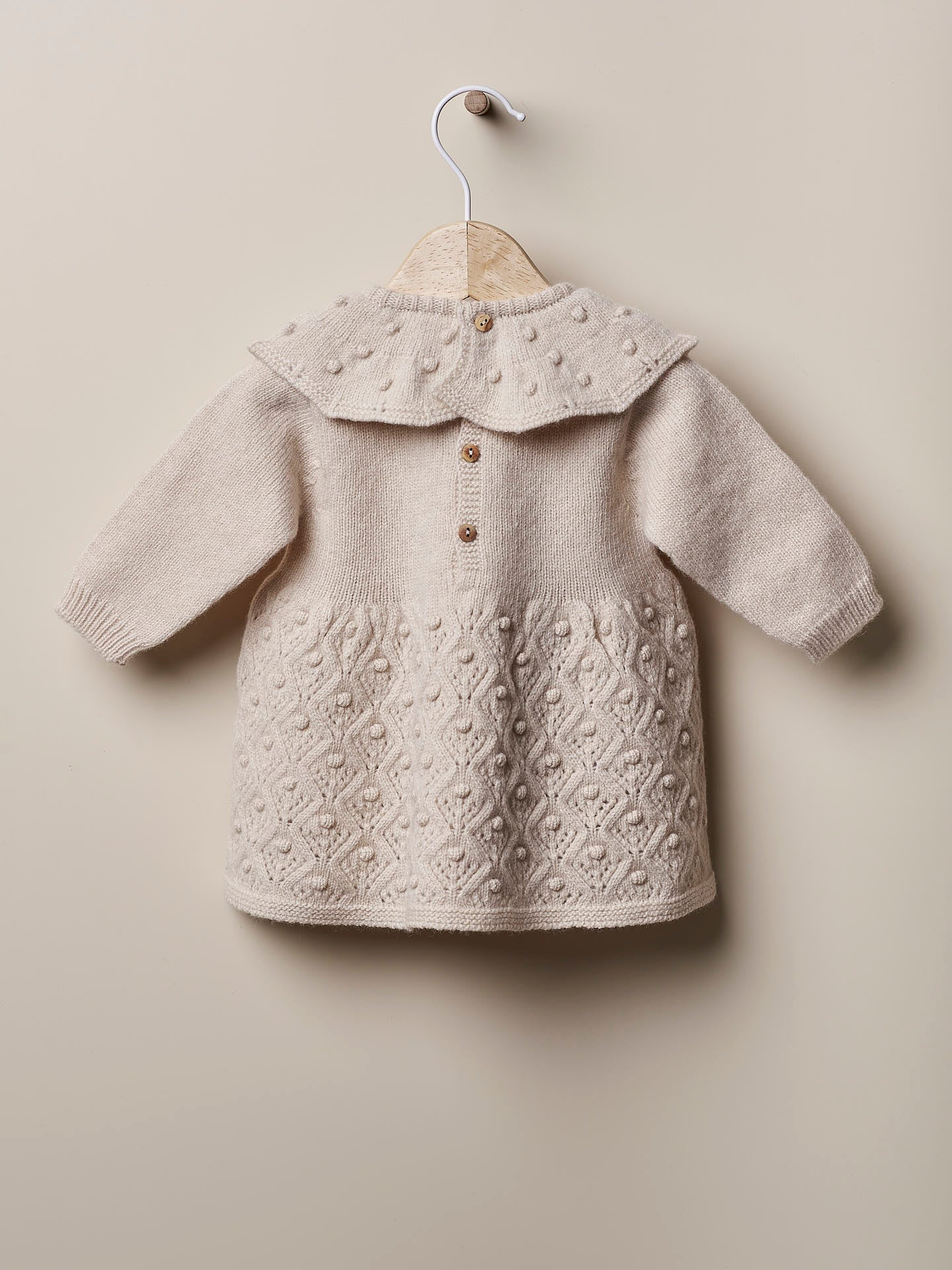 Abito in morbida maglia in misto lana merino e cashmere femminucce. L'abito a maniche lunghe CHRISTMAS TIME è lavorato a maglia con piccoli pompon che esaltano la bellezza e il carattere unico del capo. Si chiude dietro con bottoni in legno.