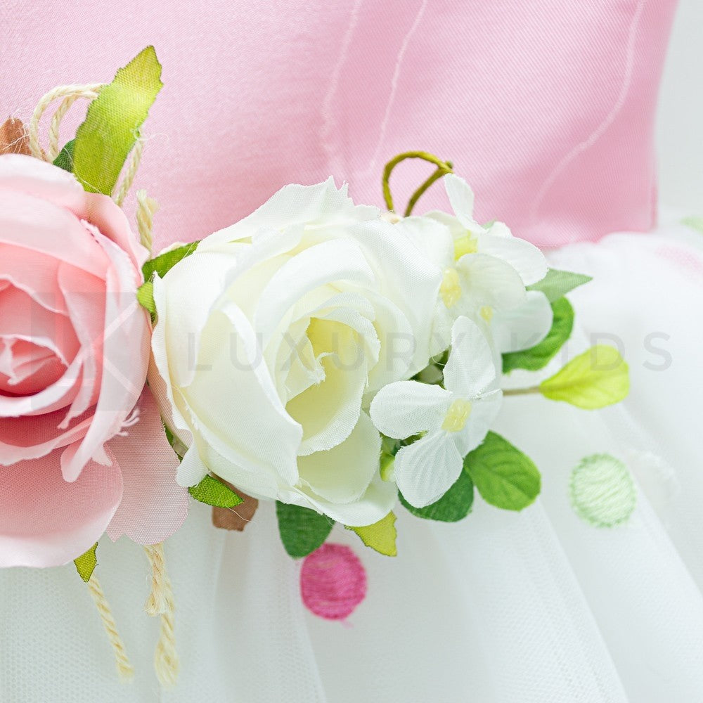 Elegantes ärmelloses Kleid mit Oberteil aus rosafarbenem Satin und Rock aus weißem Tüll, bestickt mit mehrfarbigen Tupfen.