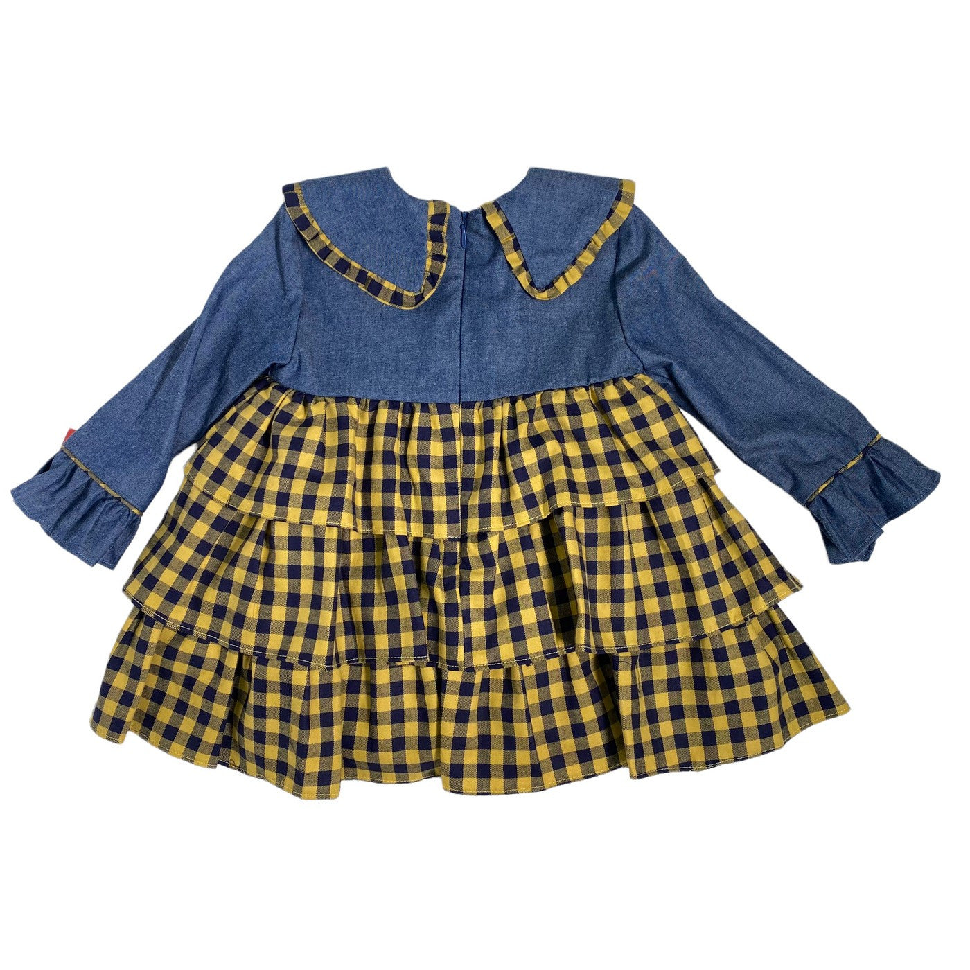 Langärmliges ausgestelltes Kleid aus warmer Baumwolle mit Volants, mit senffarbenen und blauen Karos, Mieder und Kragen aus Denim.