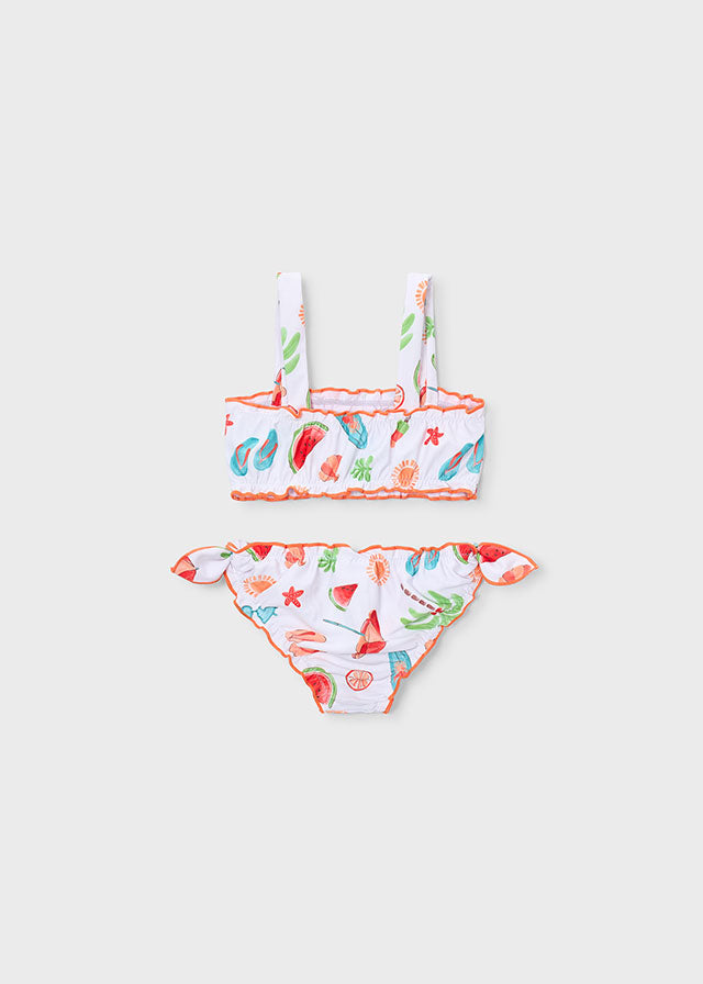 Bikini stampato per bambina della collezione MAYORAL. Design colorato e allegro con stampa vivace, perfetto per le giornate al mare e in piscina. Realizzato con materiali di qualità che garantiscono comfort e resistenza al cloro. Pratico da indossare e facile da lavare, ideale per le piccole nuotatrici che amano stile e divertimento.