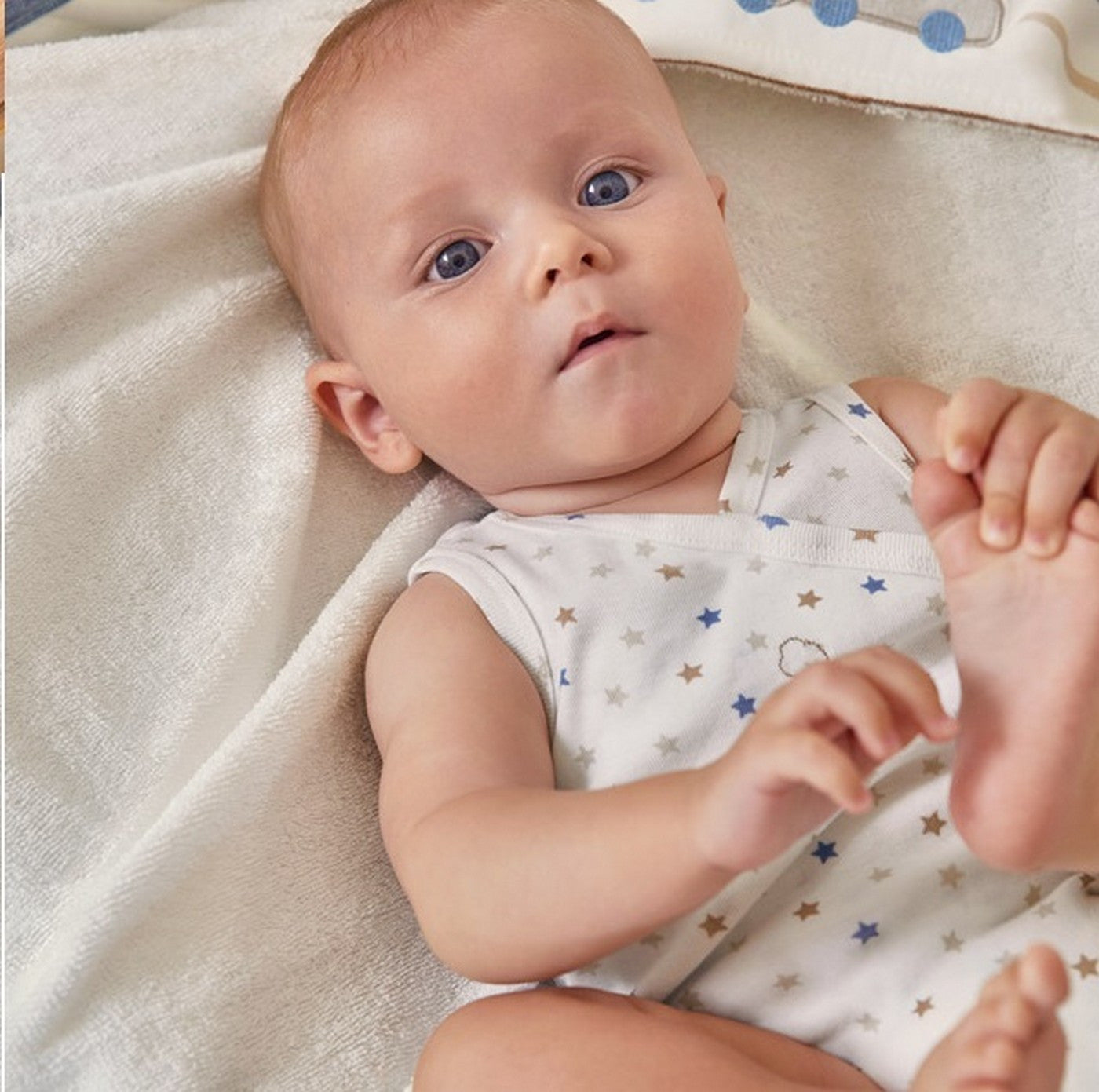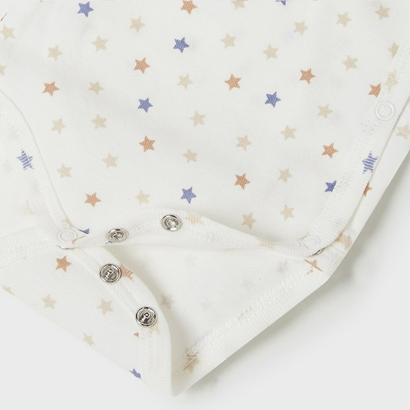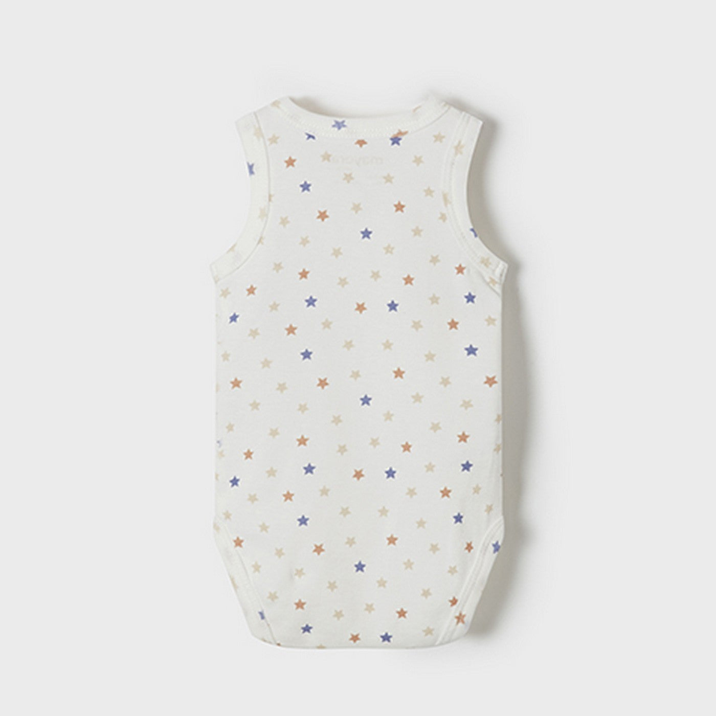 Ärmelloser Body aus weißer Baumwolle mit beigem und blauem Sternenmuster.