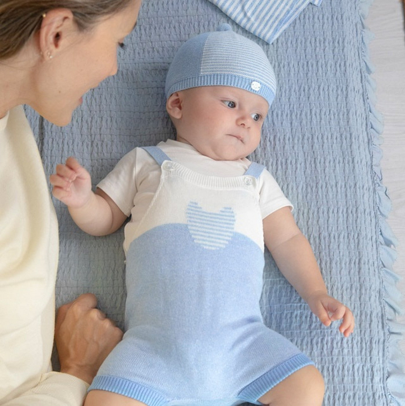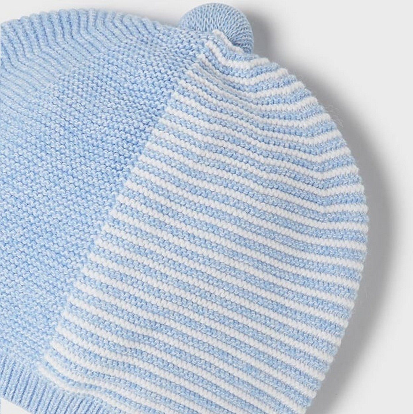 Hellblauer Baumwollfadenhut mit einfarbiger linker Seite und weiß gestreifter rechter Seite.