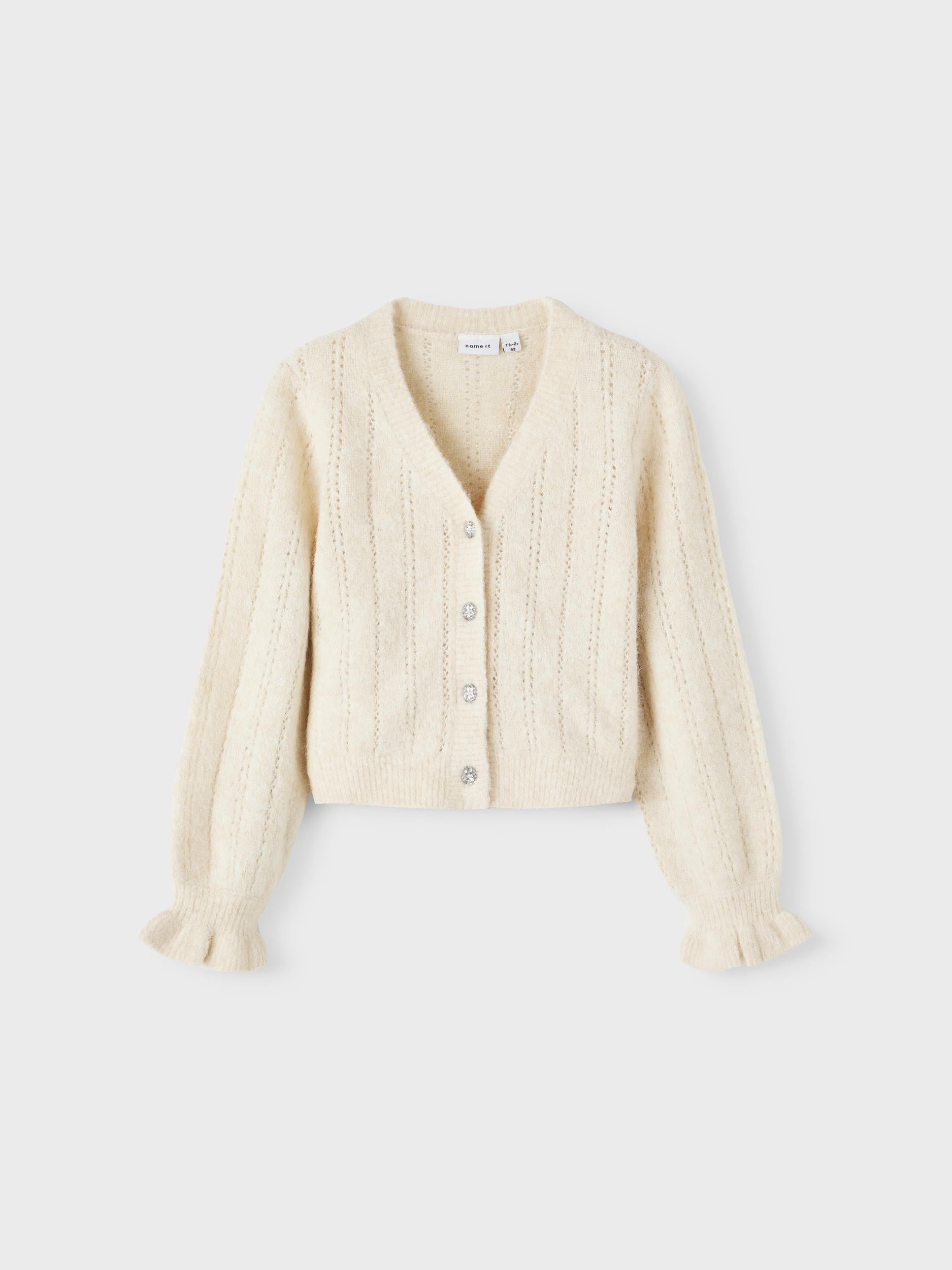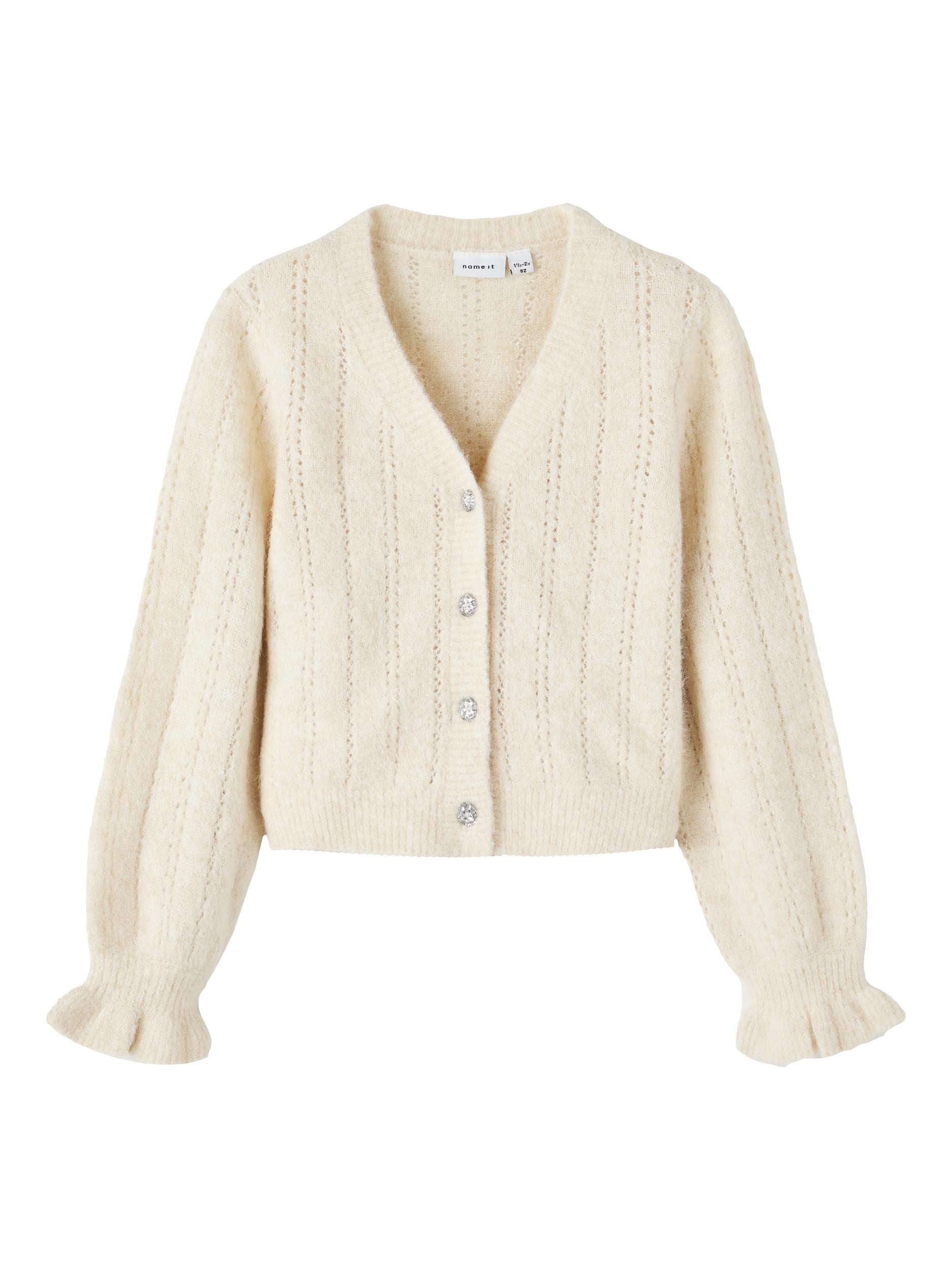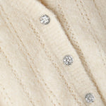 Einfarbiger Cardigan aus Wollmischung mit Perforationen und juwelenartigen Knöpfen.