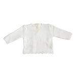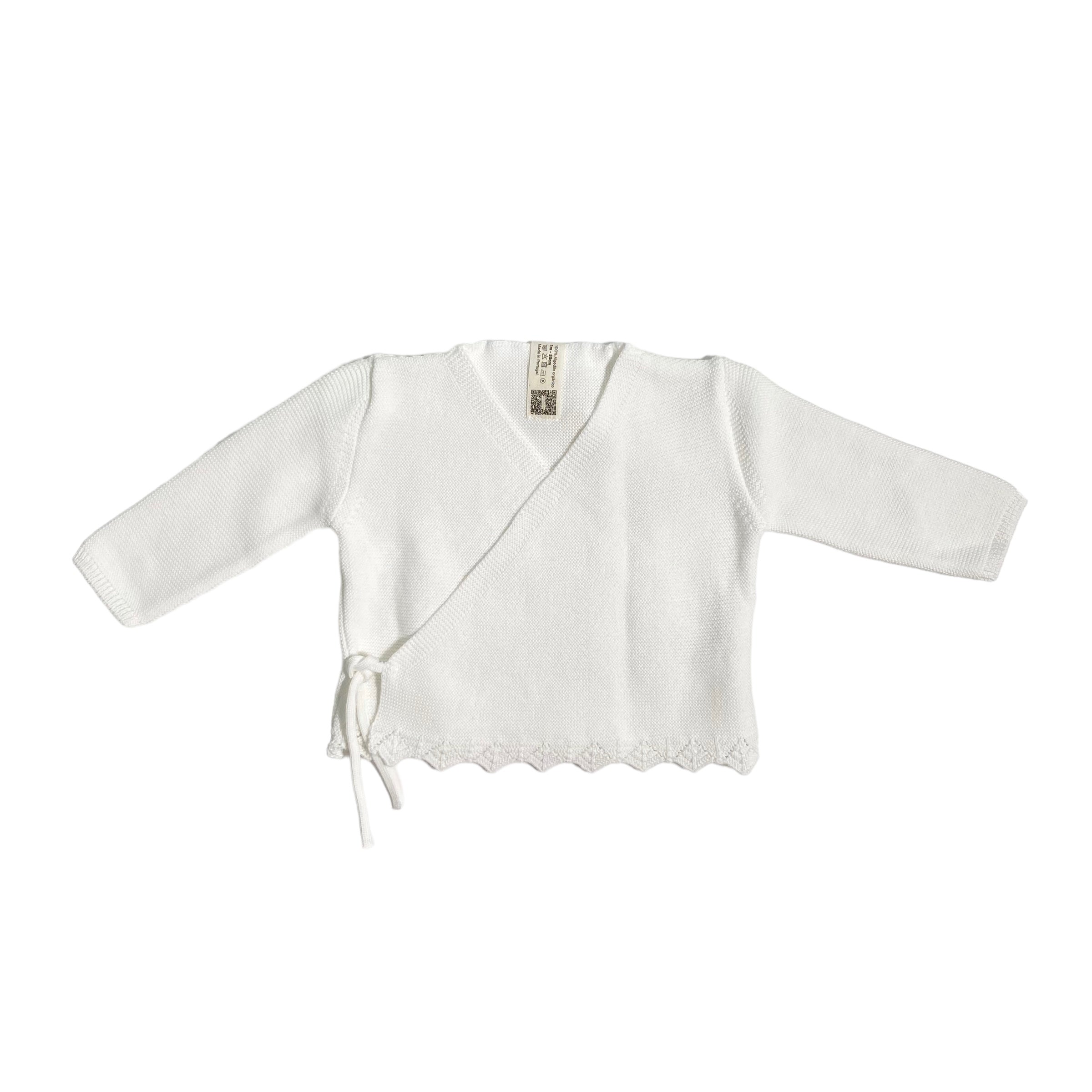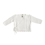 Strickjacke aus warmer Bio-Baumwolle, gekreuzt, mit Spitzenverschluss und Zick-Zack-Saum.