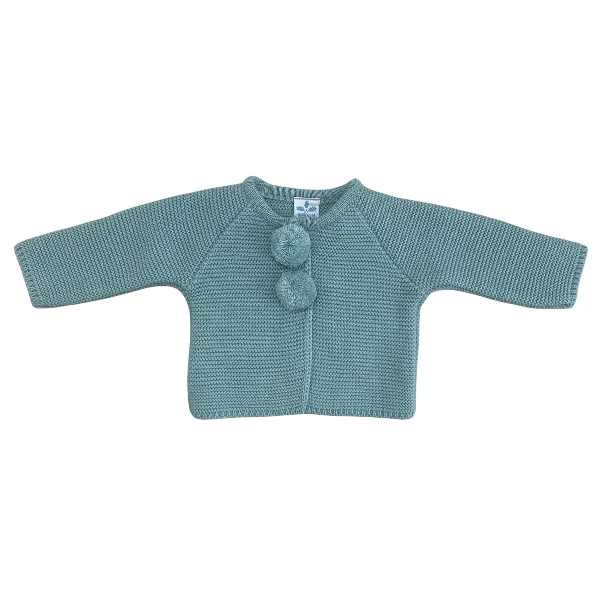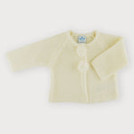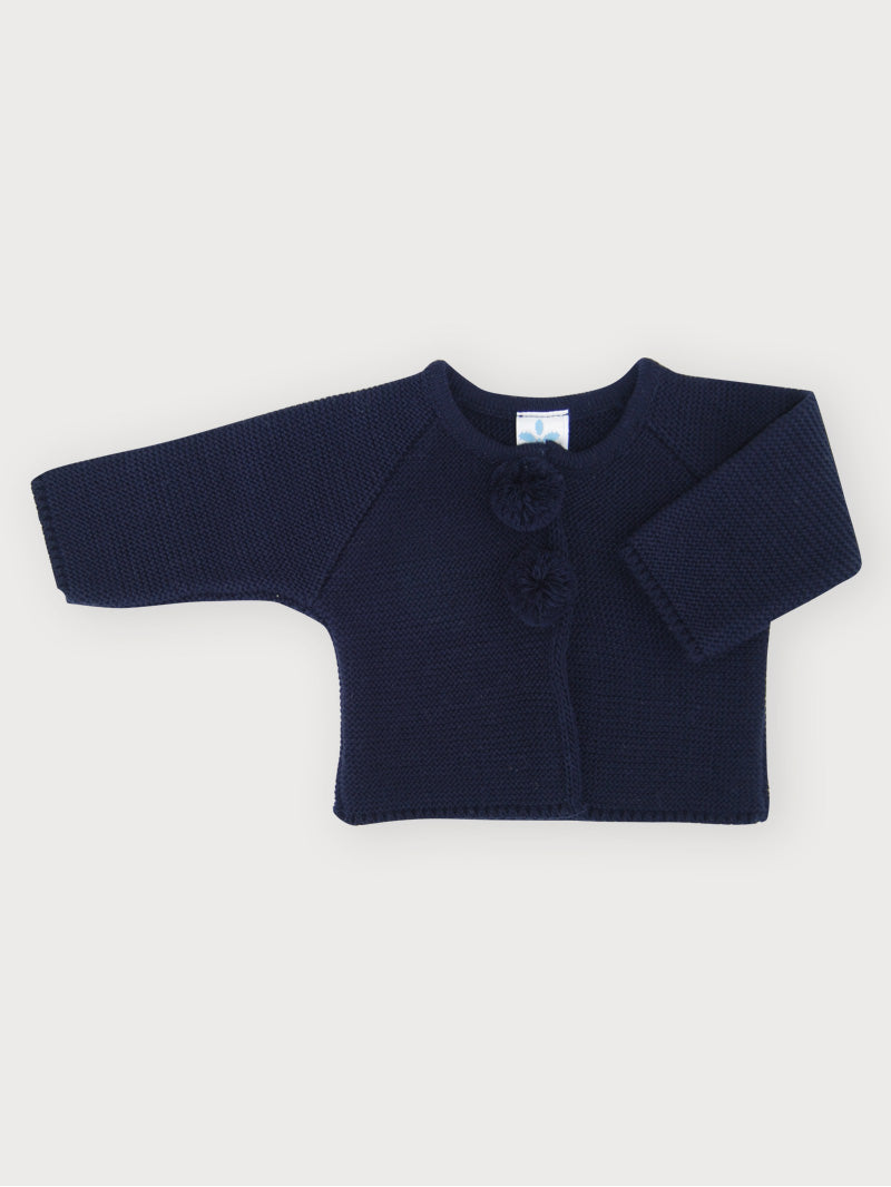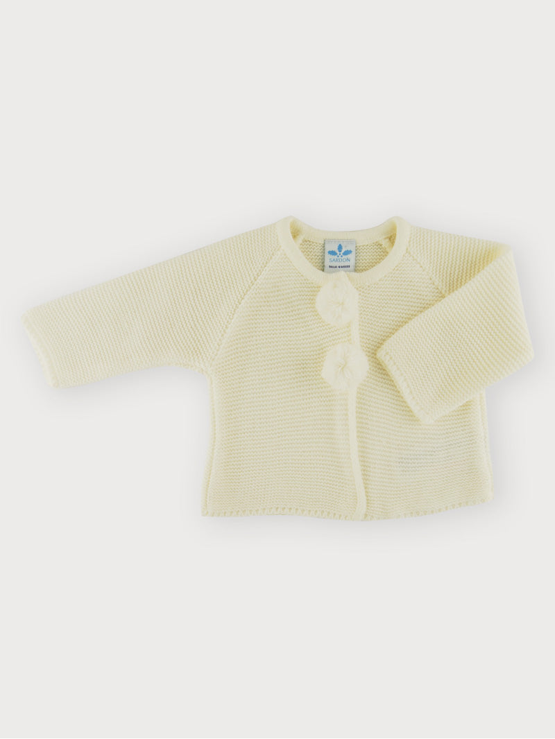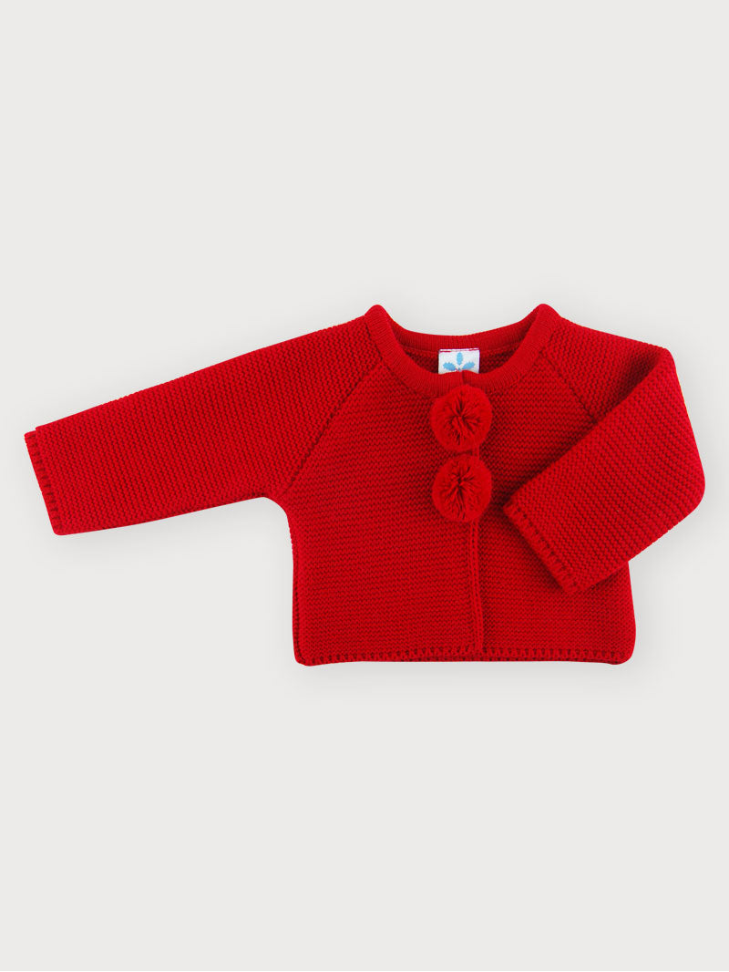 Strickjacke aus hypoallergenem Acrylgewebe, einfarbig, mit Bommel auf der Vorderseite und Verschluss mit zwei Knöpfen.
