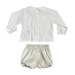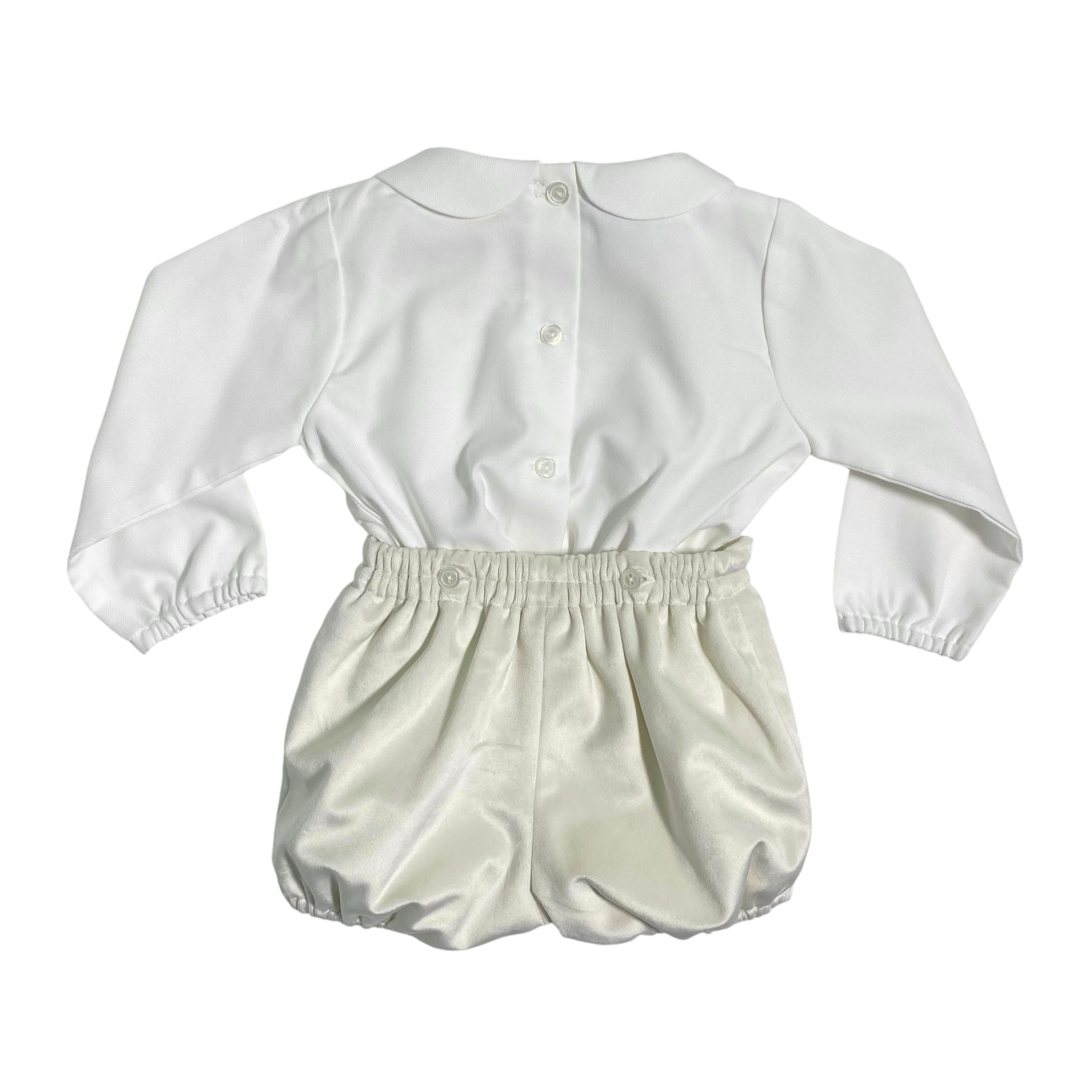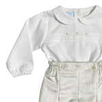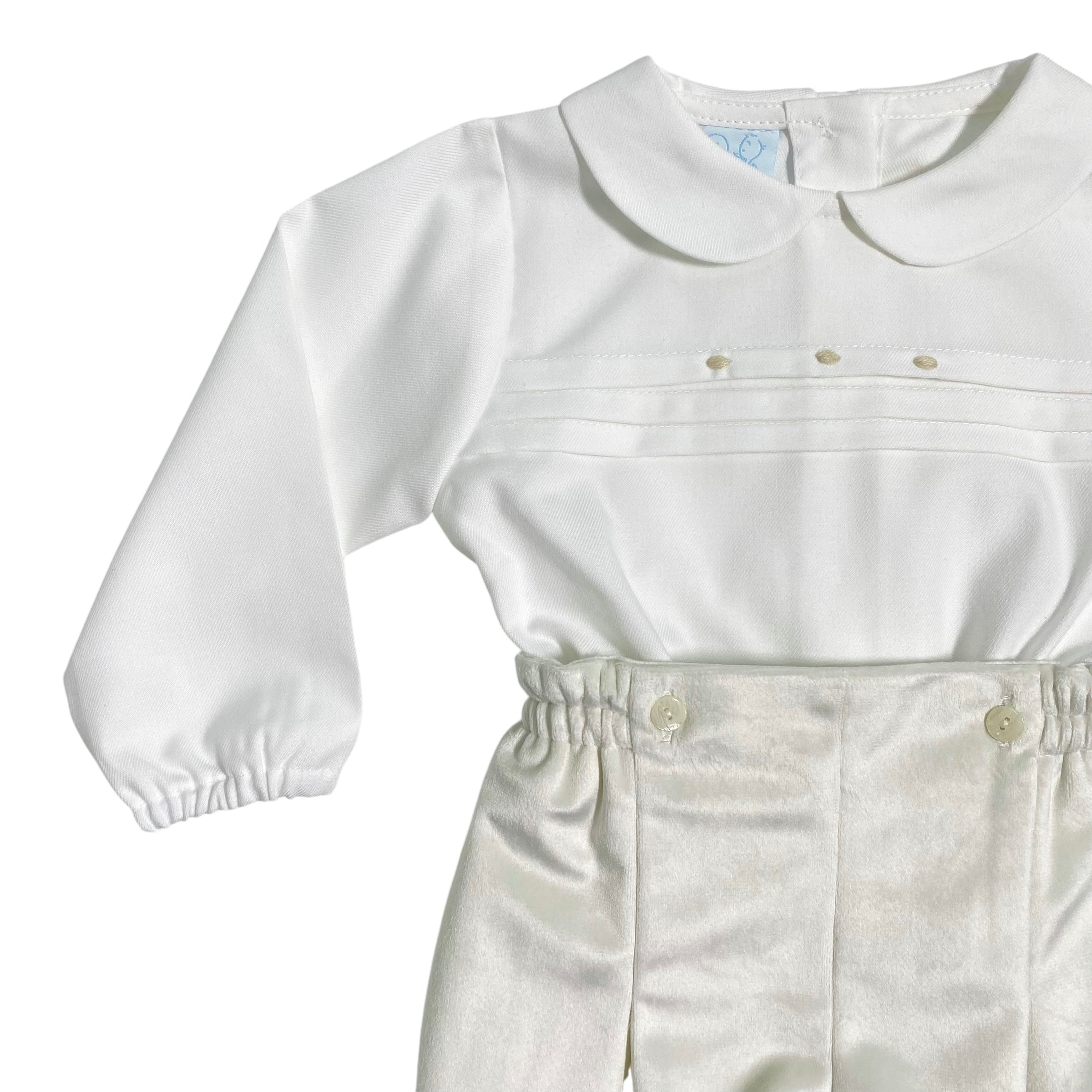 -Langarmshirt (Creme) aus warmer Baumwolle mit Rundkragen, elastischen Manschetten, Falten vorne mit kontrastierender beiger Stickerei, Rückenverschluss mit Knöpfen.