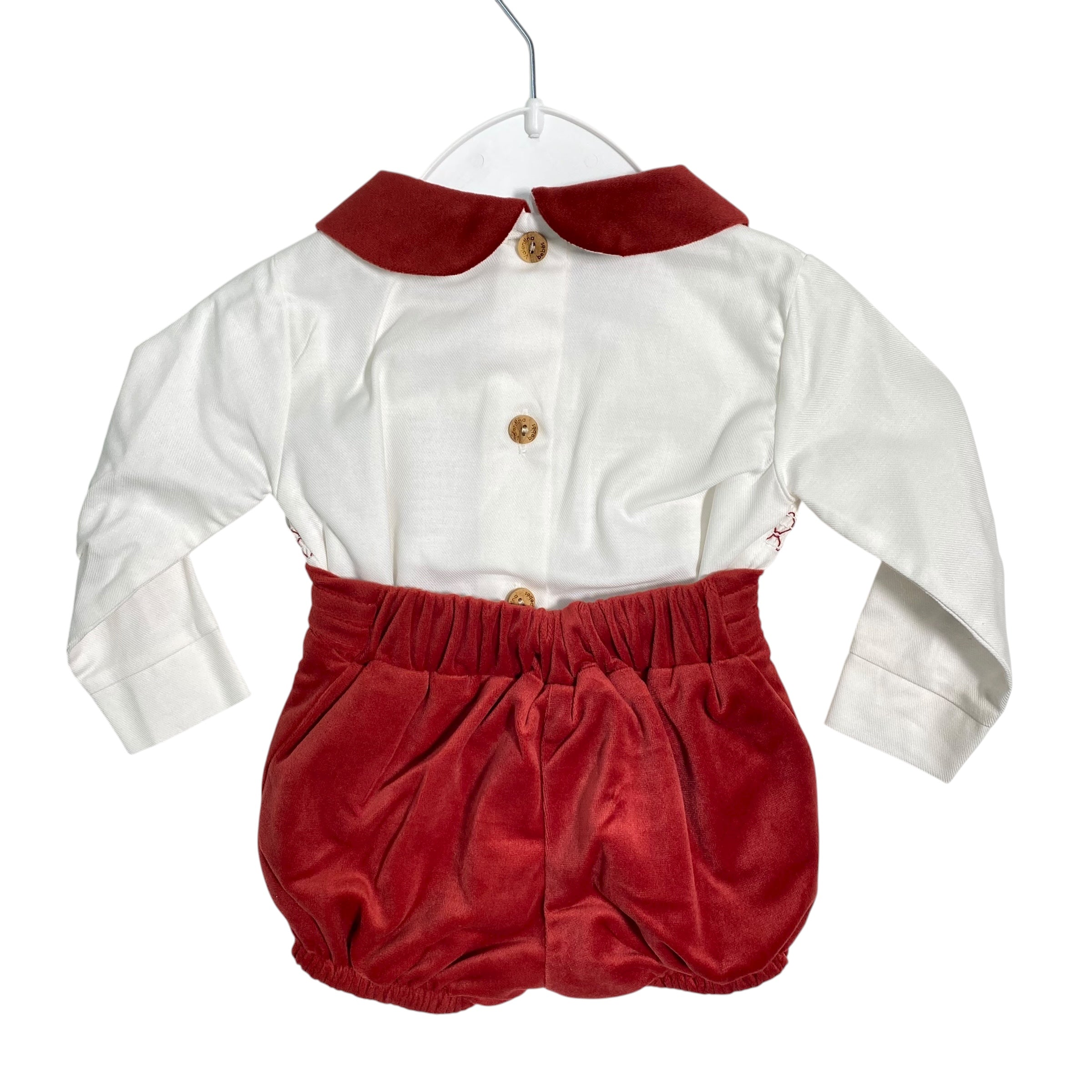 Completo natalizio raffinato per neonato composto da bermuda in velluto morbido e camicia in caldo cotone con elegante punto smoke e colletto in velluto. Un insieme sofisticato pensato per le occasioni festive, che unisce comfort e stile. La qualità dei materiali garantisce morbidezza sulla pelle delicata del bambino, mentre i dettagli ricercati lo rendono perfetto per celebrazioni speciali e momenti importanti.