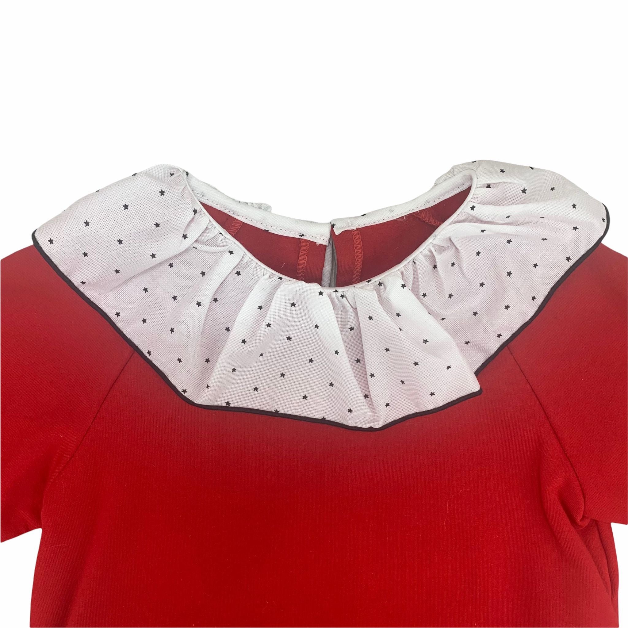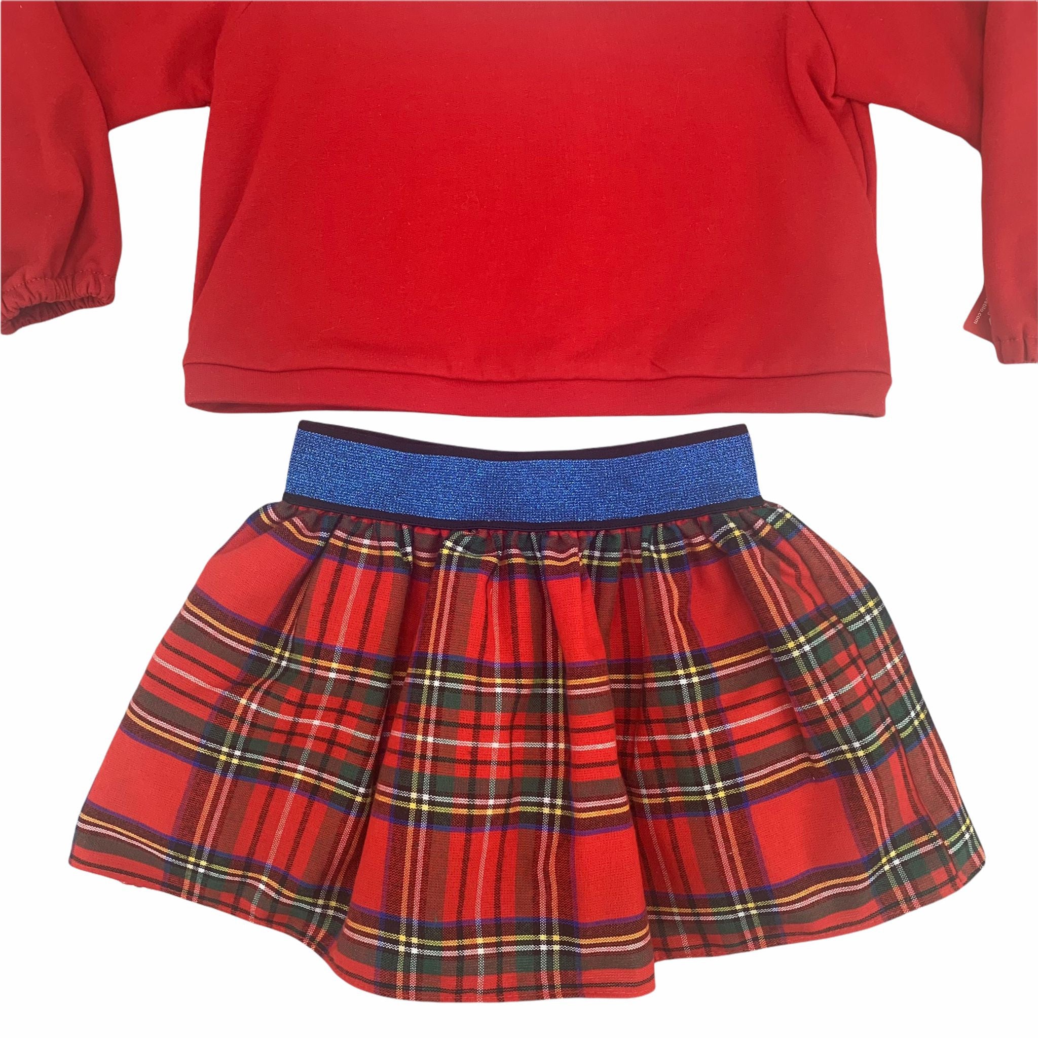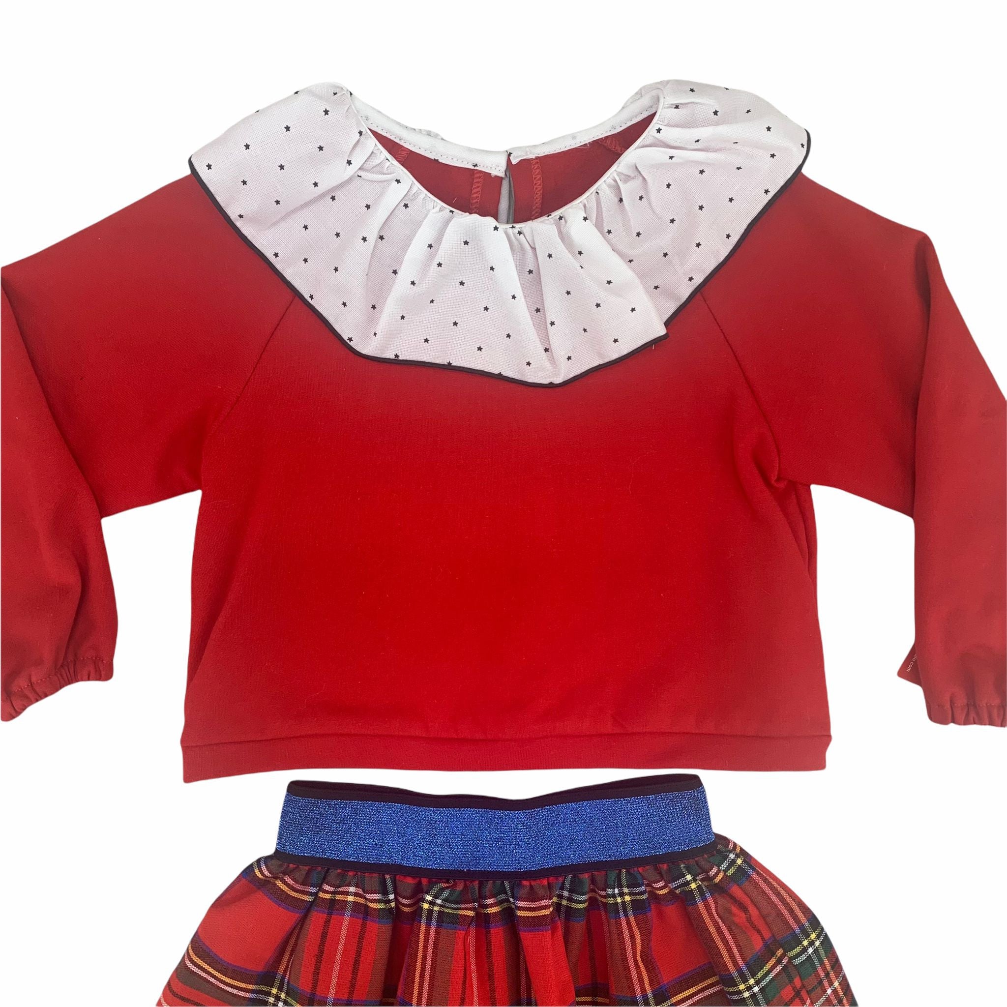 Komplett mit Schottenmusterrock mit elastischer Taille und weißem T-Shirt mit rundem Halsausschnitt mit Sternmuster, langen Ärmeln mit Gummizug am Handgelenk und Rückenverschluss.