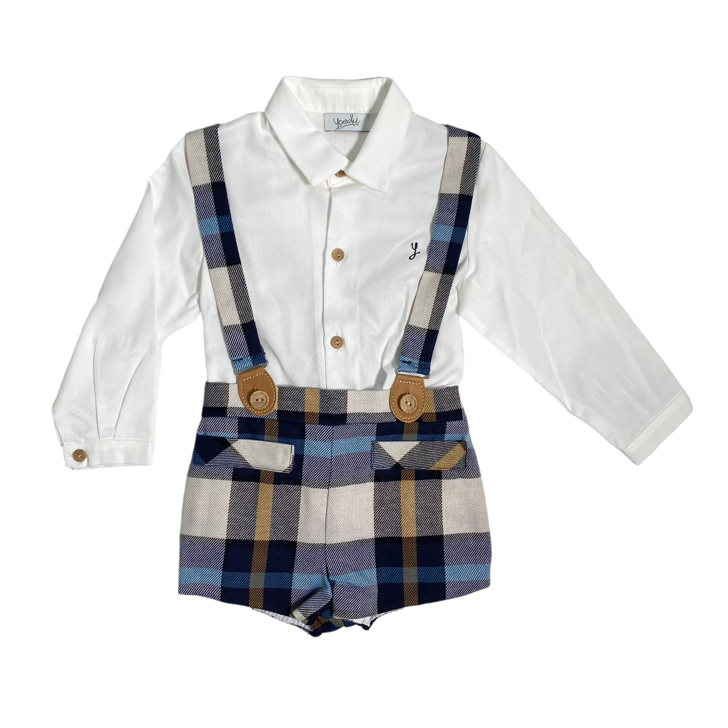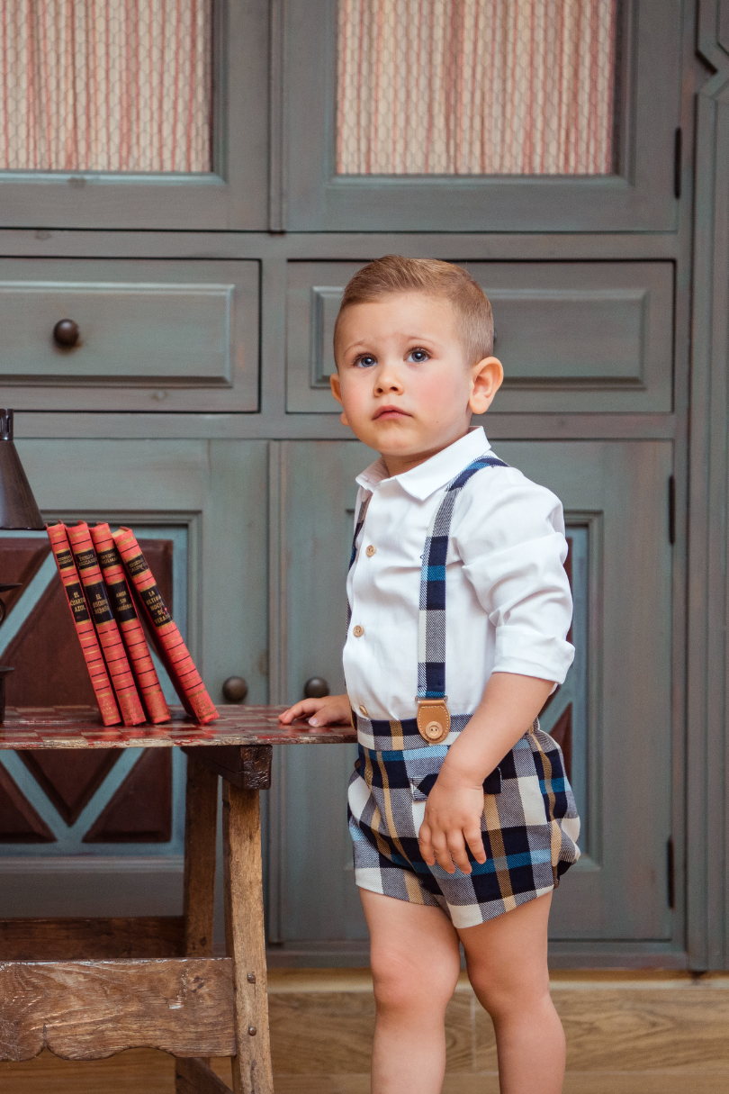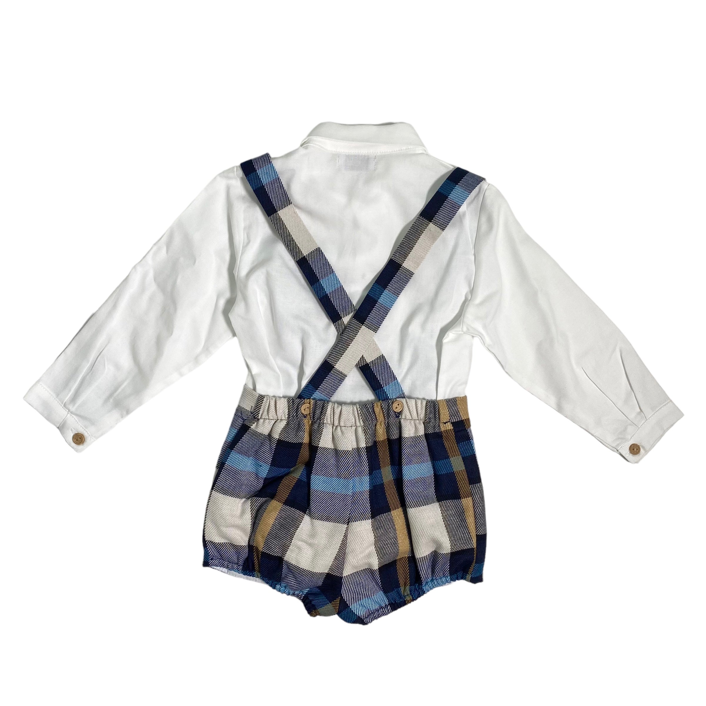 Warmer Baumwollanzug, mit karierter Latzhose mit Hosenträgern und schlichtem weißem Hemd mit Holzknöpfen.