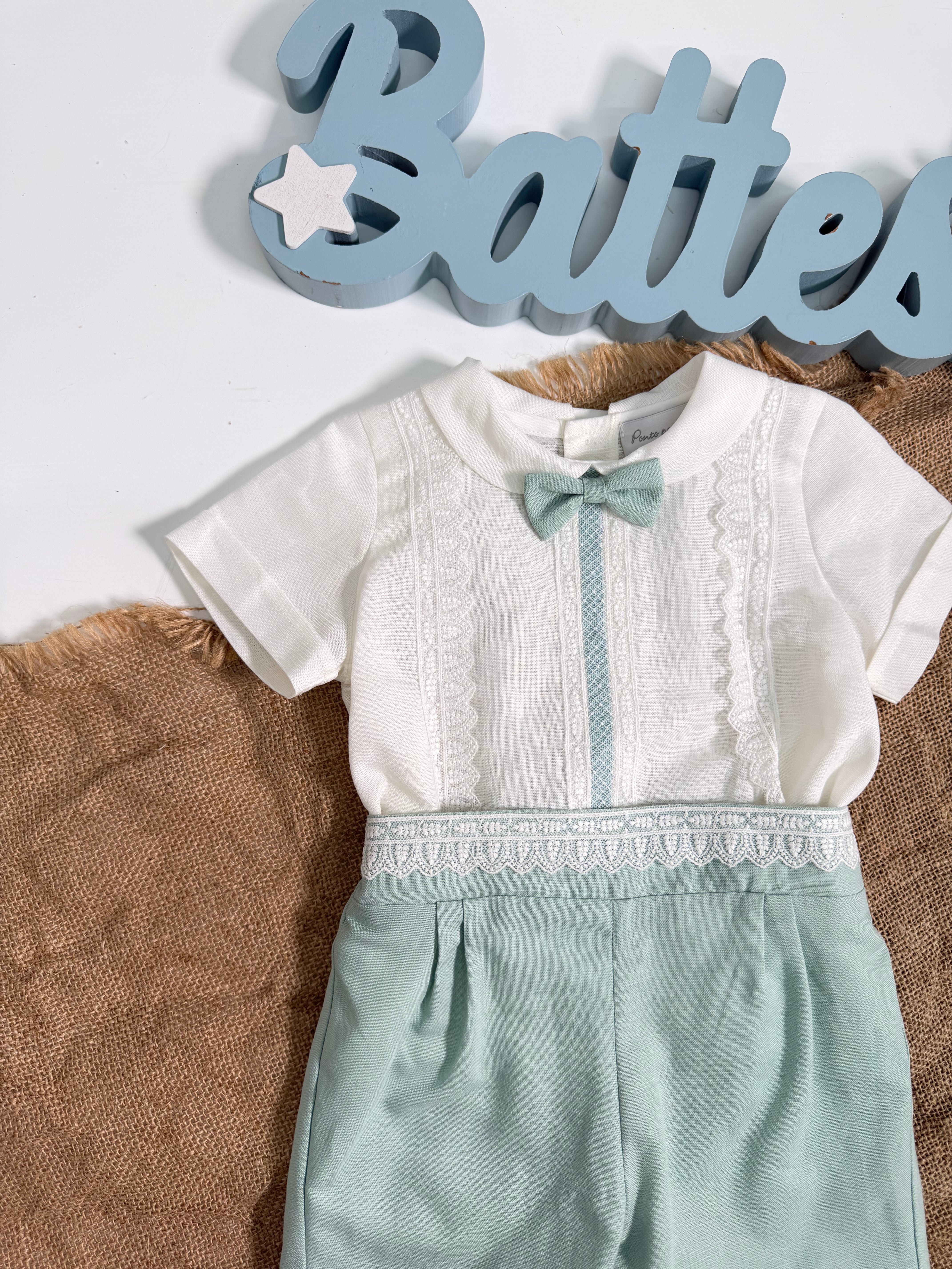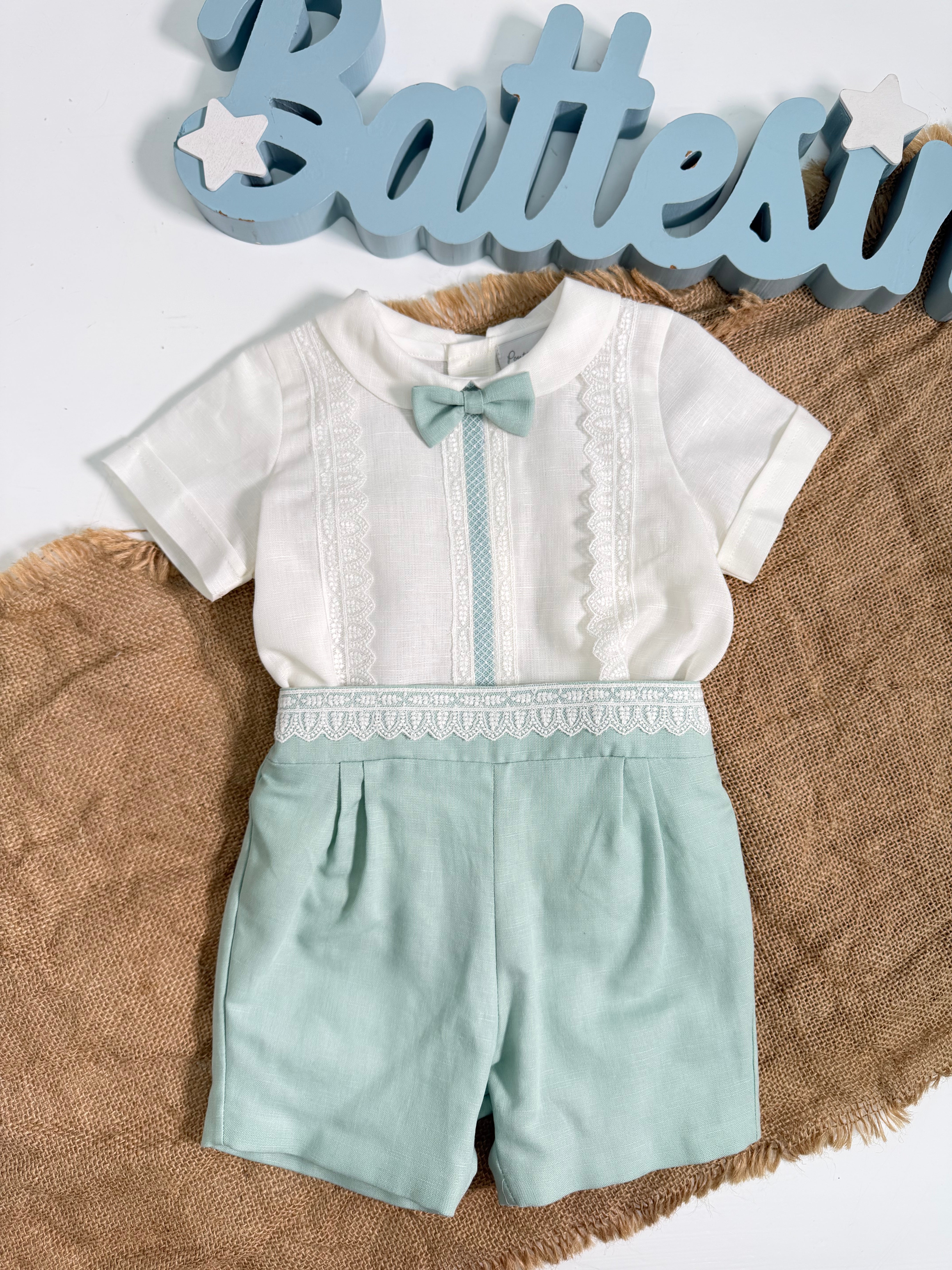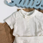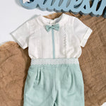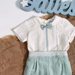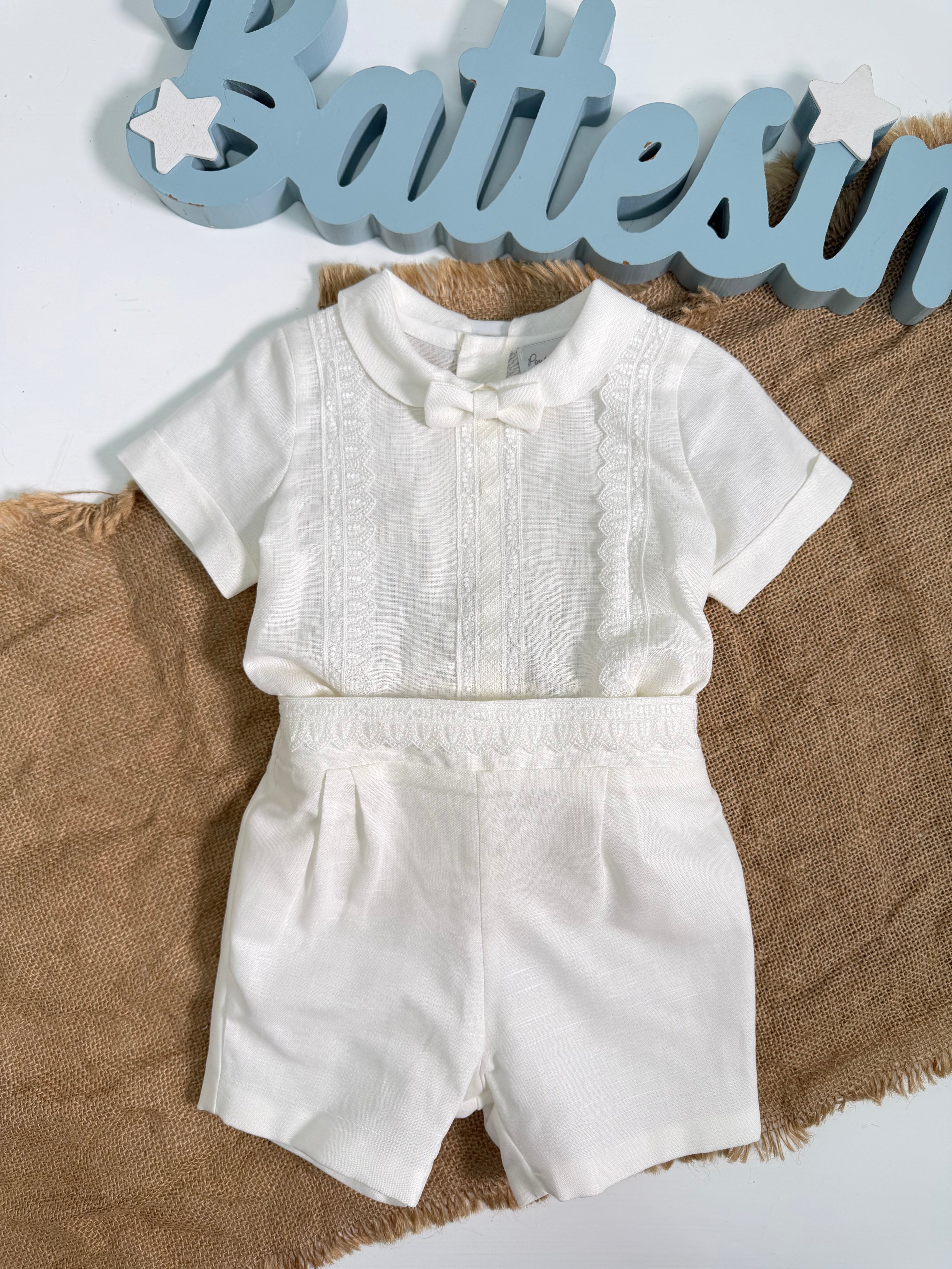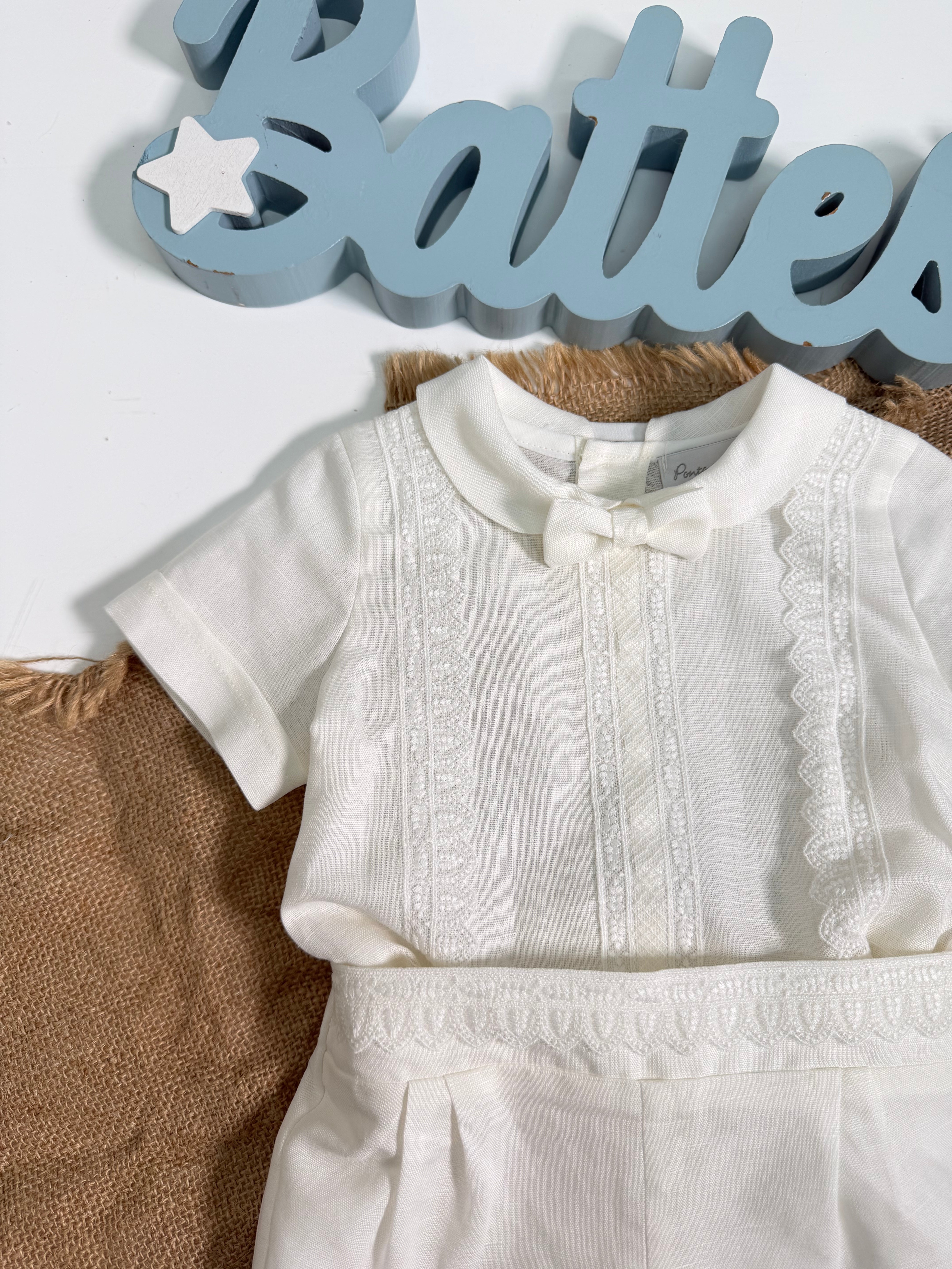 Questo elegante completo in lino è perfetto per le occasioni speciali del tuo neonato. Il bermuda e la camicia mezza manica in lino sono impreziositi con applicazioni di pizzo sul davanti. Completa il look con il papillon abbinato per un tocco di stile.