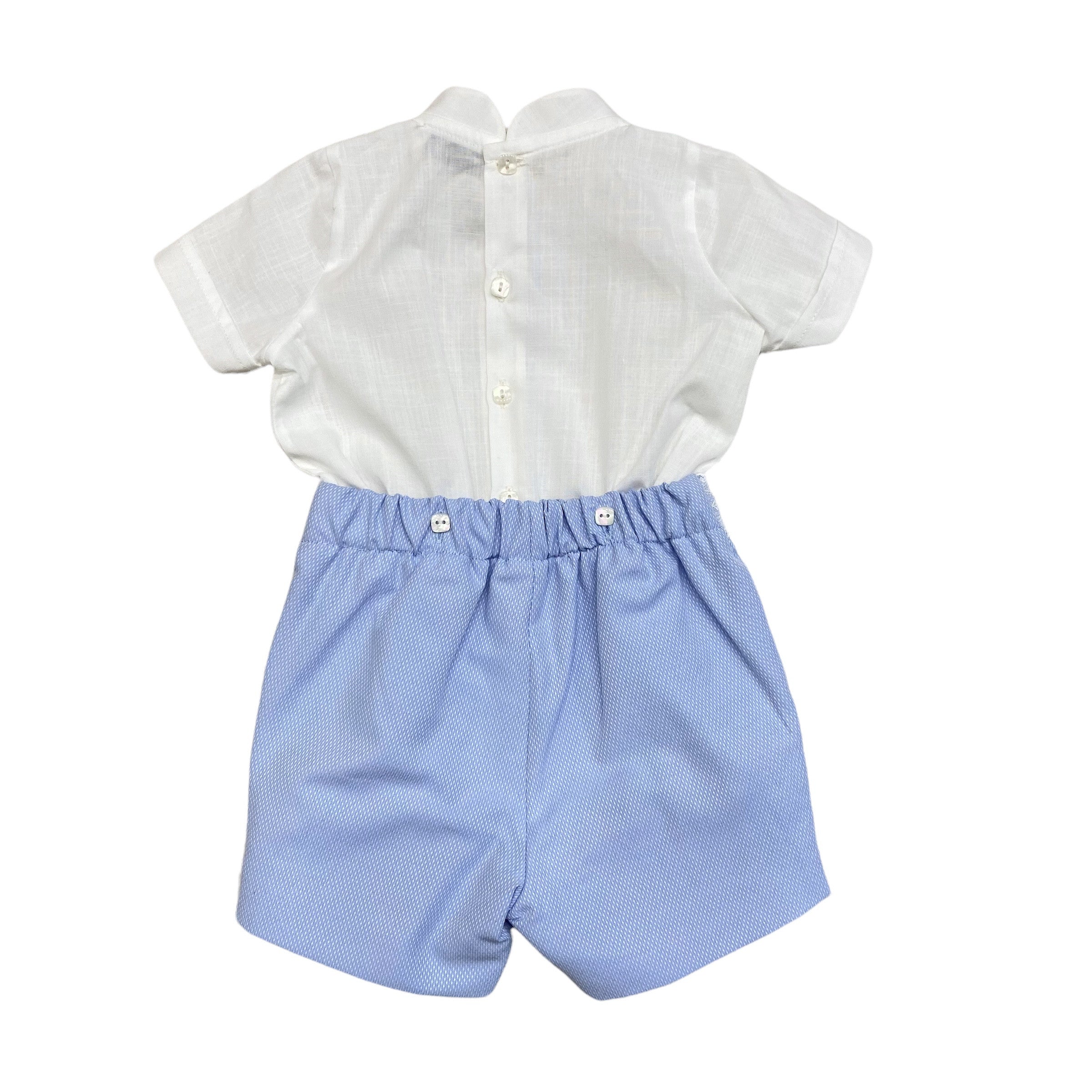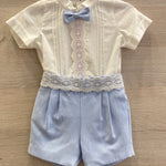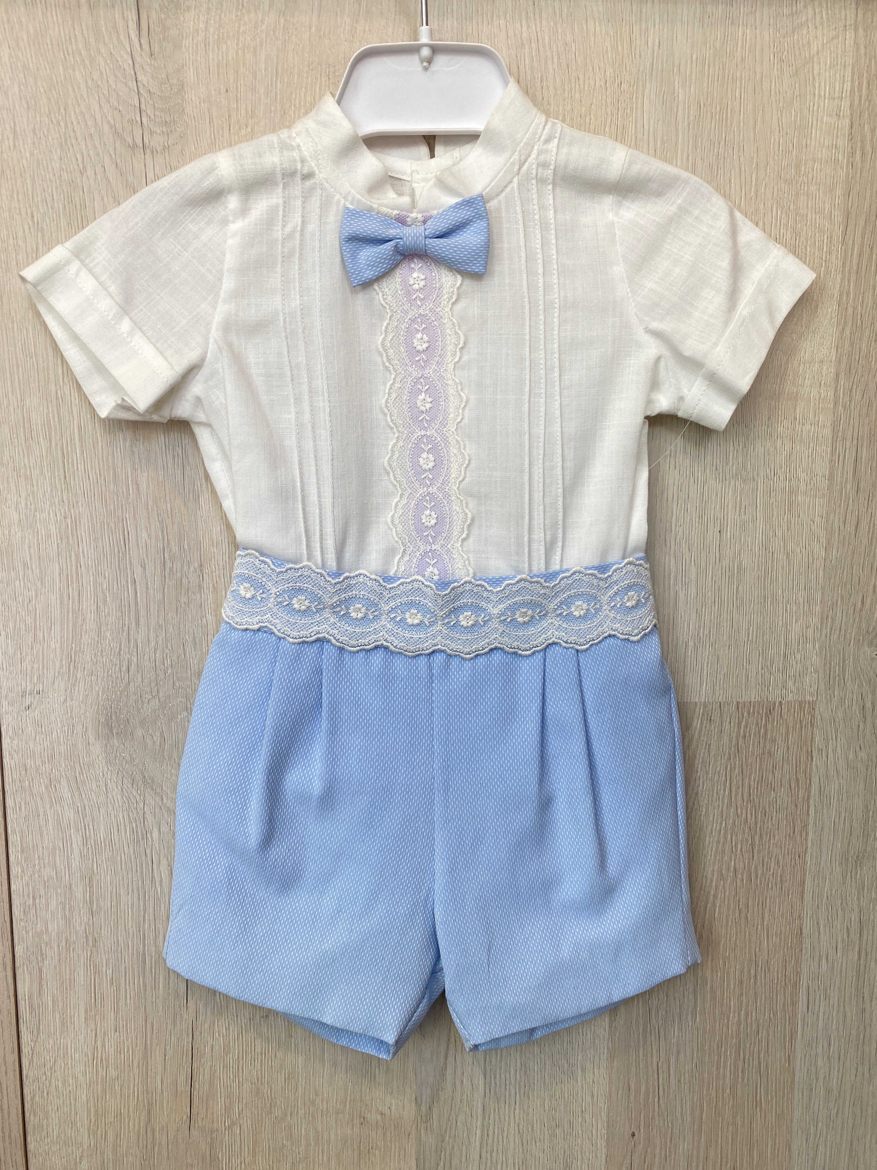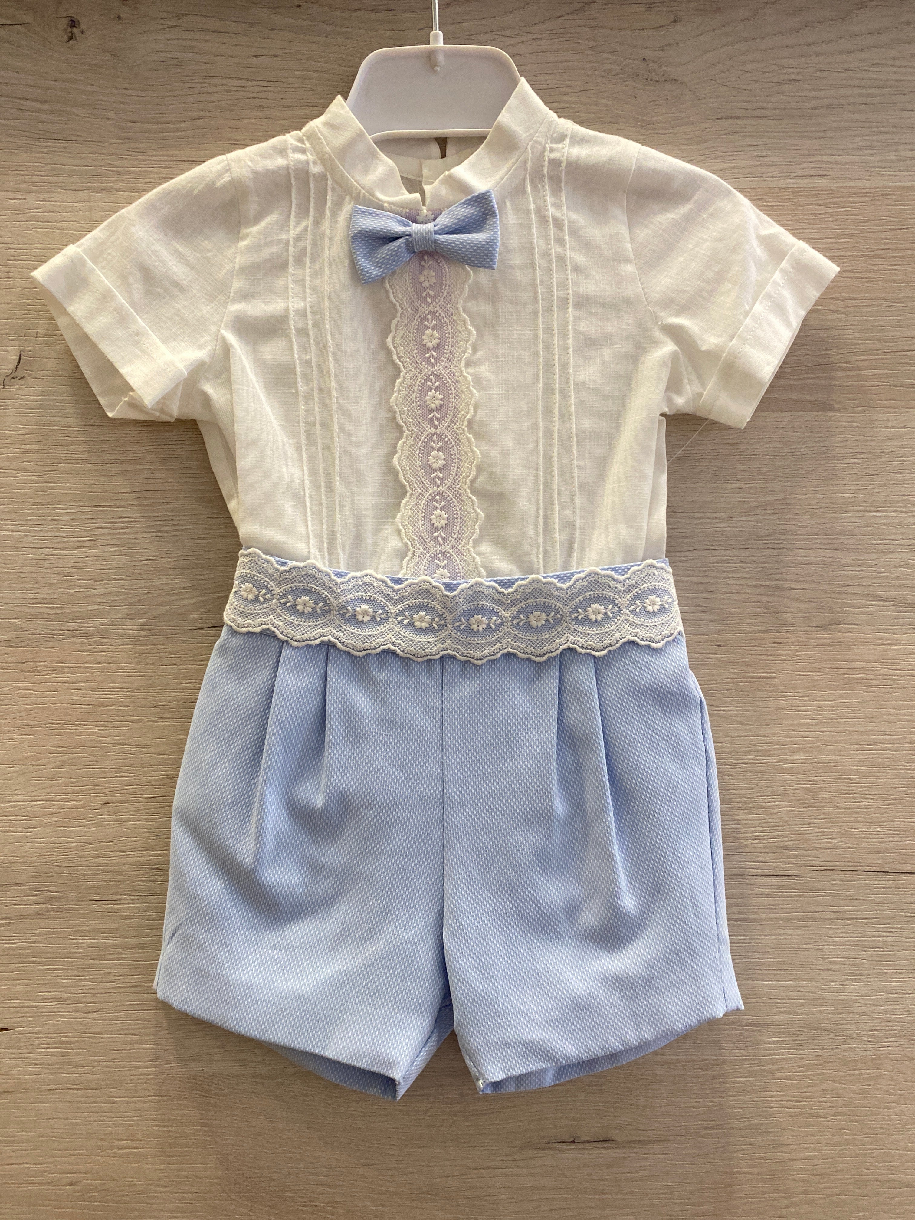 Hellblaue kurze Shorts, deren Taille mit der gleichen Spitzenverarbeitung wie das Hemd verziert ist. Die Shorts sind alle weiß gepunktet. Das Hemd wird mit den Shorts mit Innenknöpfen gebunden, die zu einem eleganten und schönen Strampler werden können.