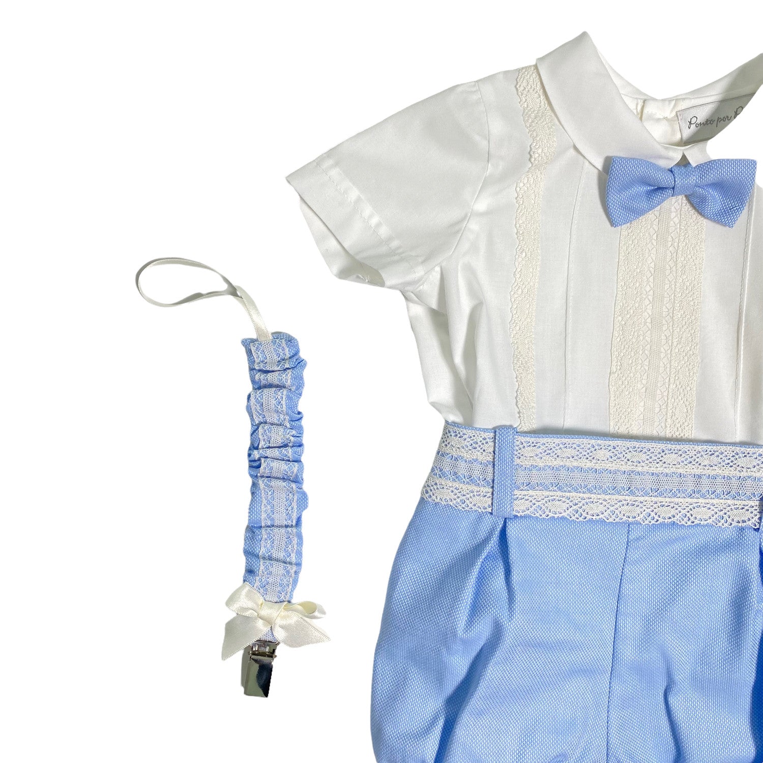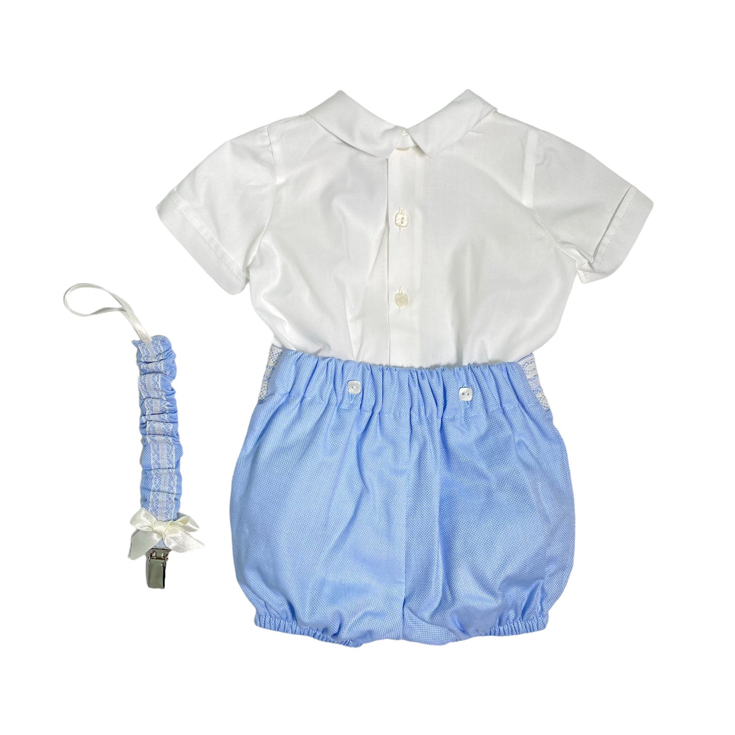 Hellblaue kurze Shorts, deren Taille mit der gleichen Spitzenverarbeitung wie das Hemd verziert ist. Die Shorts sind alle weiß gepunktet. Das Hemd wird mit den Shorts mit Innenknöpfen gebunden, die zu einem eleganten und schönen Strampler werden können.