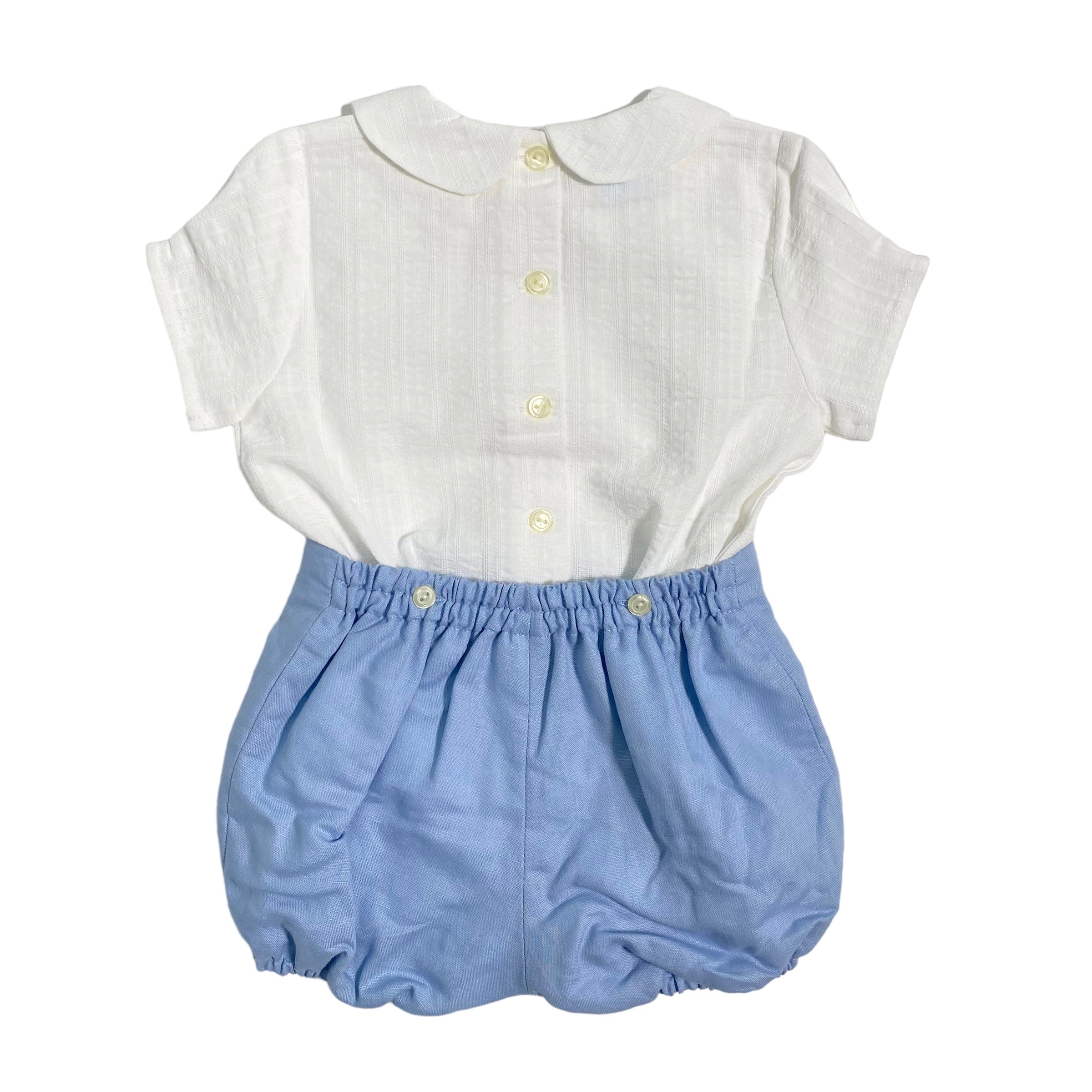 Completo elegante composto da camicia mezza manica in cotone lavorato bianca e bermuda in misto lino celeste con fascia in vita.