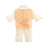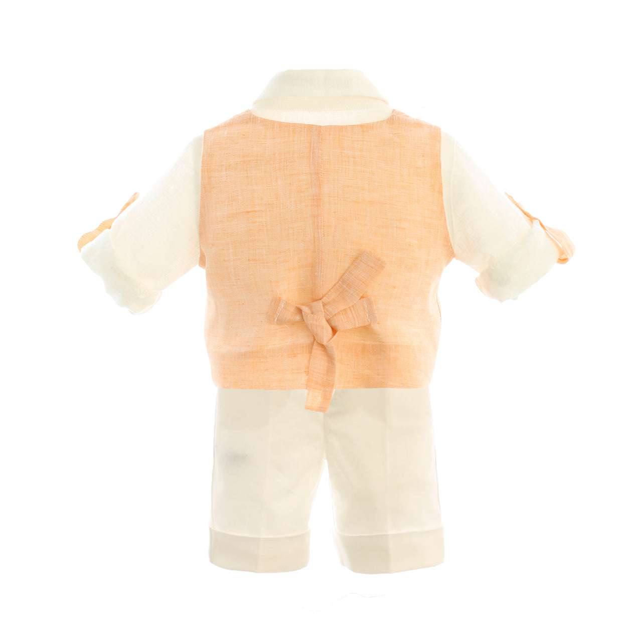 Questo completo elegante per neonati BUFI è perfetto per ogni occasione speciale. Il bermuda bianco con bretelle e risvolto, la camicia in lino con risvolto e il panciotto arancione in lino sono ispirati alla moda italiana e doneranno al tuo bambino un look elegante e raffinato. Completa il look con il papillon in lino arancione per un tocco ancora più chic.