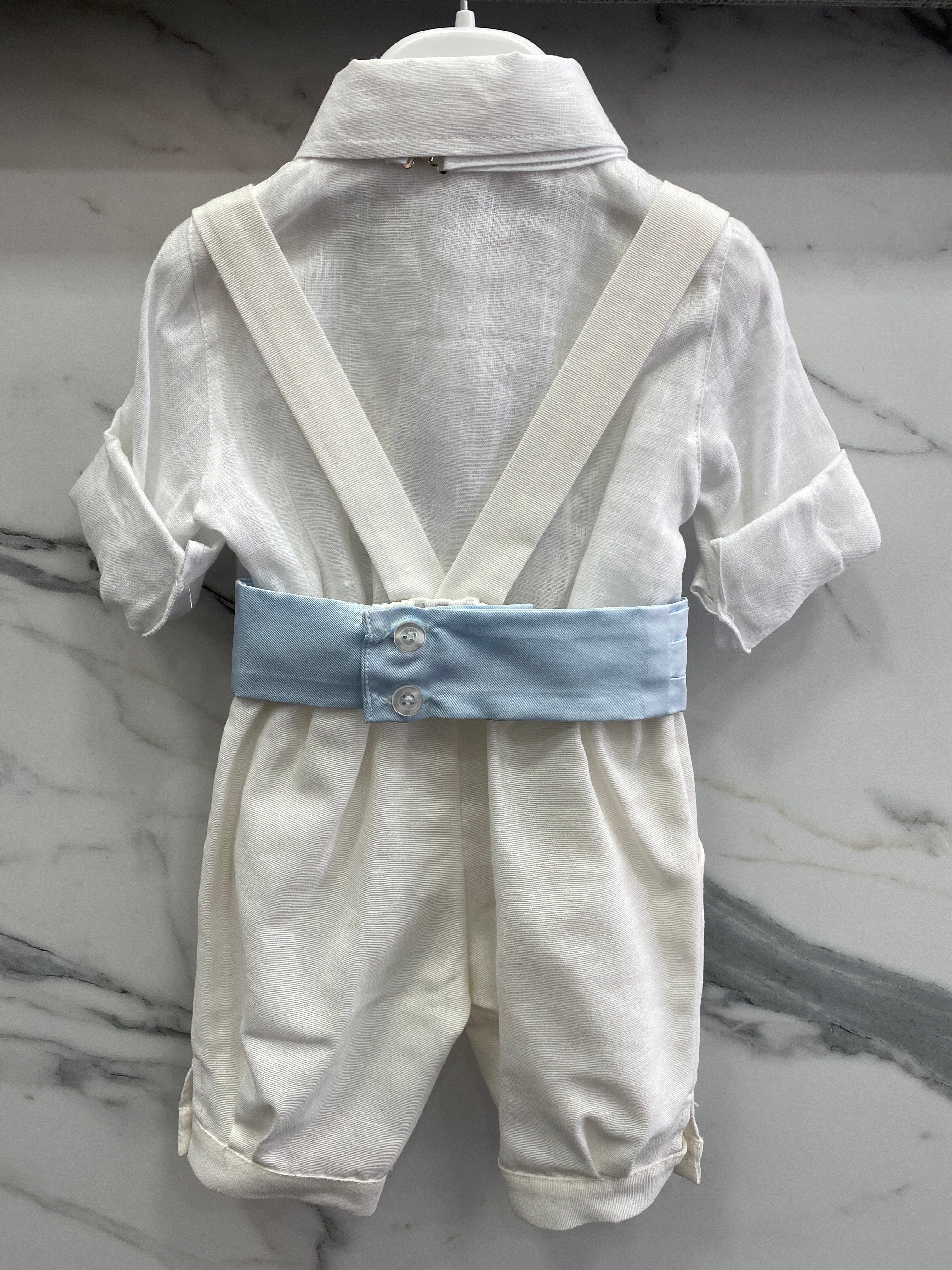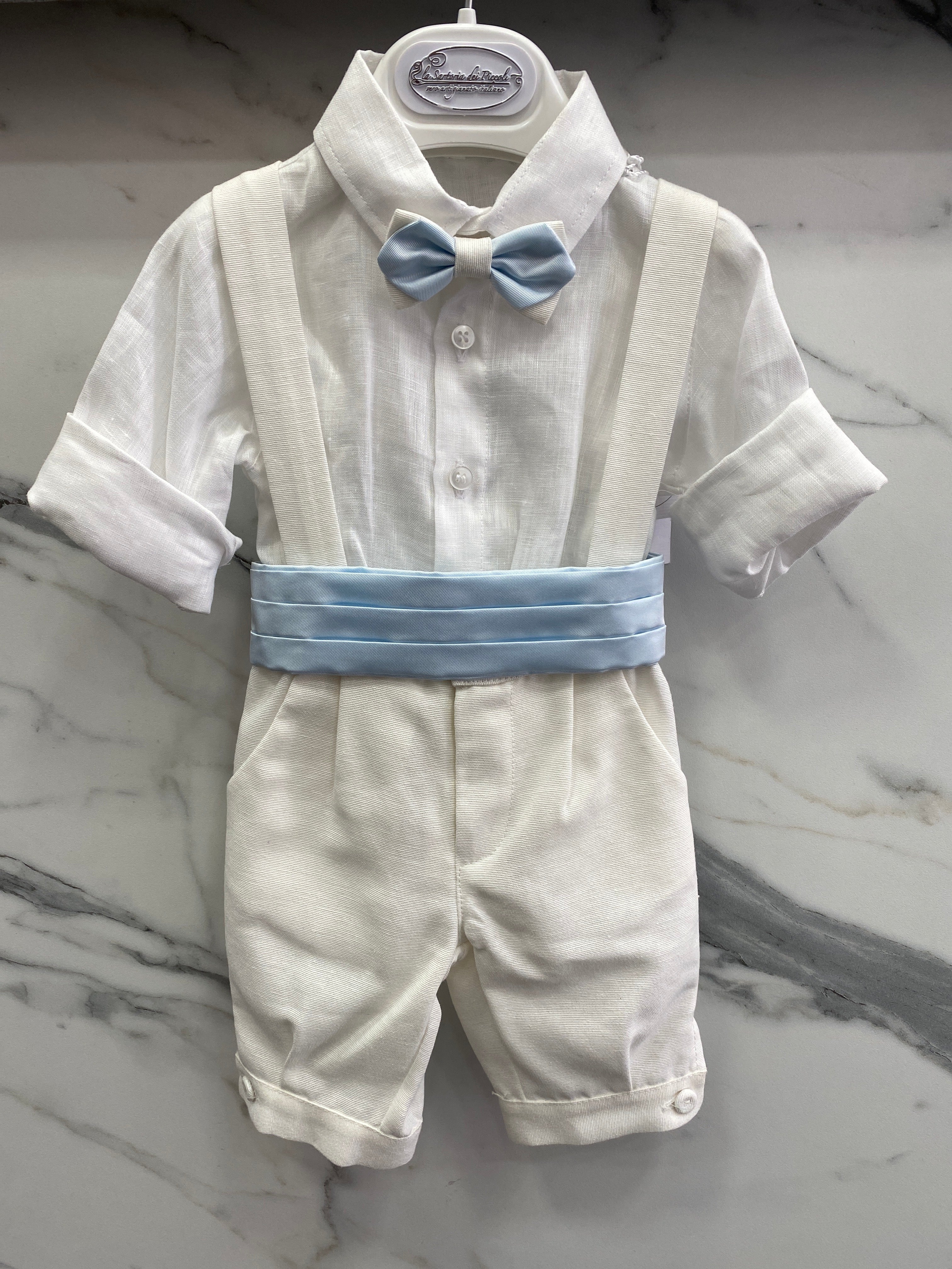 Questo completo elegante, perfetto per neonati, è ideale per occasioni speciali. La camicia in lino è arricchita da una graziosa fascia azzurra in vita e il papillon doppiato aggiunge un tocco di eleganza. Il pantalone alla zuava, realizzato in morbido cotone effetto lino, garantisce il massimo comfort per il tuo piccolo.