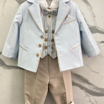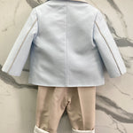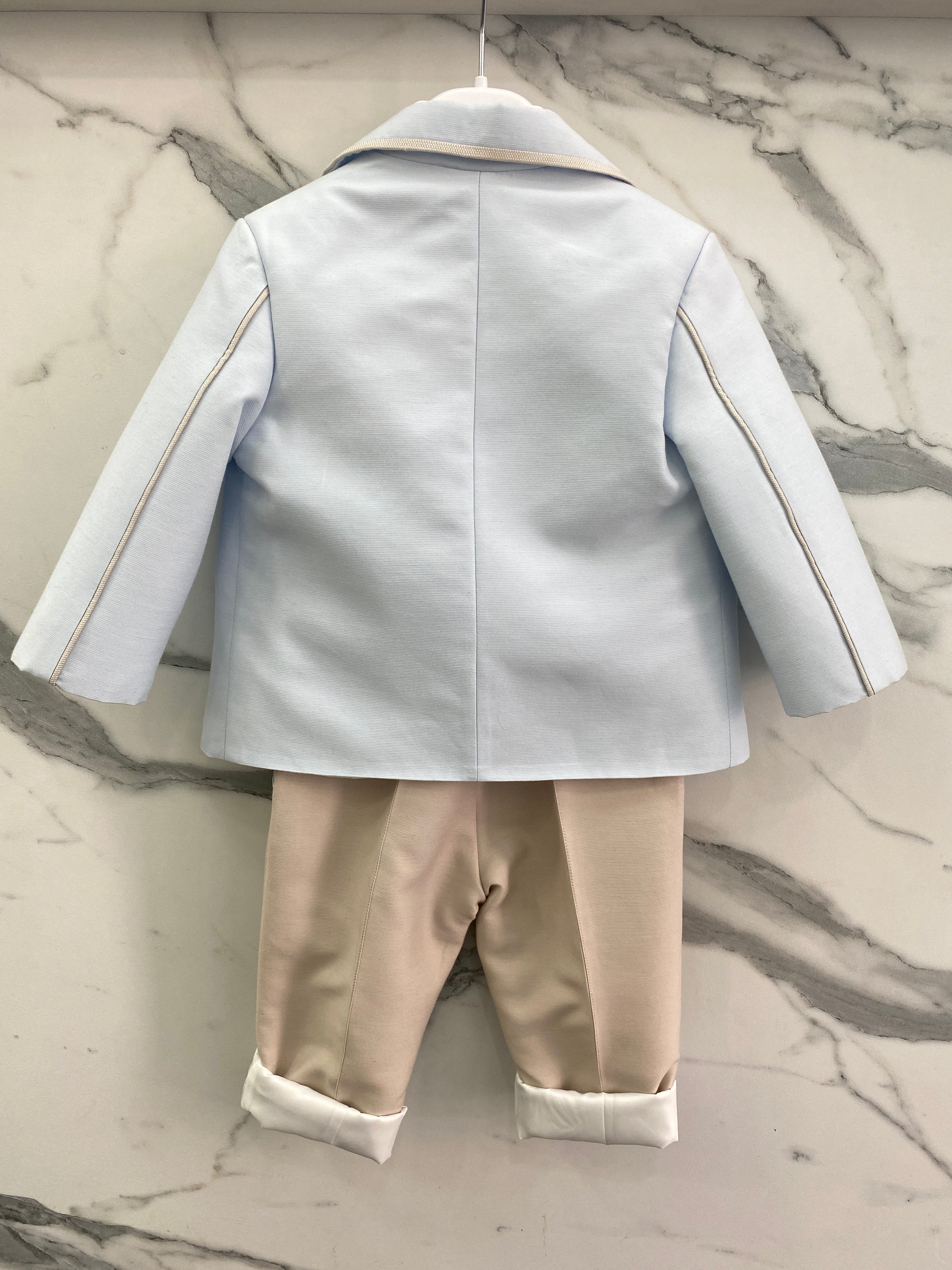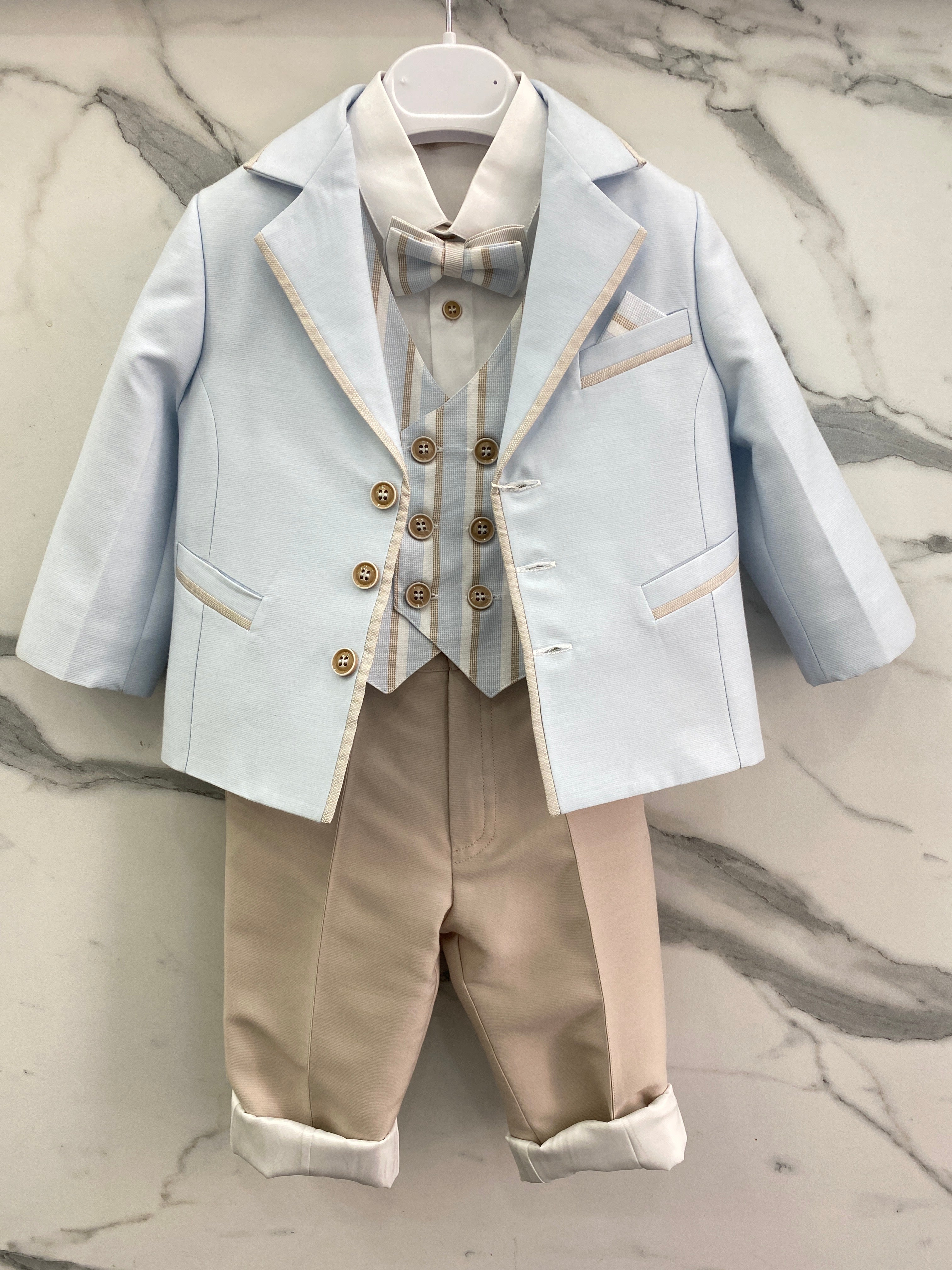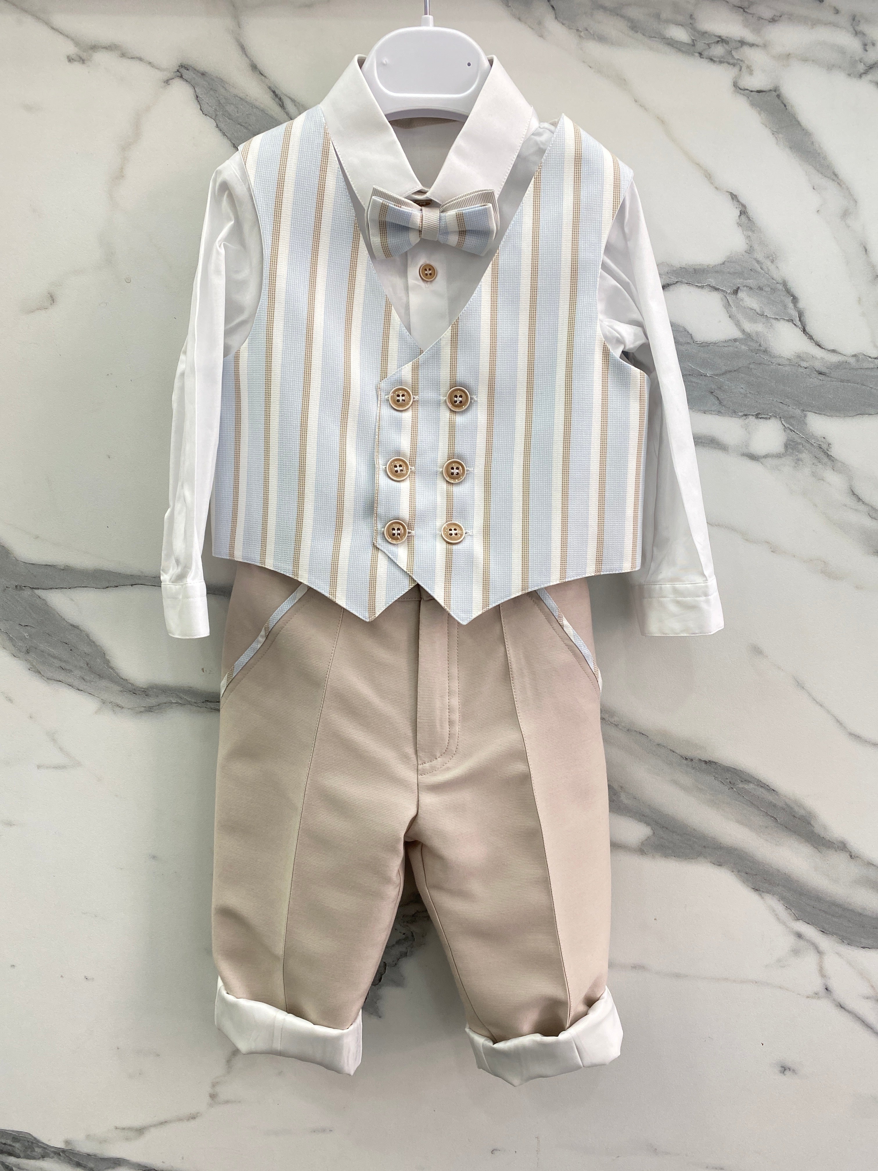 Esalta la tua occasione speciale con il completo elegante in cotone per neonati LES ETOILES MARTIN. Il pantalone lungo con bretelle, camicia bianca tinta unita, giacca con pochette, panciotto a righe e papillon, tutto di alta qualità, garantiranno un look raffinato e di classe per il tuo bambino. Perfetto per ogni occasione importante.