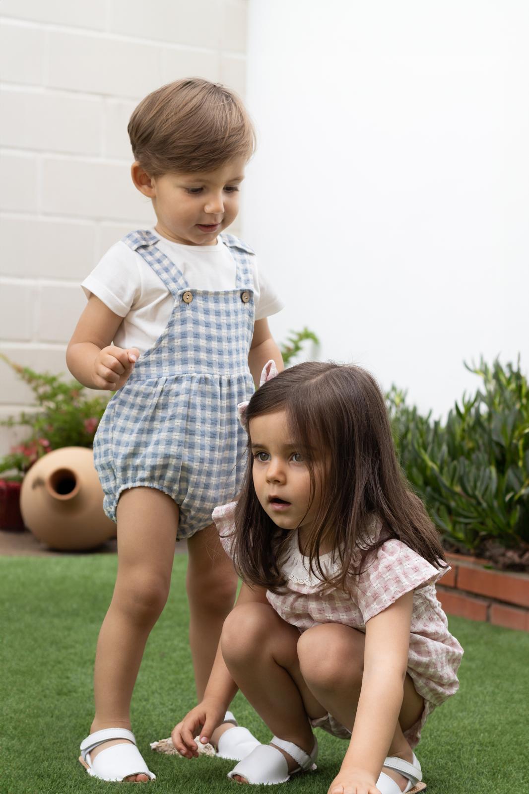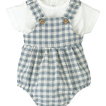 Questo completo in cotone è perfetto per il tuo neonato, maglia mezza manica in cotone panna presenta dettagli sulla spalla, mentre il pagliaccetto a quadretti celeste e panna ha bottoni in legno. Stile e comfort per il tuo piccolo con questo completo di alta qualità.