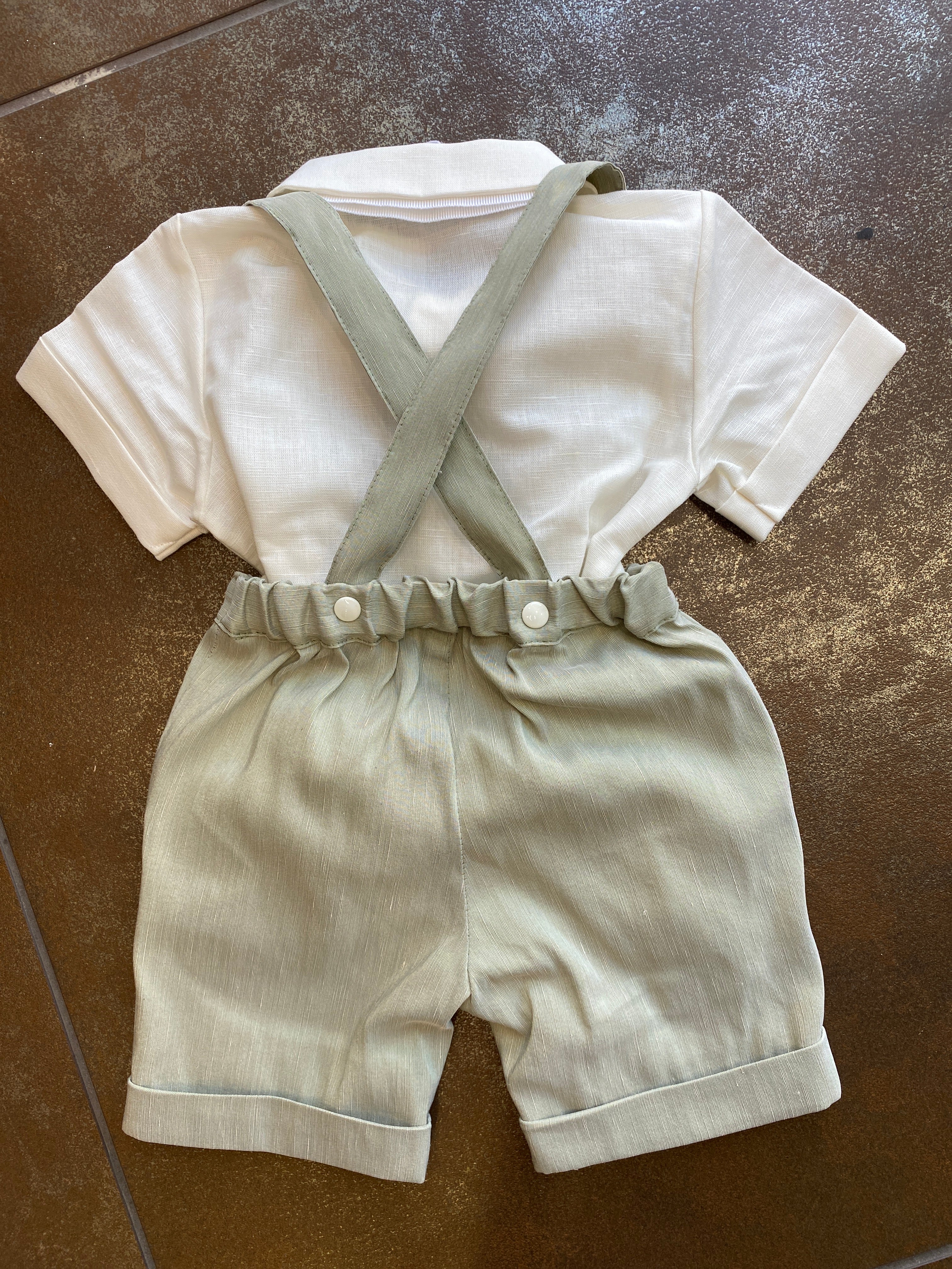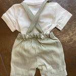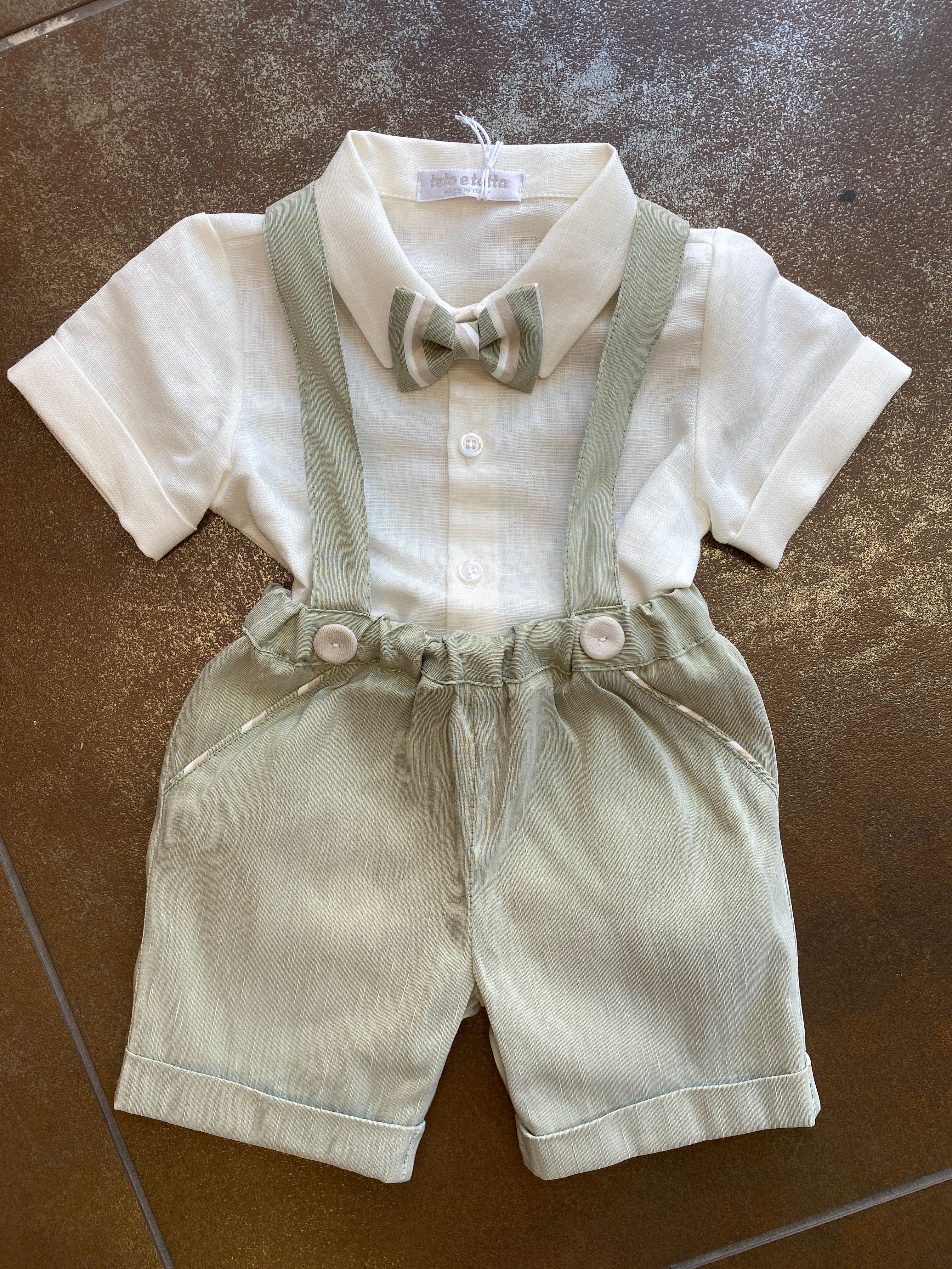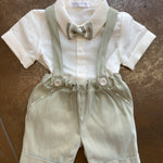 Questo completo in misto lino è perfetto per il tuo neonato. Composto da una camicia a body mezza manica in colore panna e un bermuda con bretelle elastiche in vita, entrambi in misto lino con bermuda con un bellissimo effetto fiammato verde militare. Inoltre, il papillon con fantasia a righe completa l'outfit con stile e comfort. Perfetto per ogni occasione estiva!