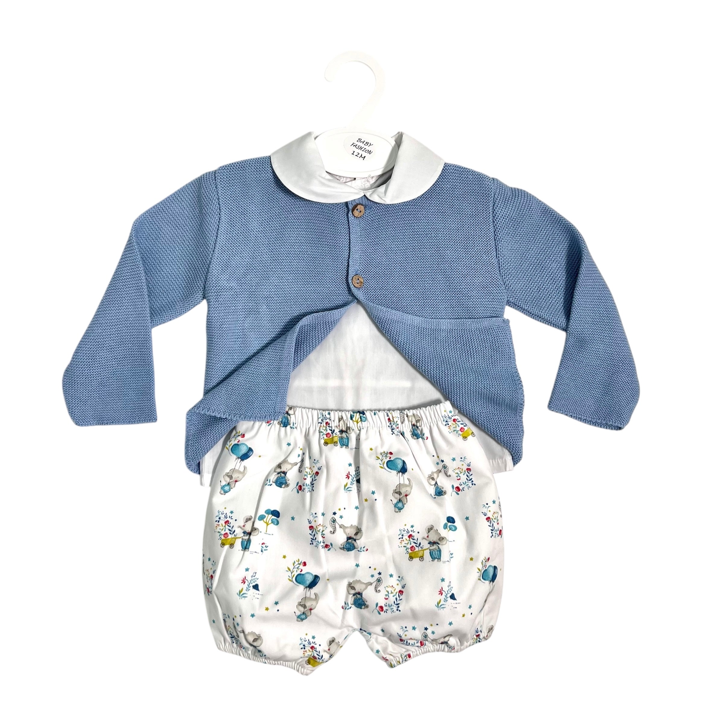 Questo completo tre pezzi BABY FASHION è perfetto per il tuo neonato. Il pantaloncino stampato con elefantini e la camicia in cotone con collo tondo sono casual e alla moda. Il cardigan abbinato aggiunge eleganza. Realizzato in morbido cotone, è comodo e resistente.